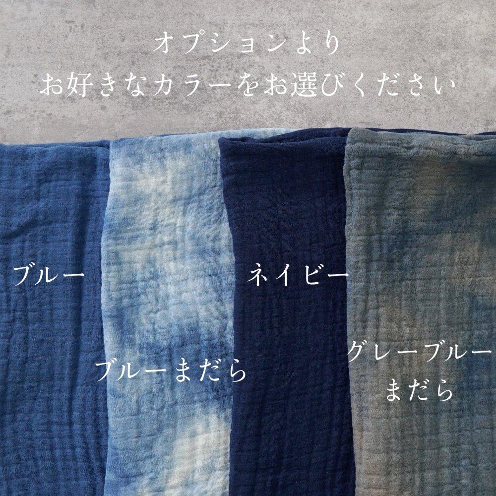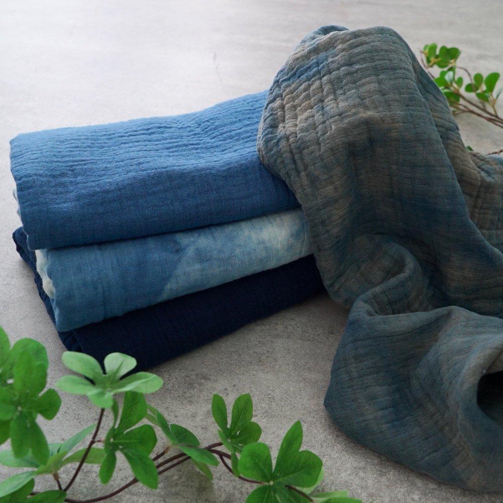 ↓ 染色] UZUiRO / 靛藍染色(印度靛藍)、柿單寧染色 [尺寸] 每張約 123 cm x 65 cm 重量:每張約 210 g [材質] 100%棉 / 三河織布 / 6層紗布 / 愛知縣西尾市吉良町製造 [縫製] 愛知縣西尾市一敷 [關於顏色] 使用植物染料製作柔和的顏色使用植物染料製作柔和的色調。