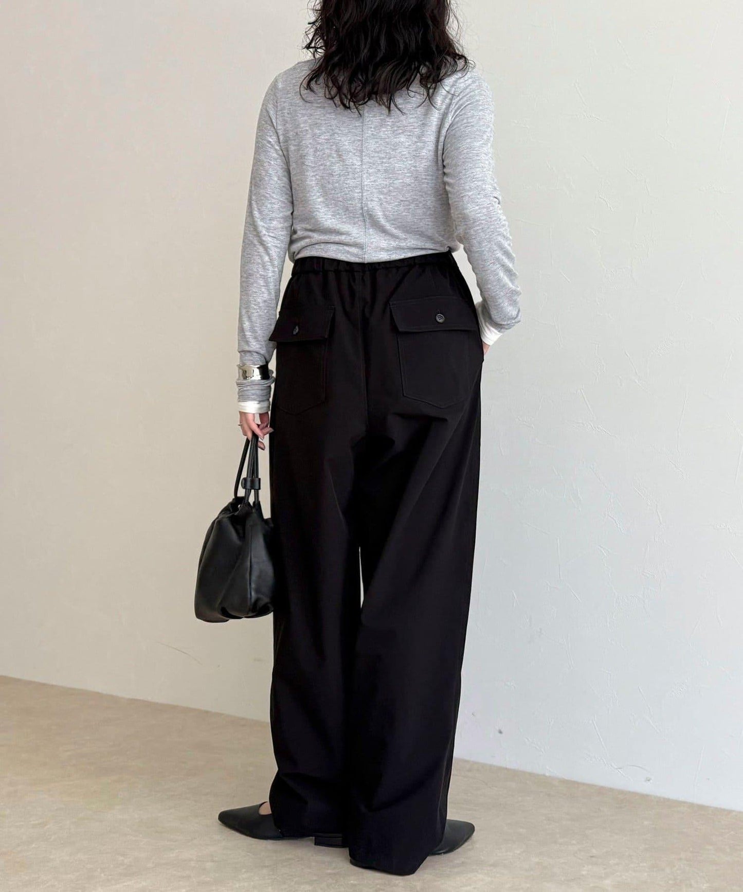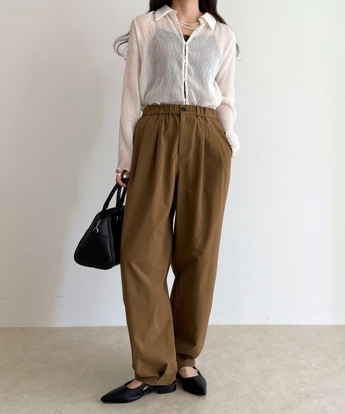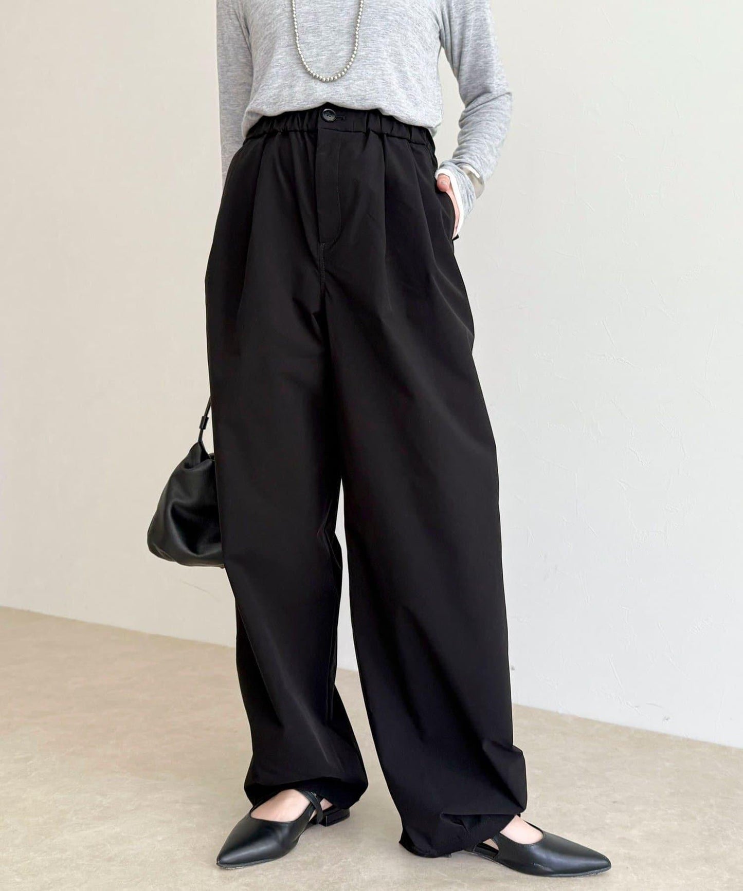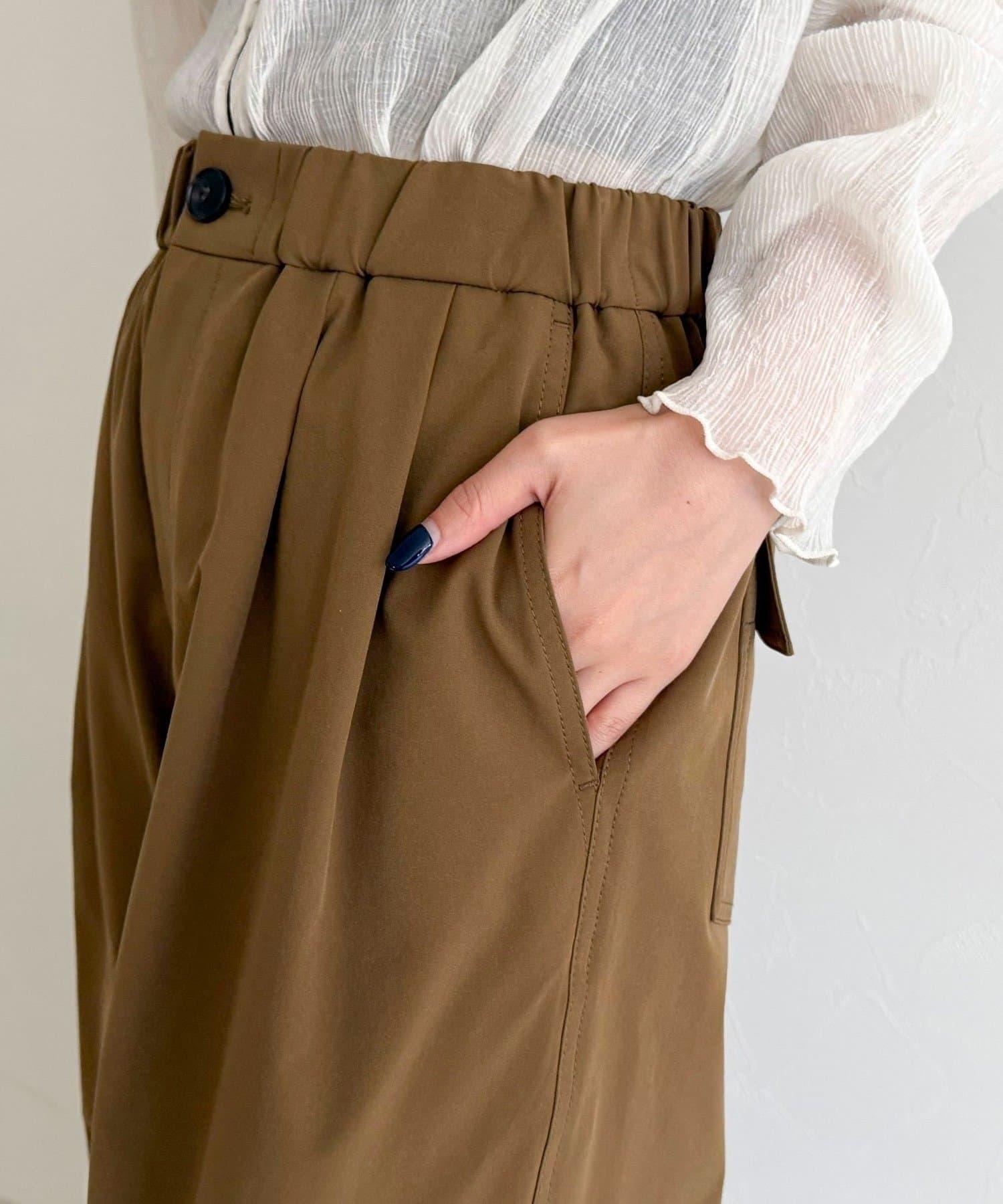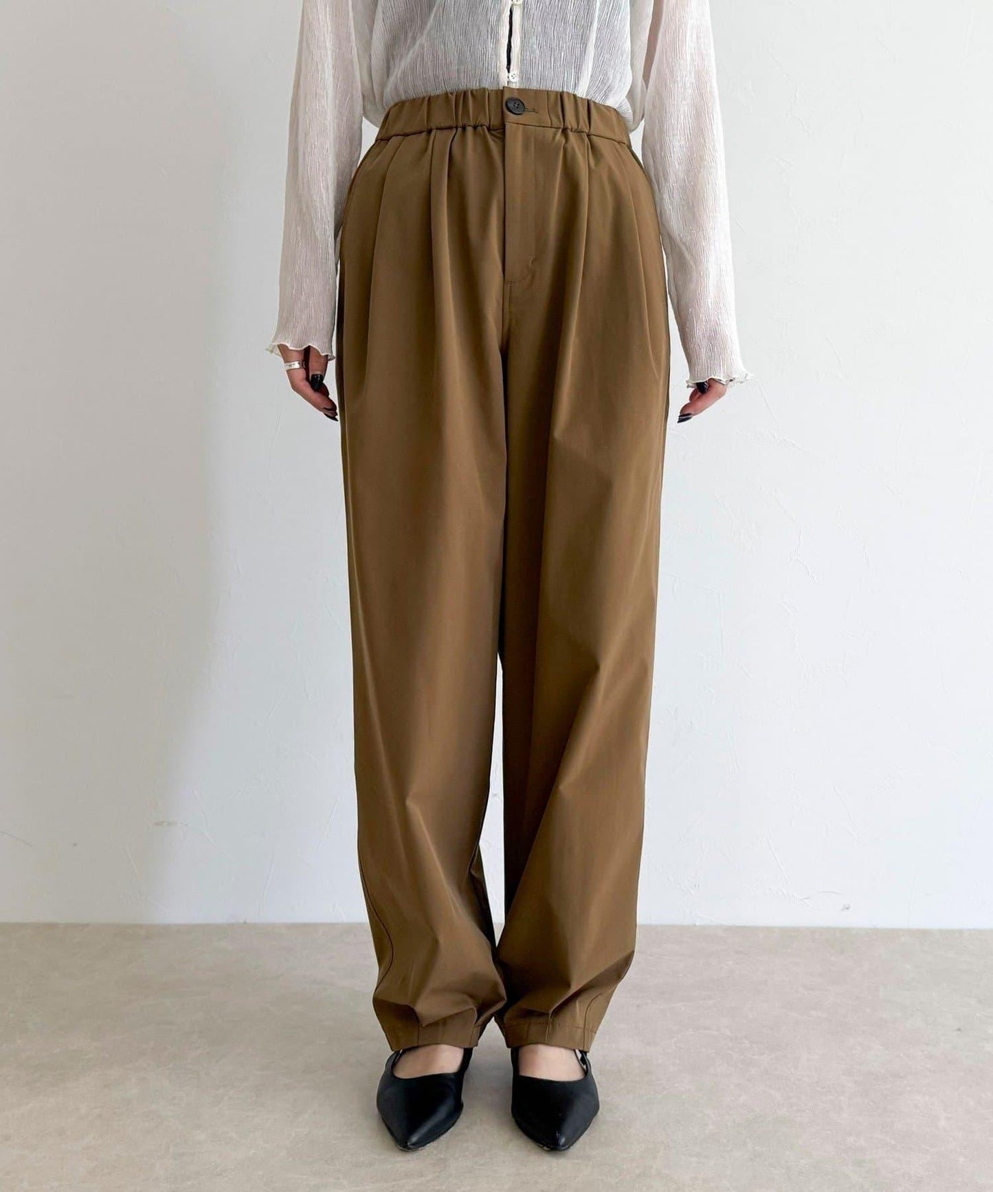 身高 156 厘米/穿 38 號:長度剛好蓋住腳踝,可以搭配平底鞋,平衡感很好!腰部有彈性,穿著方便,但廓形看起來很簡潔,輕鬆完成當下造型◎。