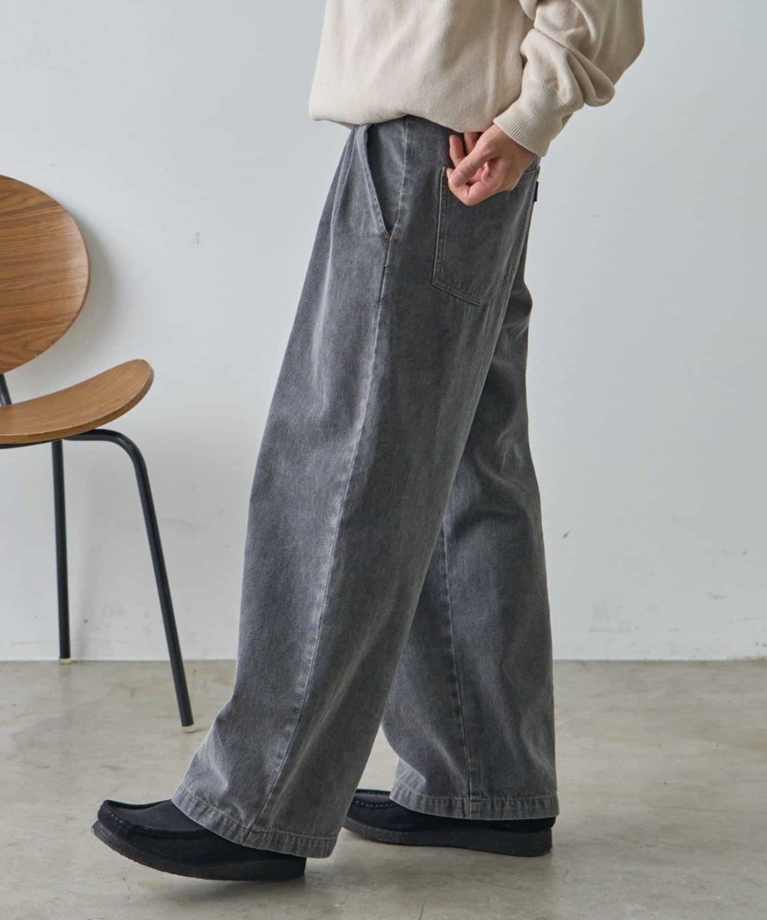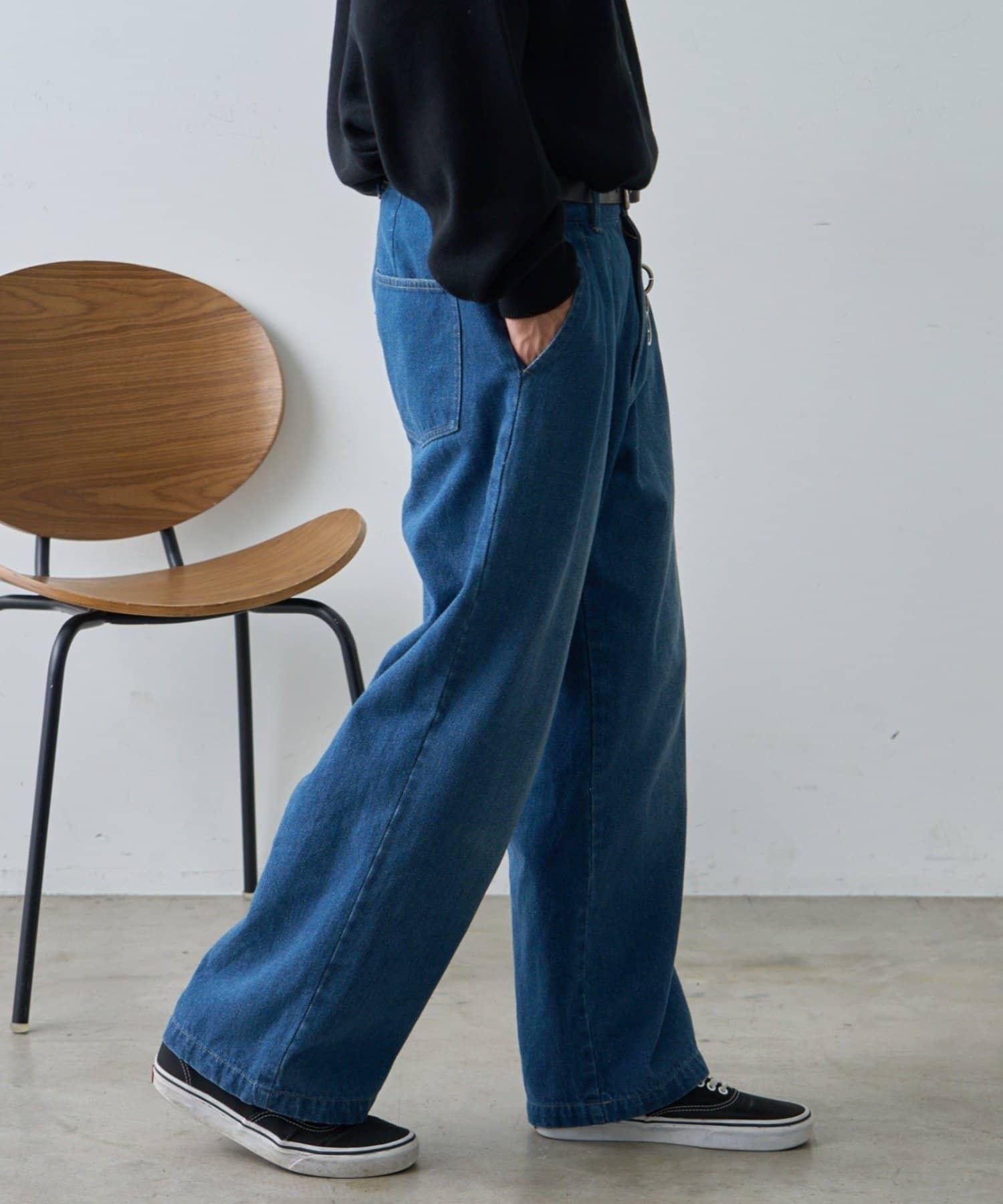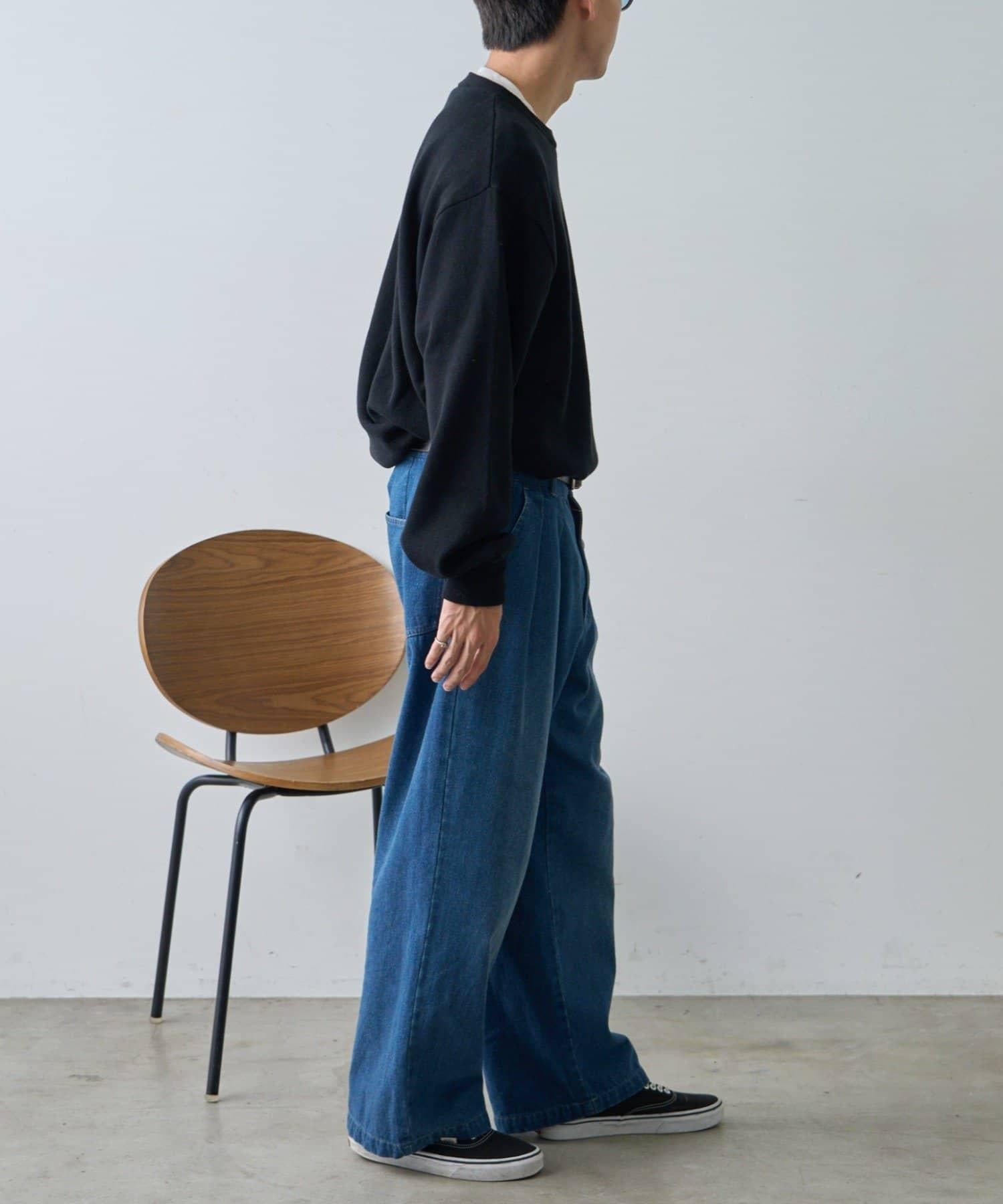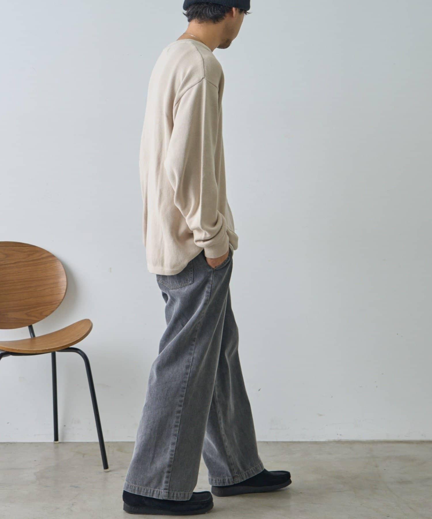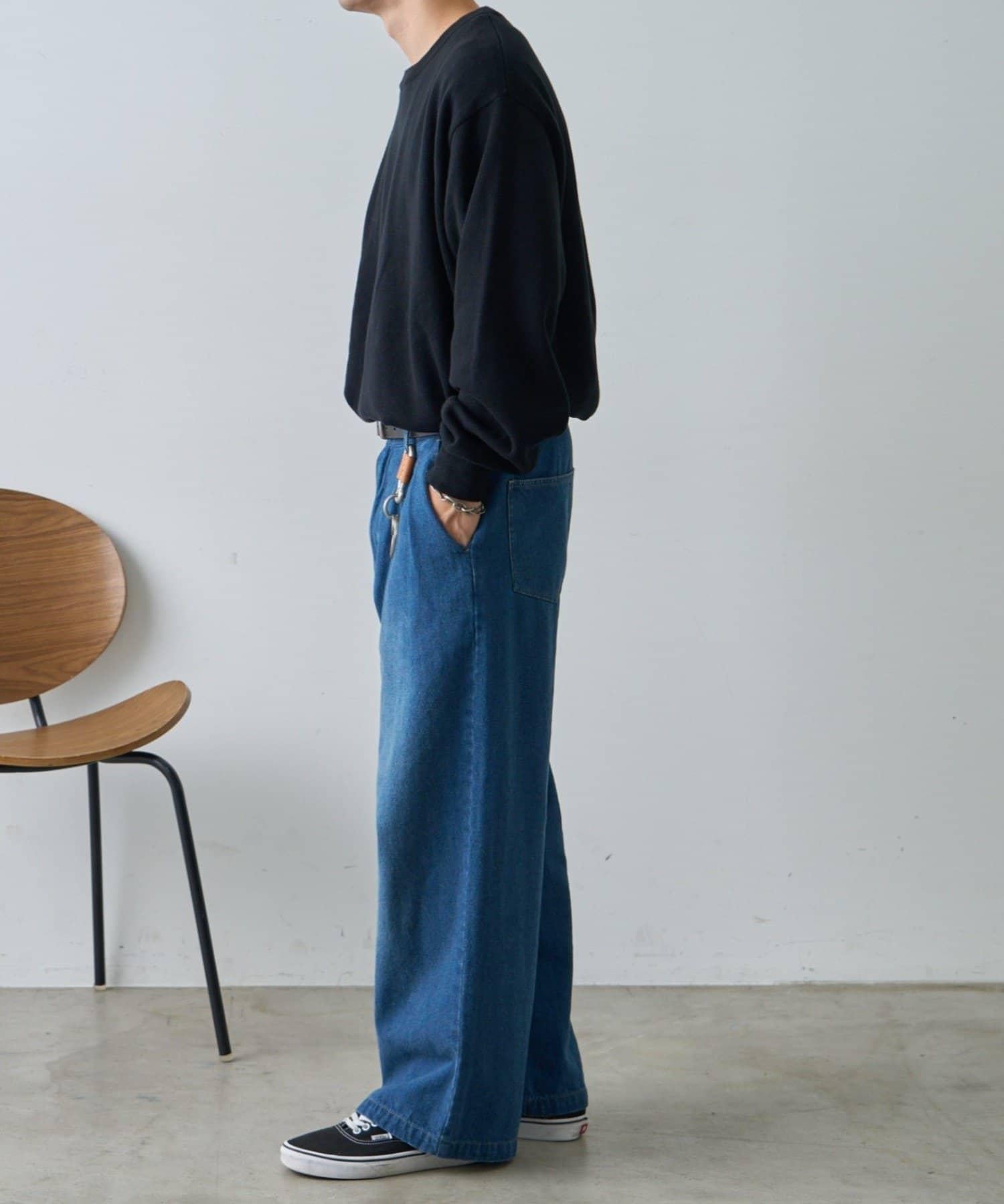 寬褲採用蓬鬆度適中的毛邊牛仔布製成。