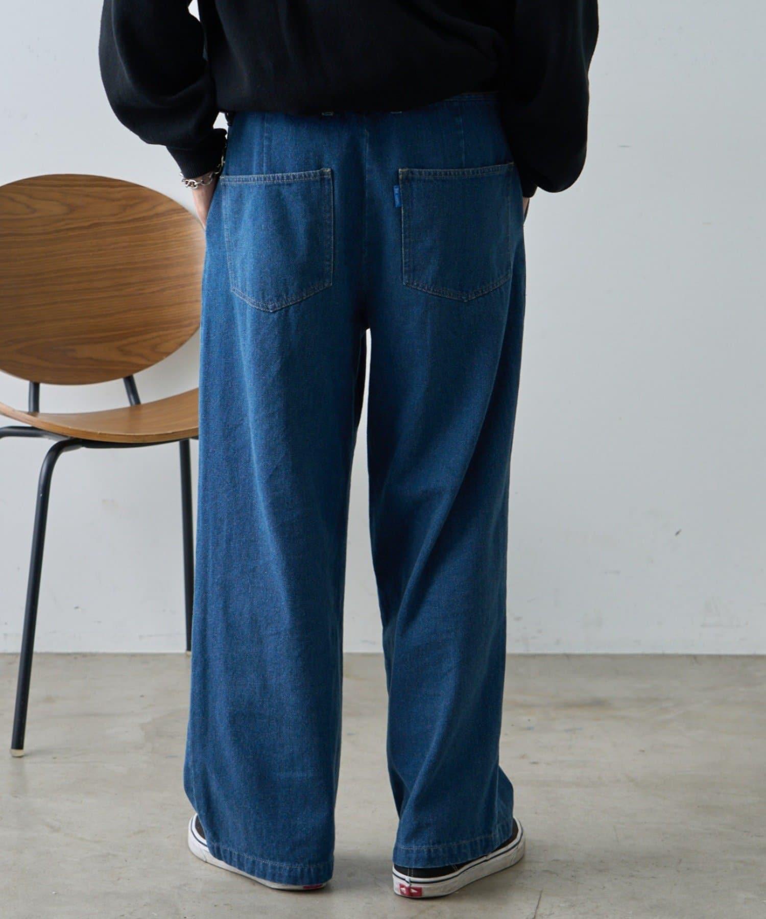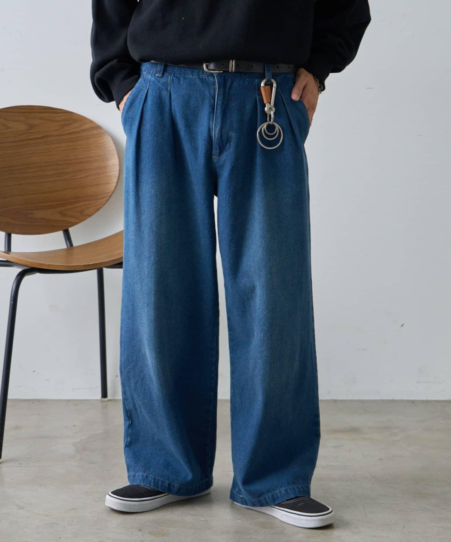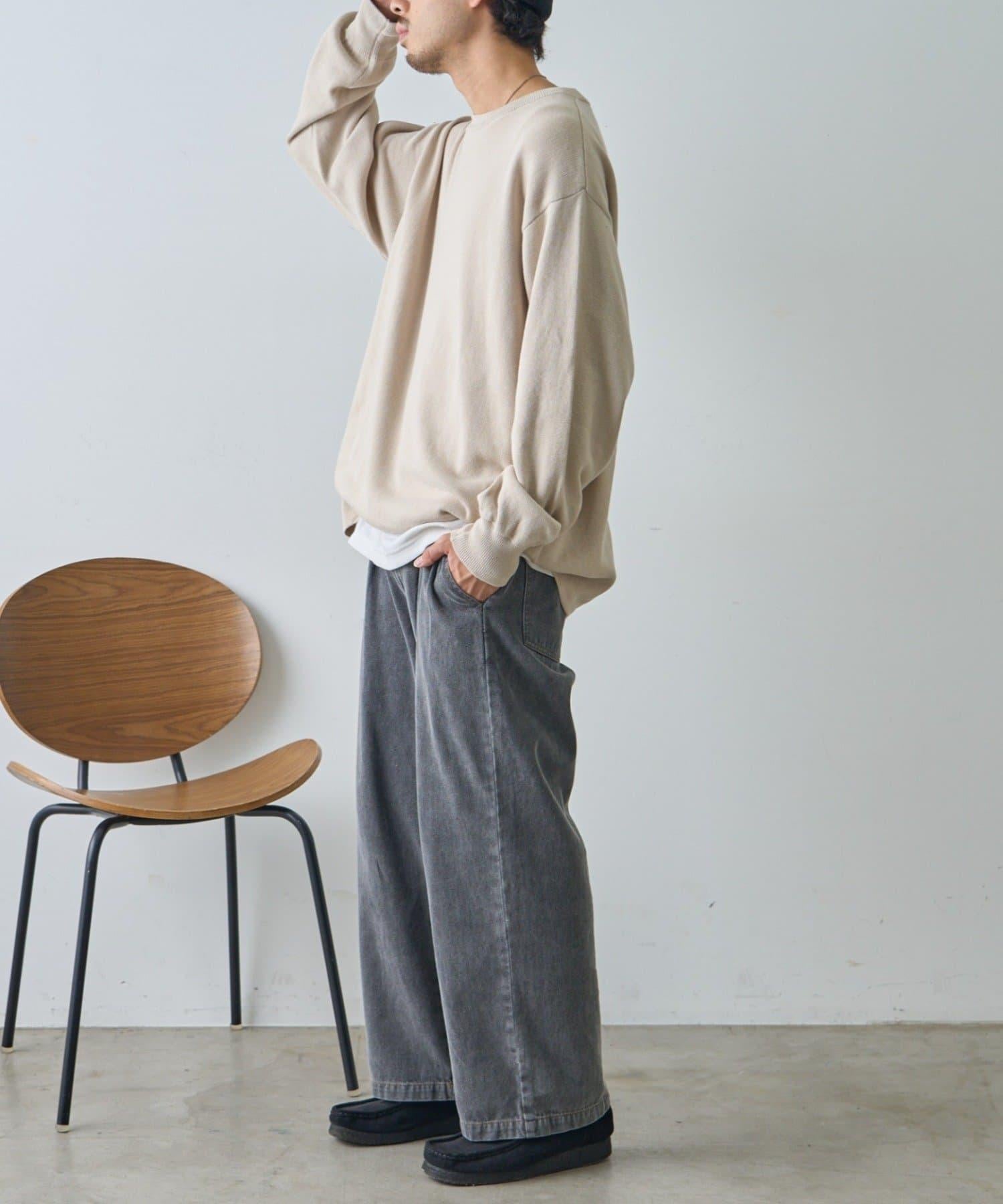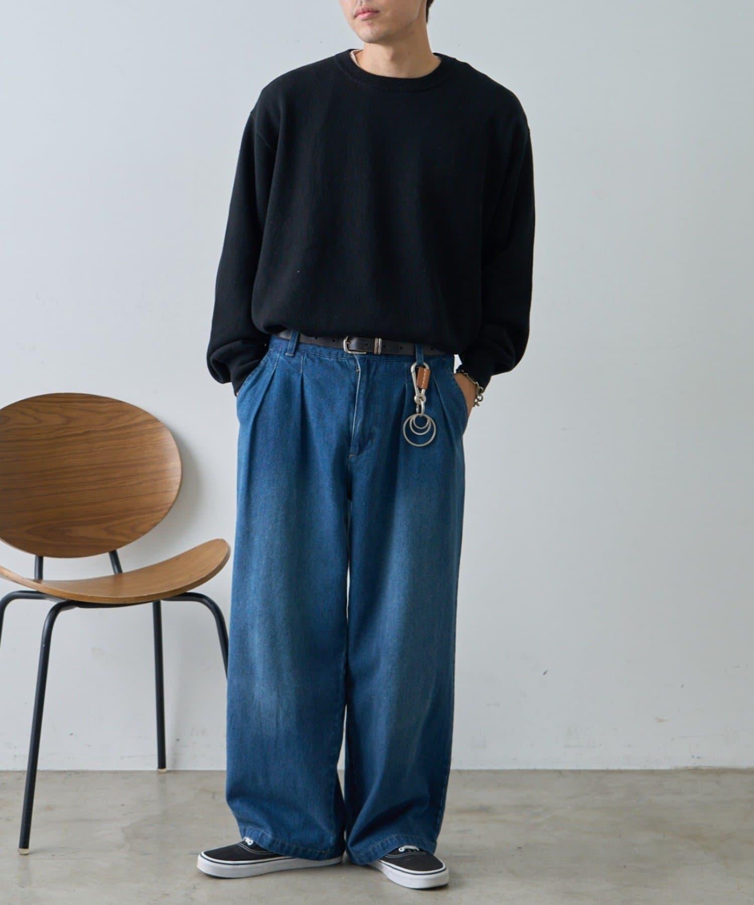 寬褲採用蓬鬆度適中的毛邊牛仔布製成。