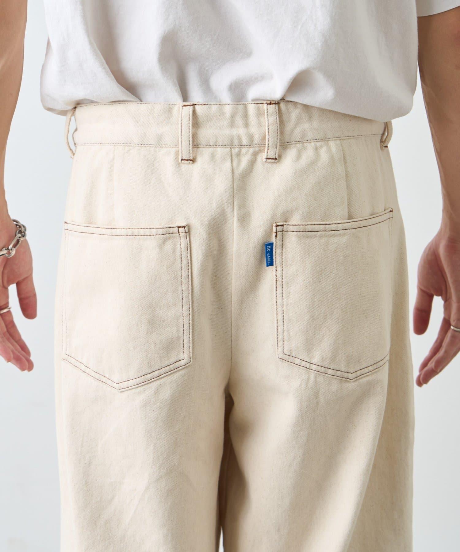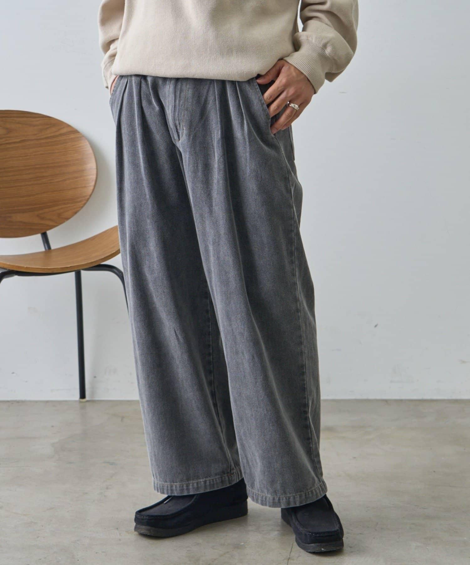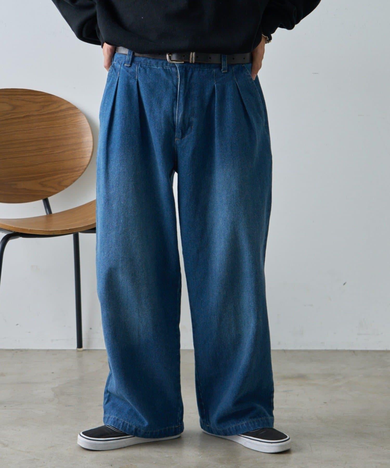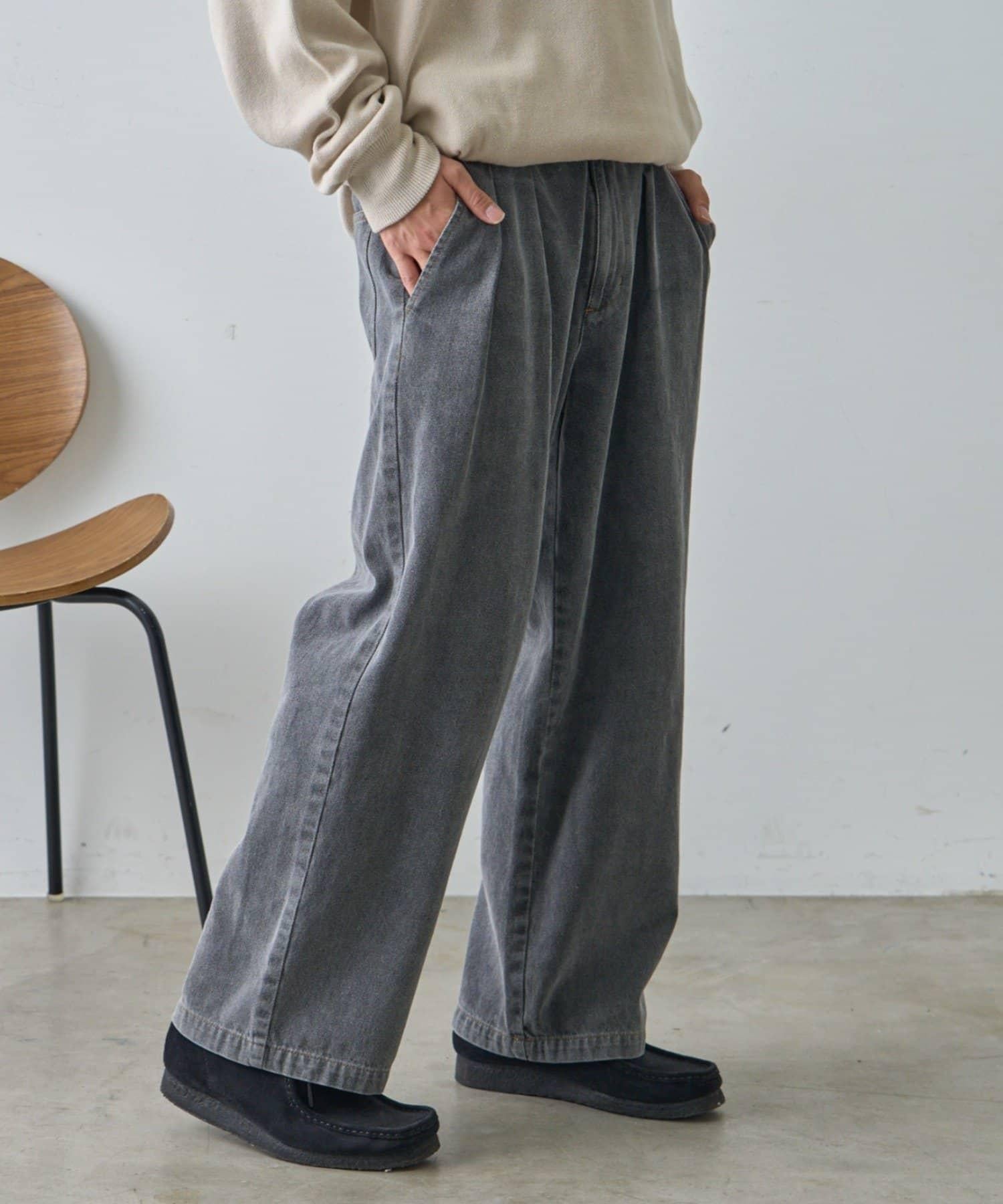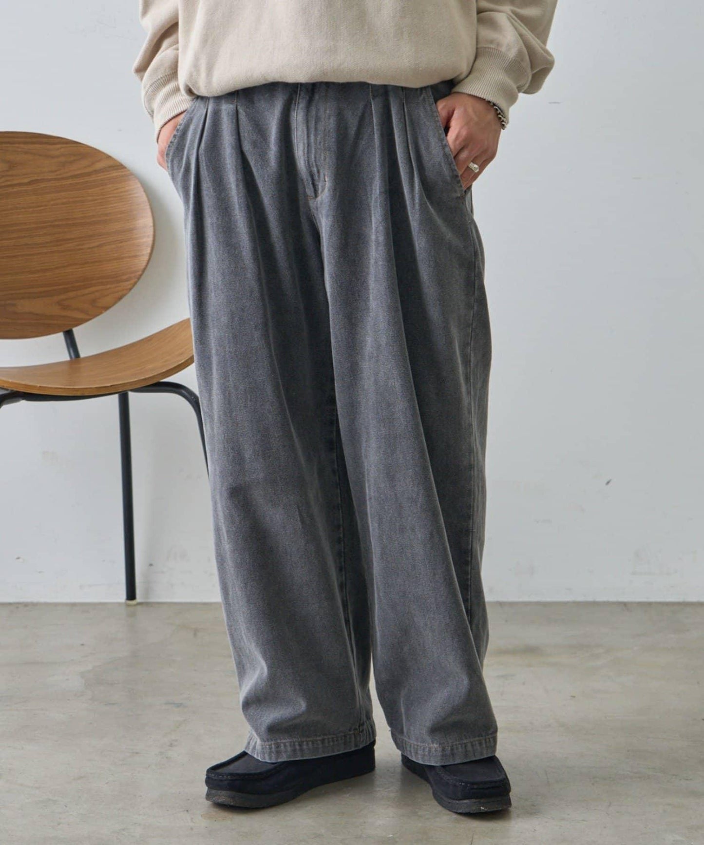 寬褲採用蓬鬆度適中的毛邊牛仔布製成。