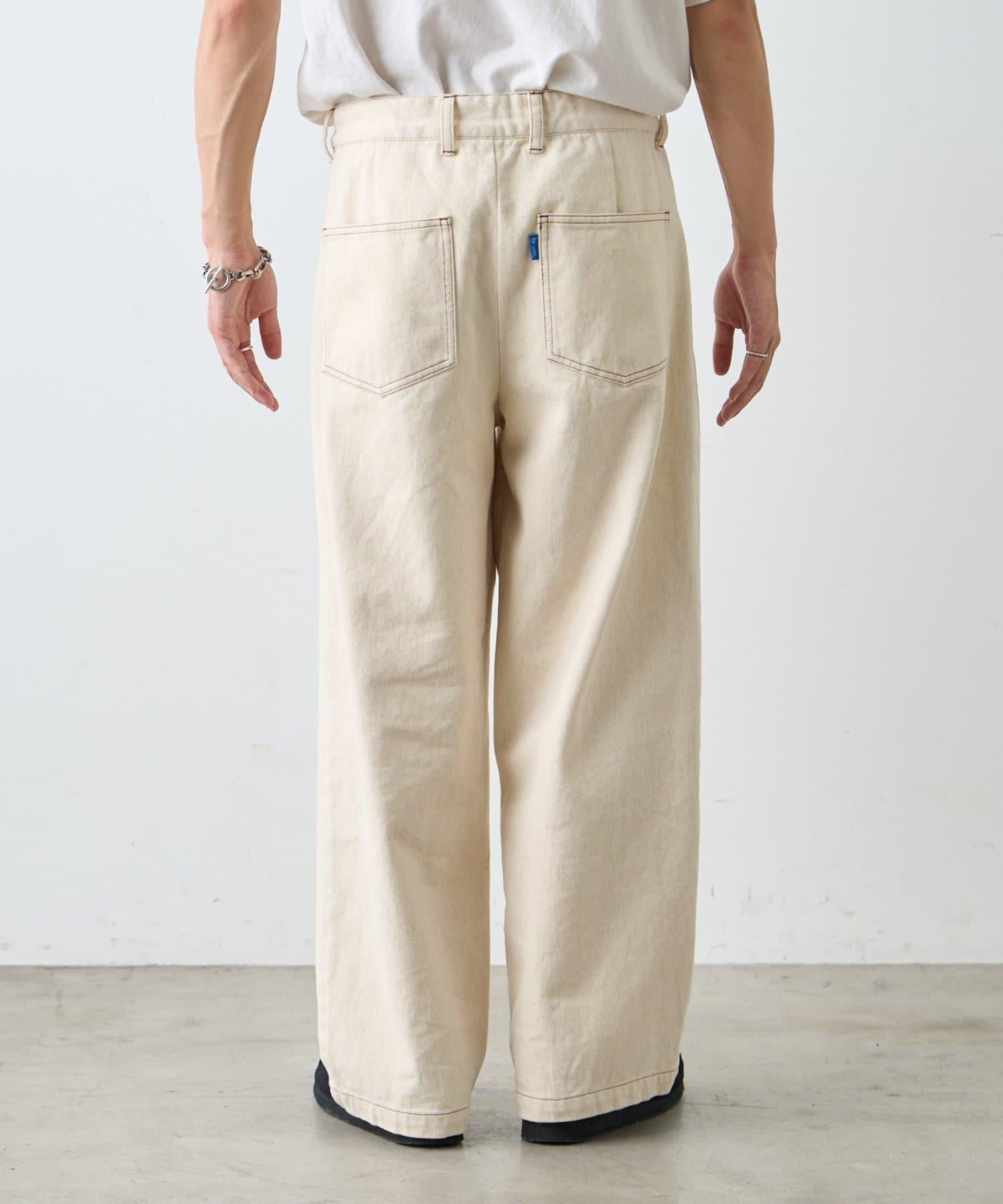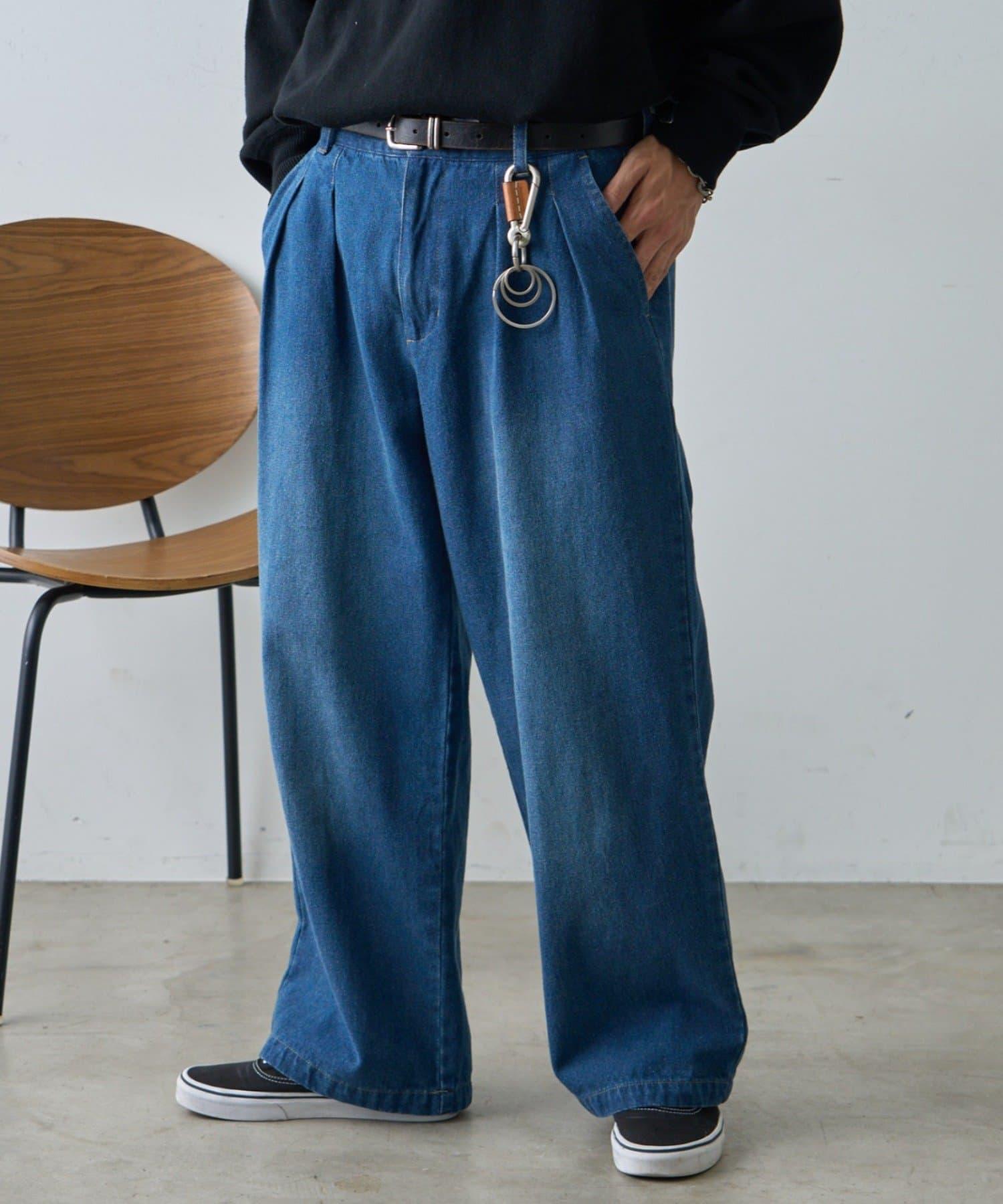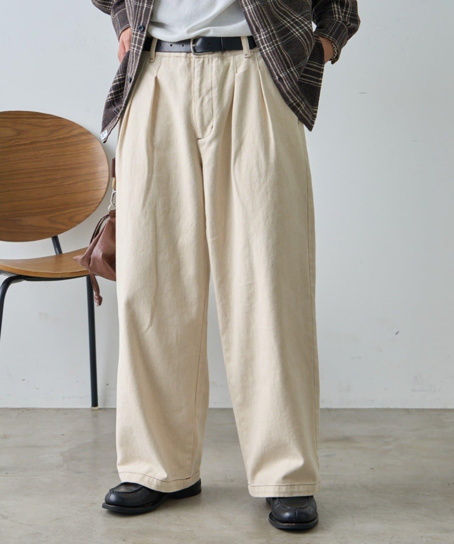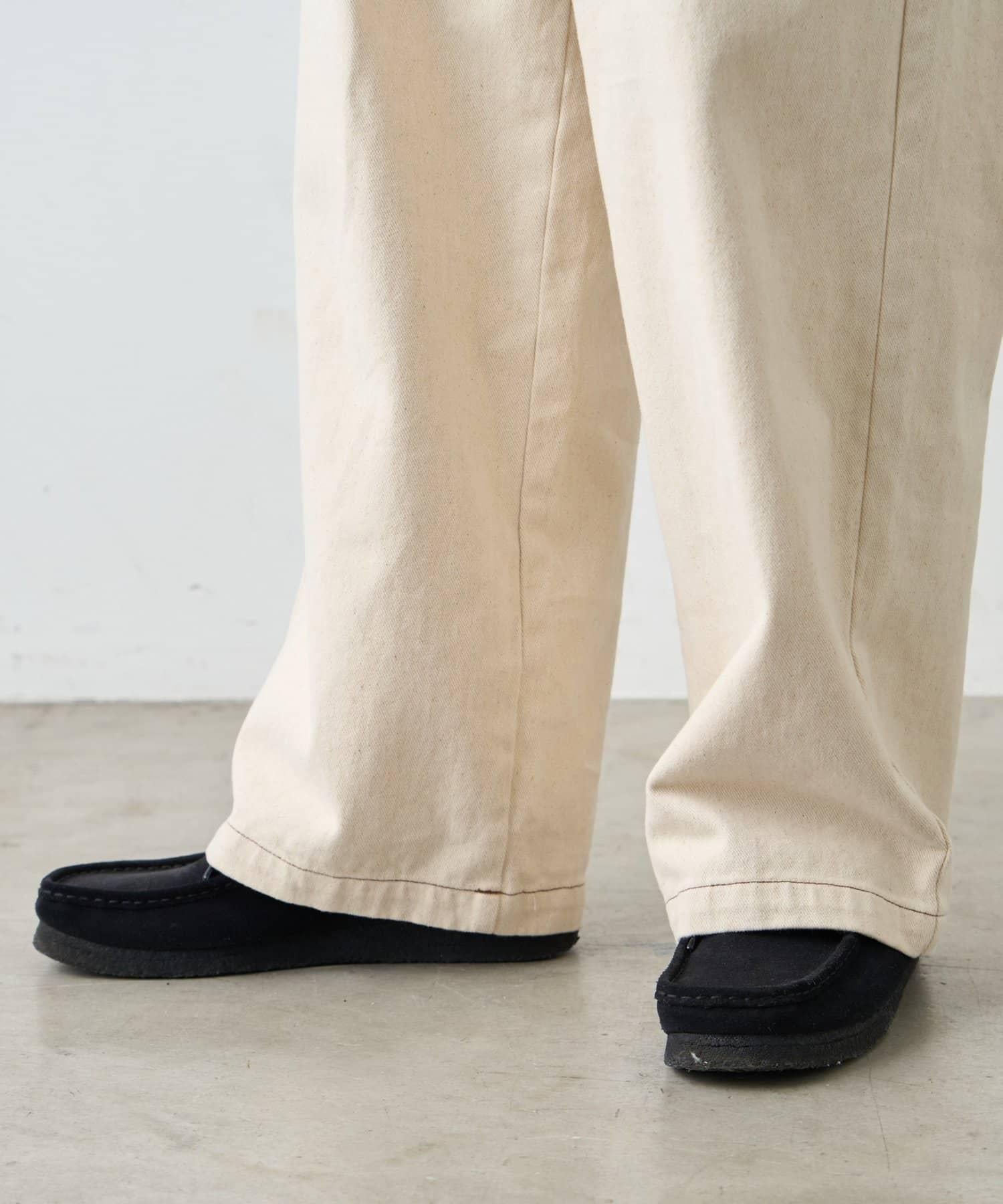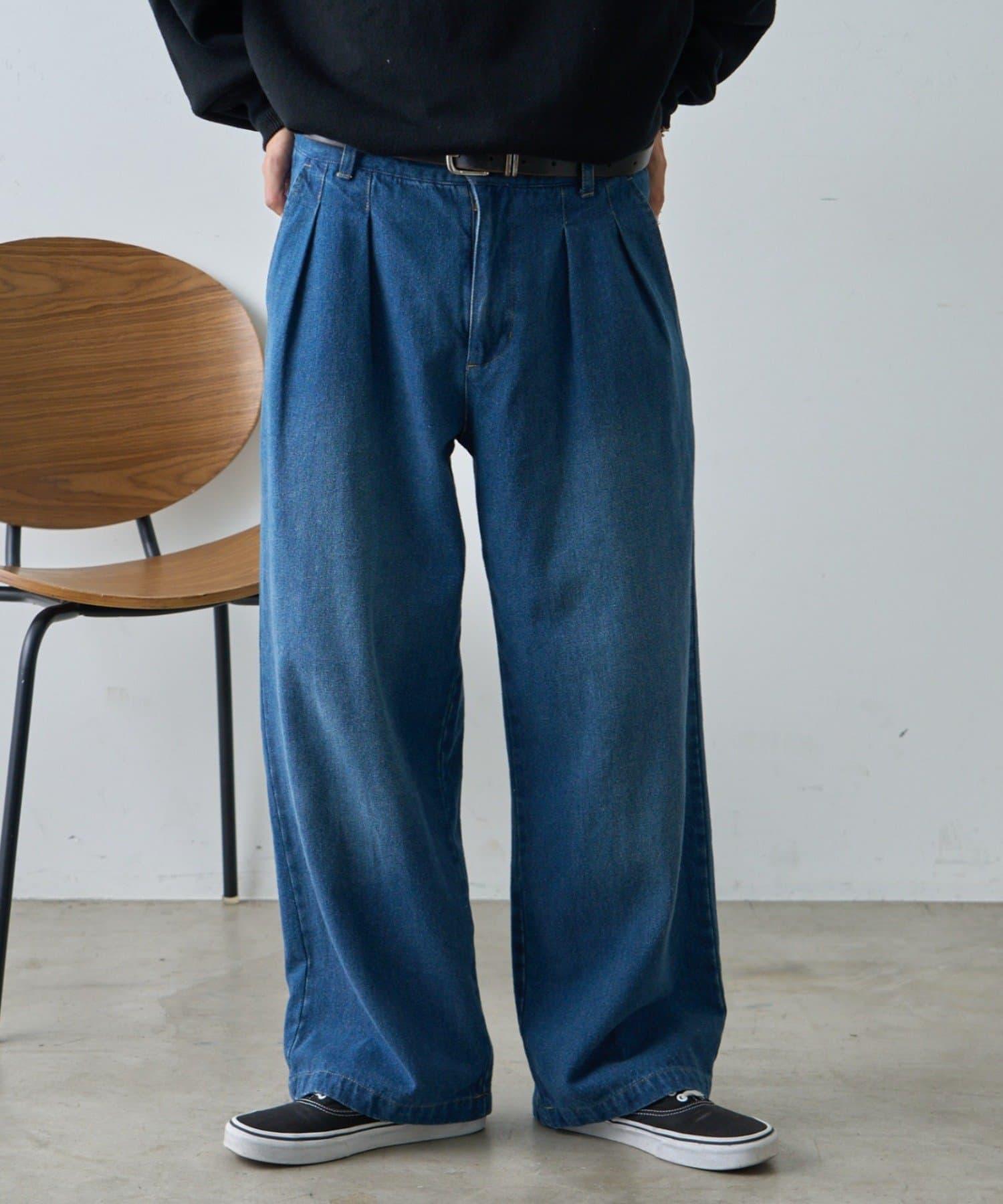 寬褲採用蓬鬆度適中的毛邊牛仔布製成。