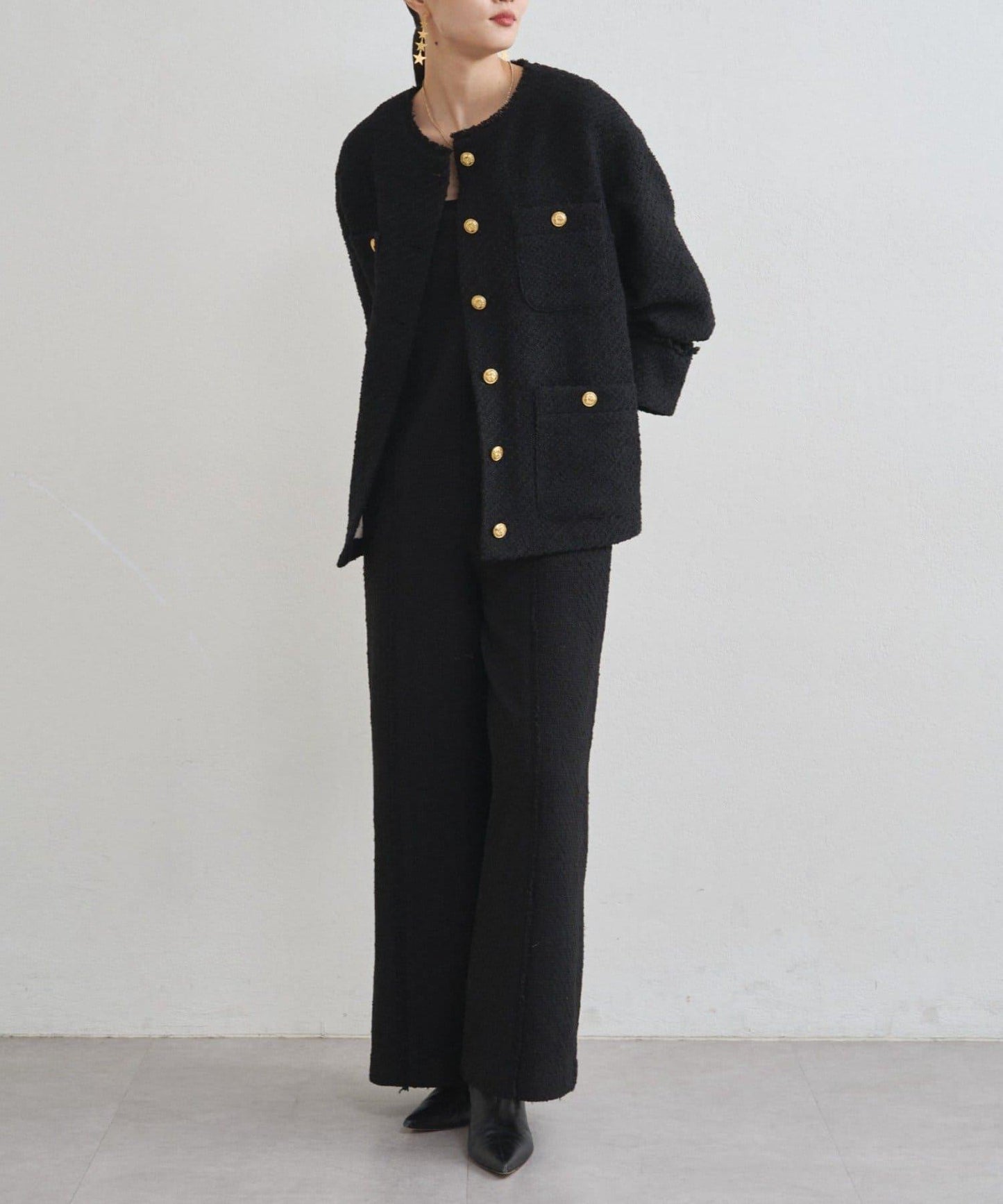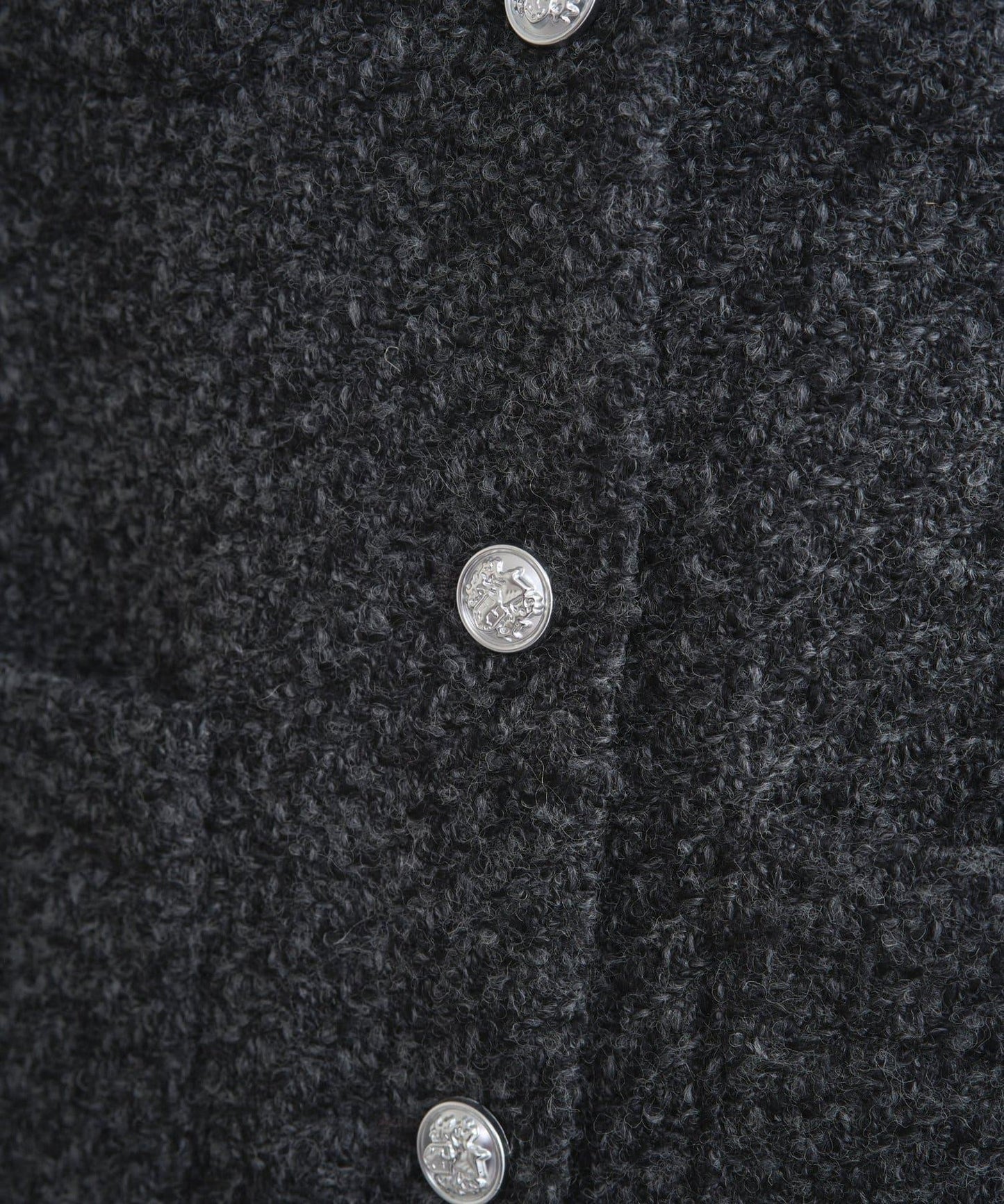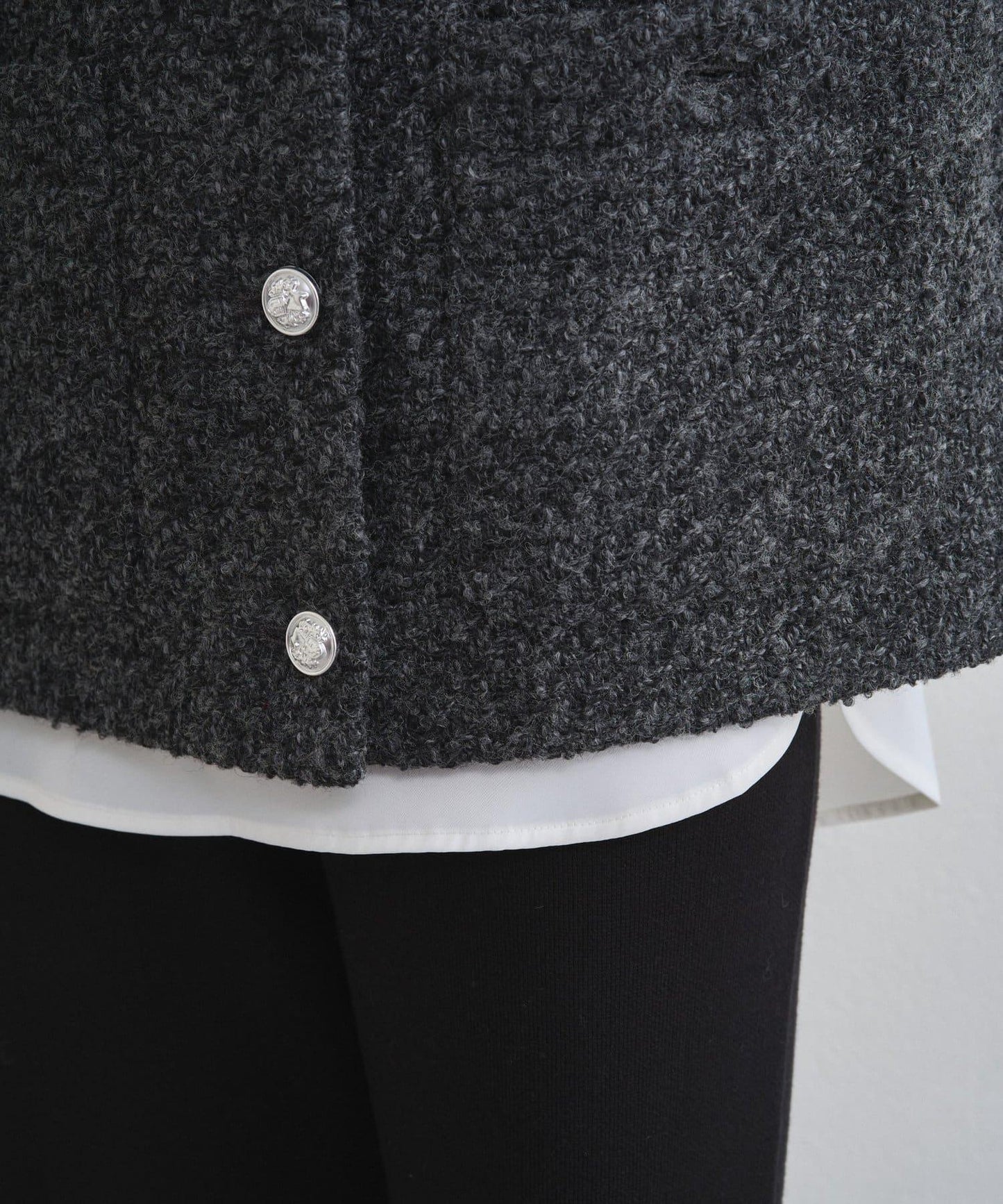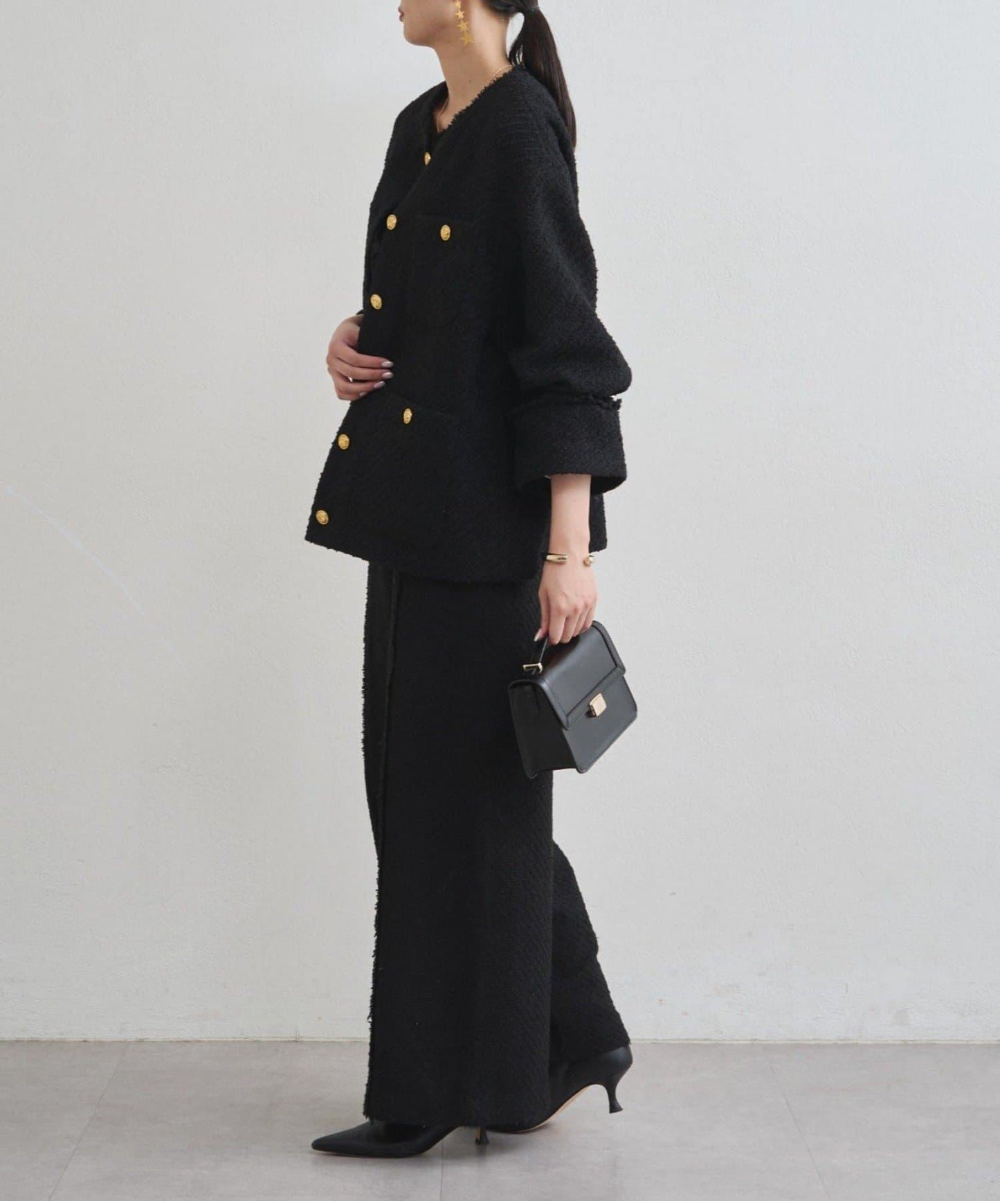 沉穩的斜紋軟呢面料與金色紐扣的結合,凸顯出成熟女性的高雅氣質。