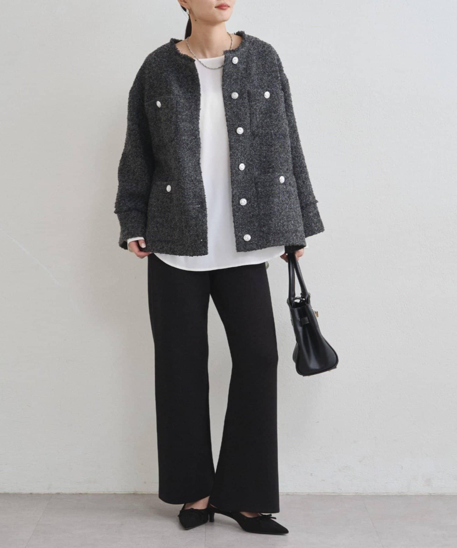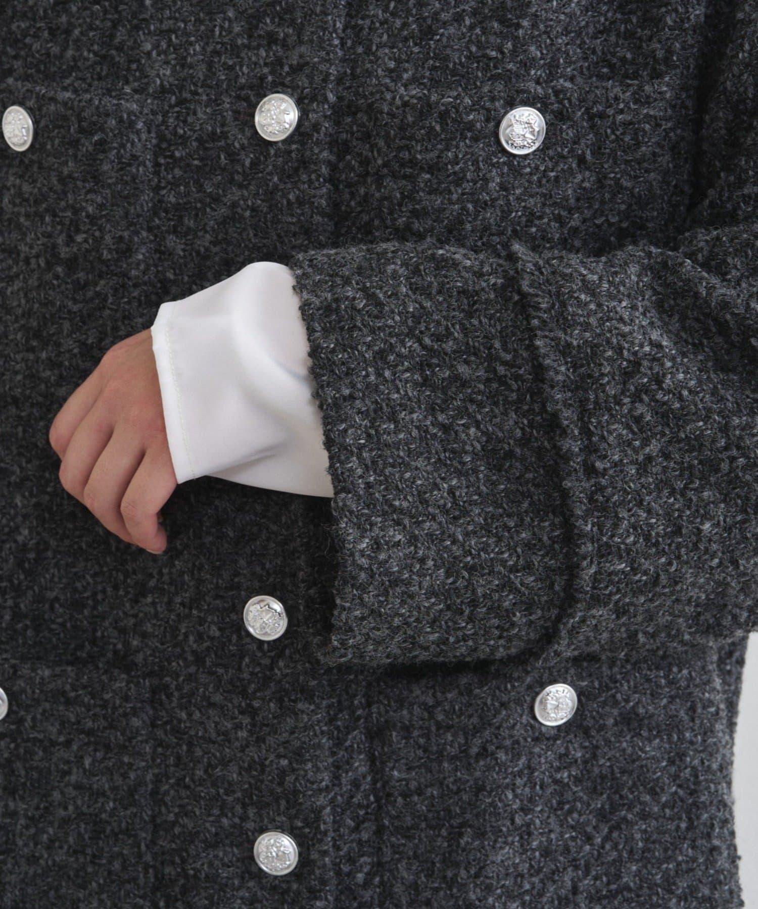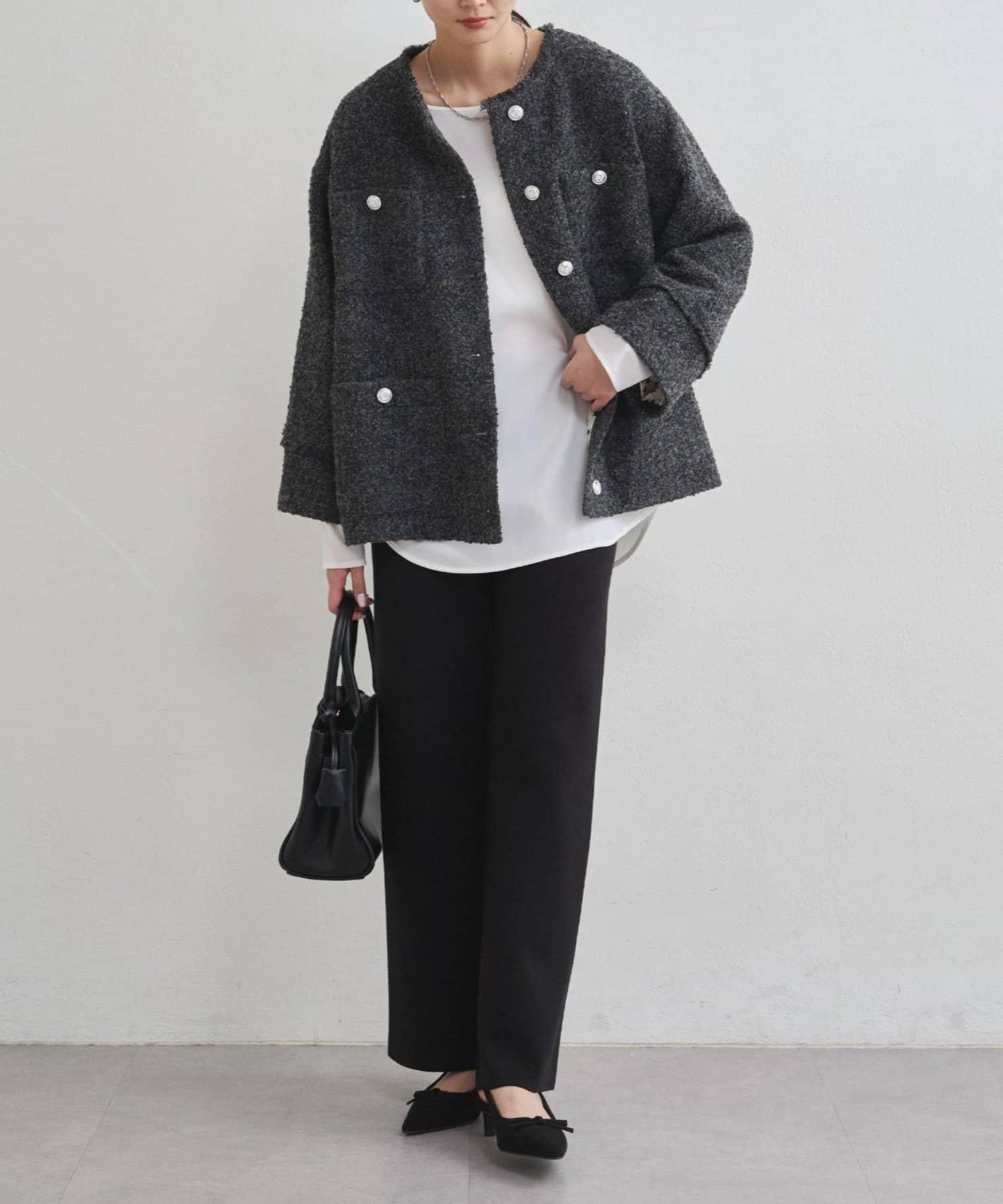 沉穩的斜紋軟呢面料與金色紐扣的結合,凸顯出成熟女性的高雅氣質。