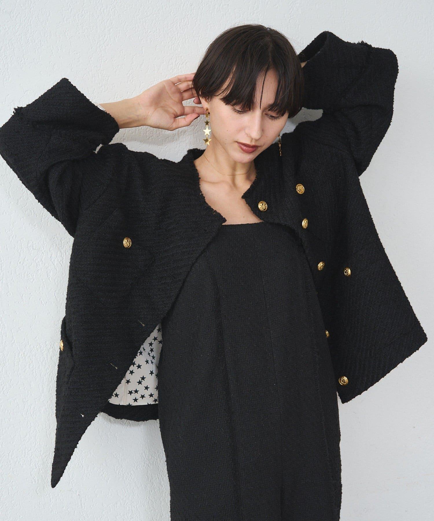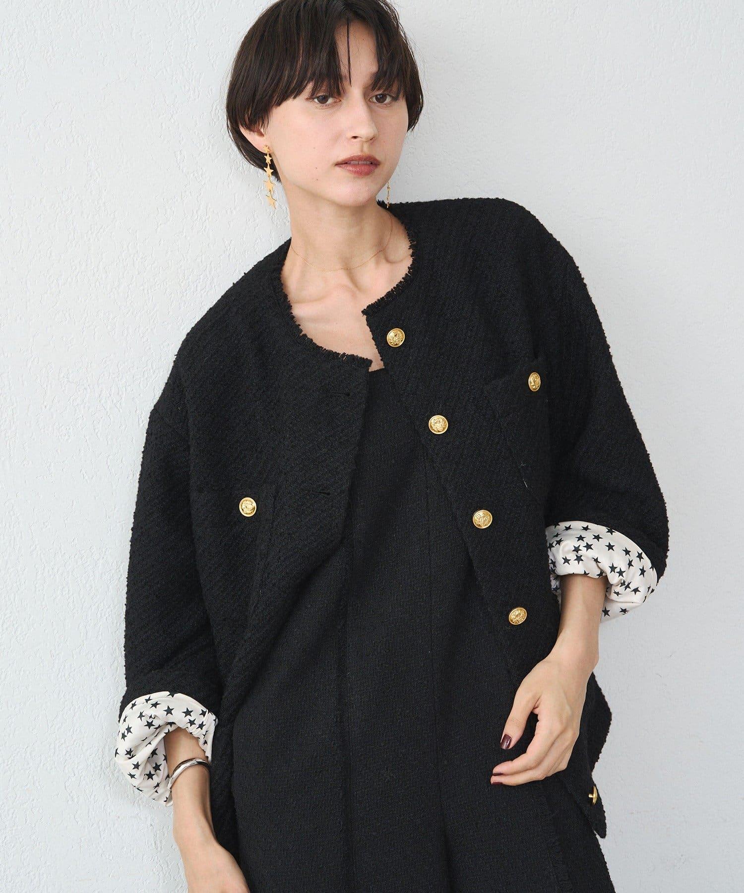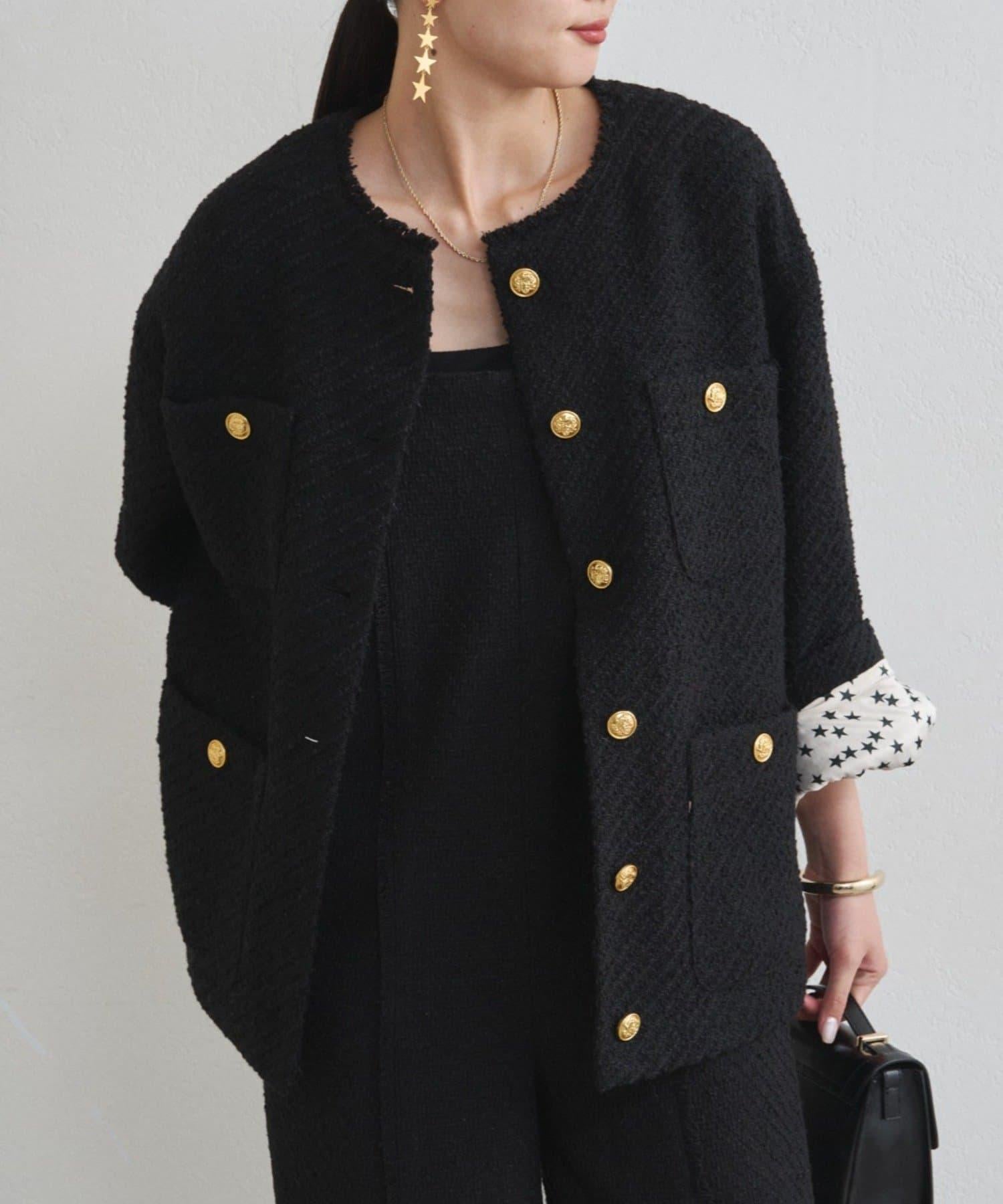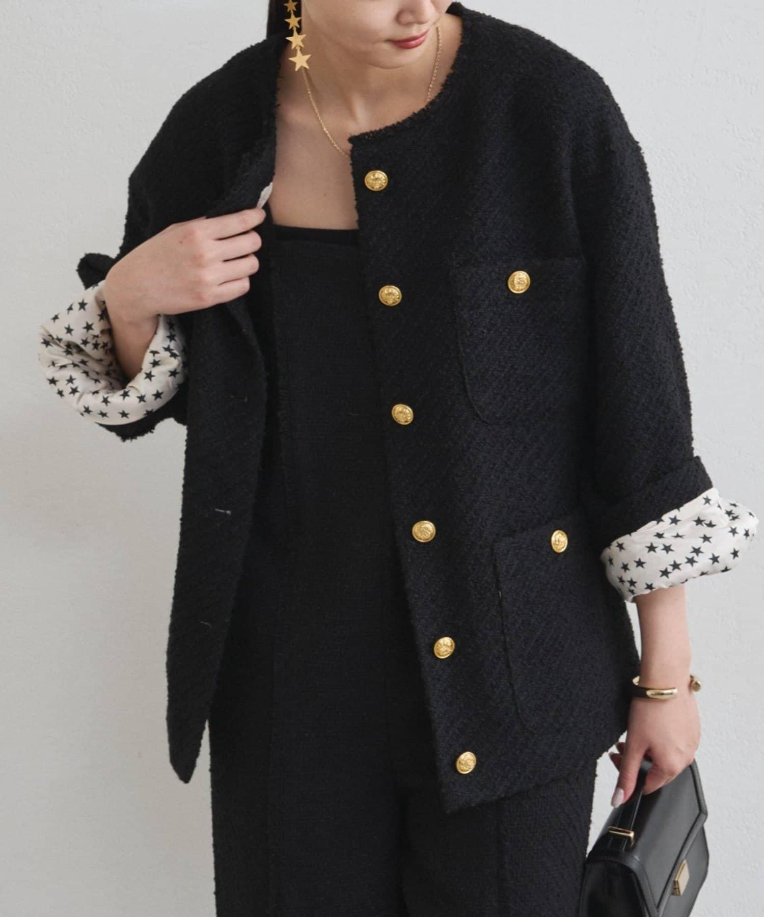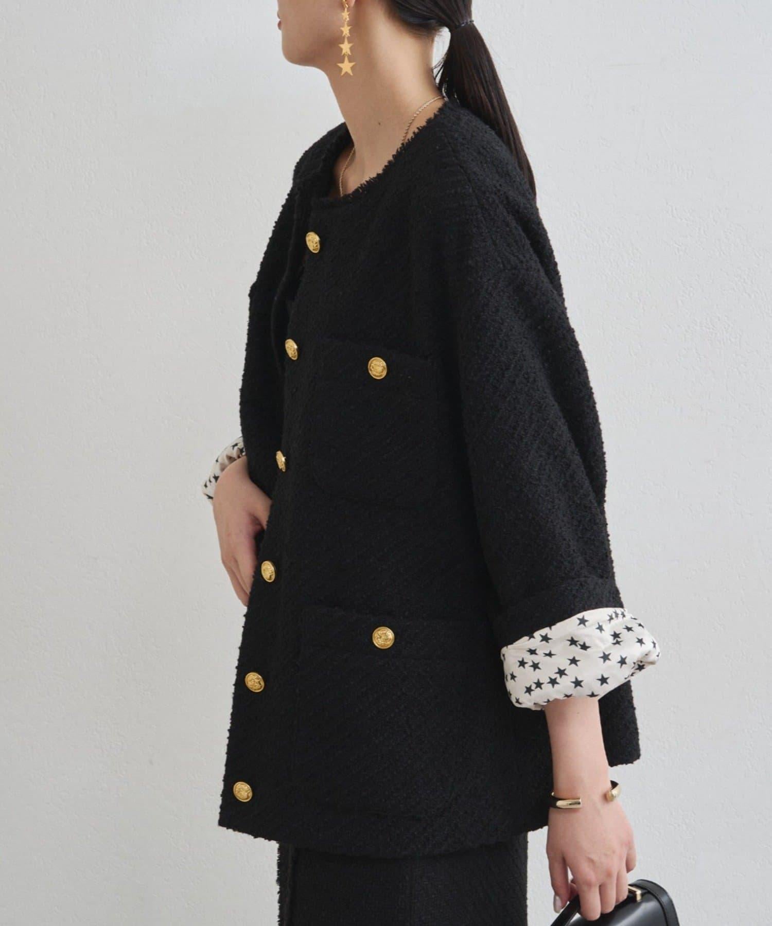 這款夾克由斜紋軟呢剪裁而成,充滿古典氣息,非常適合成熟女性穿著。斜紋軟呢面料具有表面觸感,飾有金色紐扣,散發出優雅的光澤,營造出一種存在感和奢華感。
