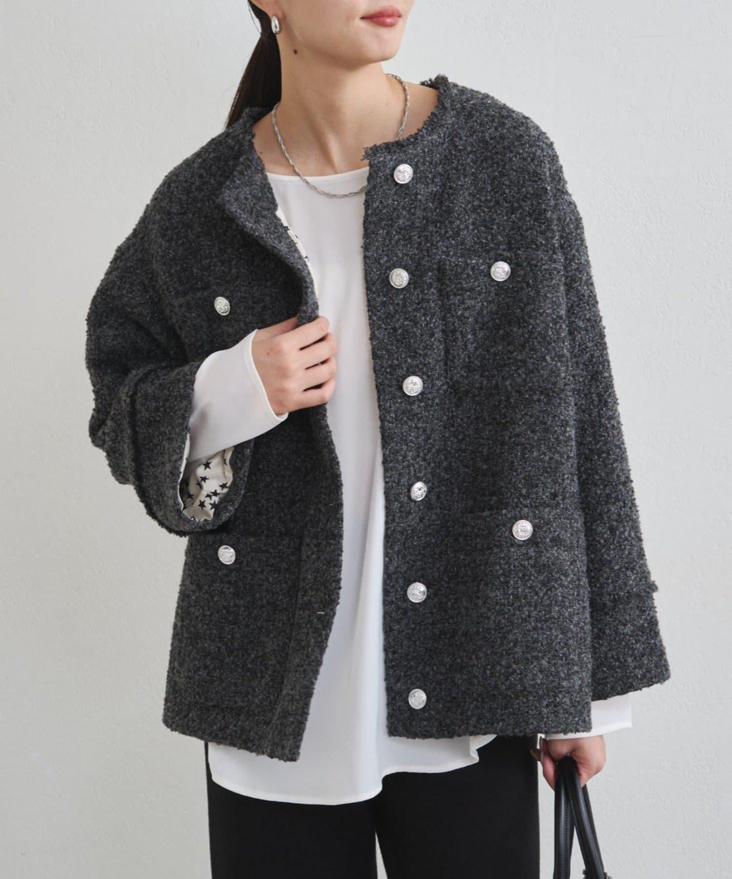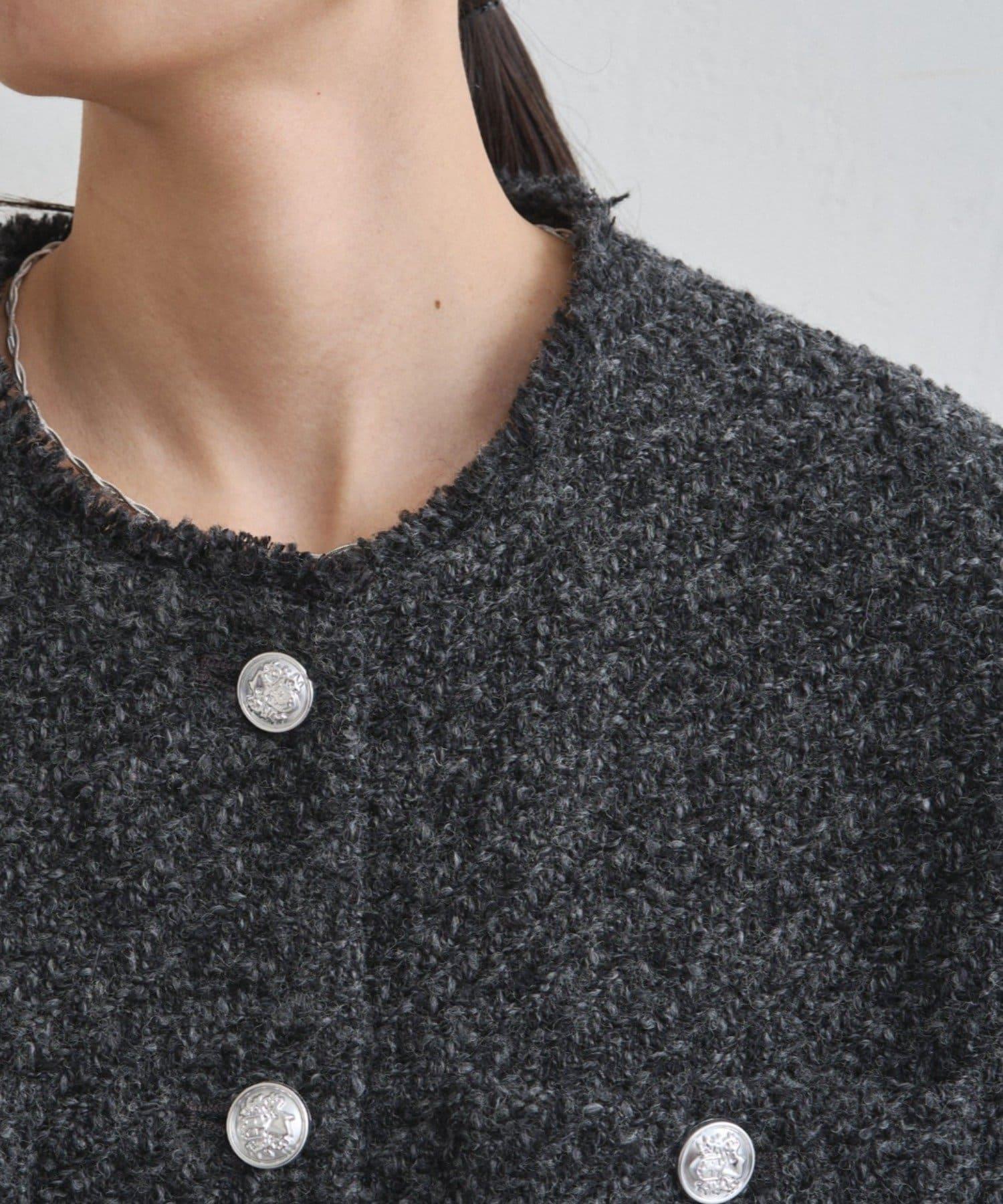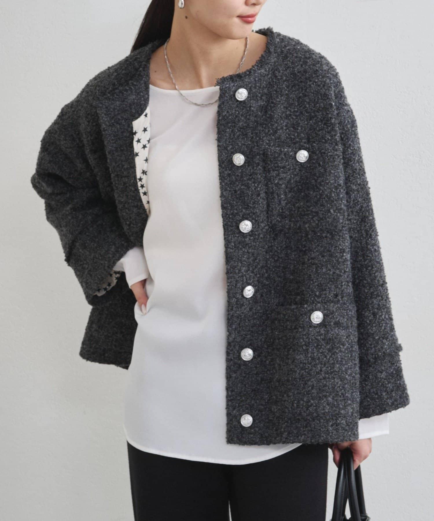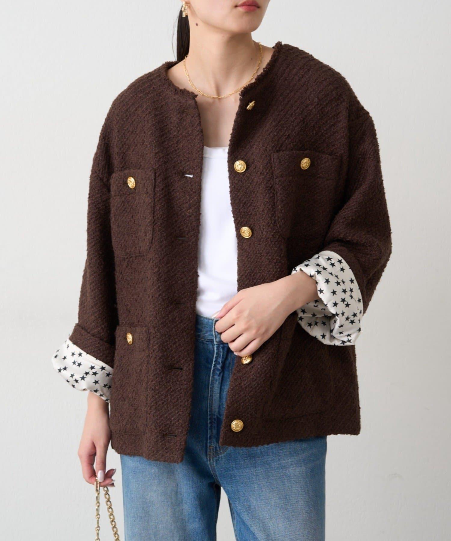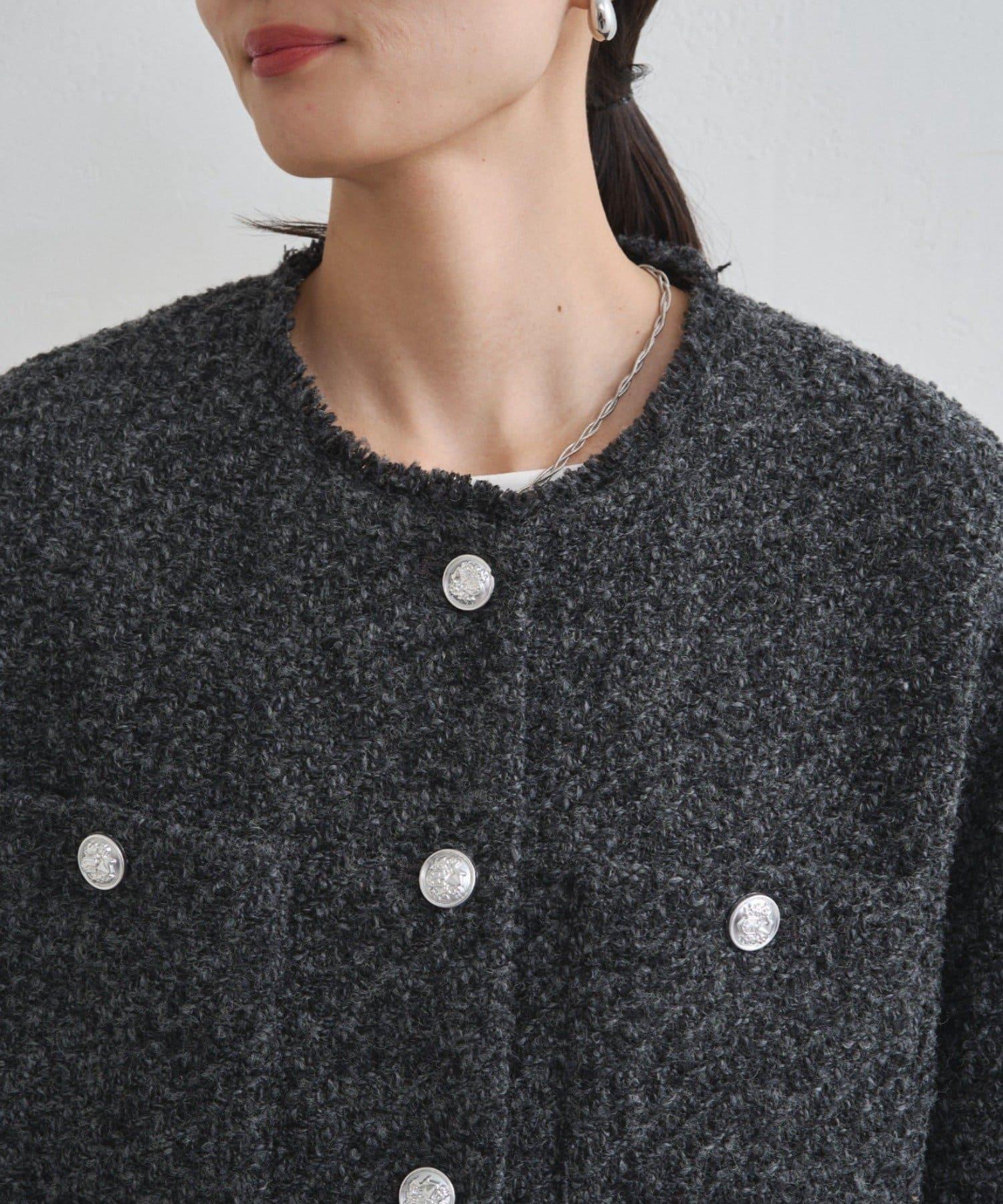 這款夾克由斜紋軟呢剪裁而成,充滿古典氣息,非常適合成熟女性穿著。斜紋軟呢面料具有表面觸感,飾有金色紐扣,散發出優雅的光澤,營造出一種存在感和奢華感。