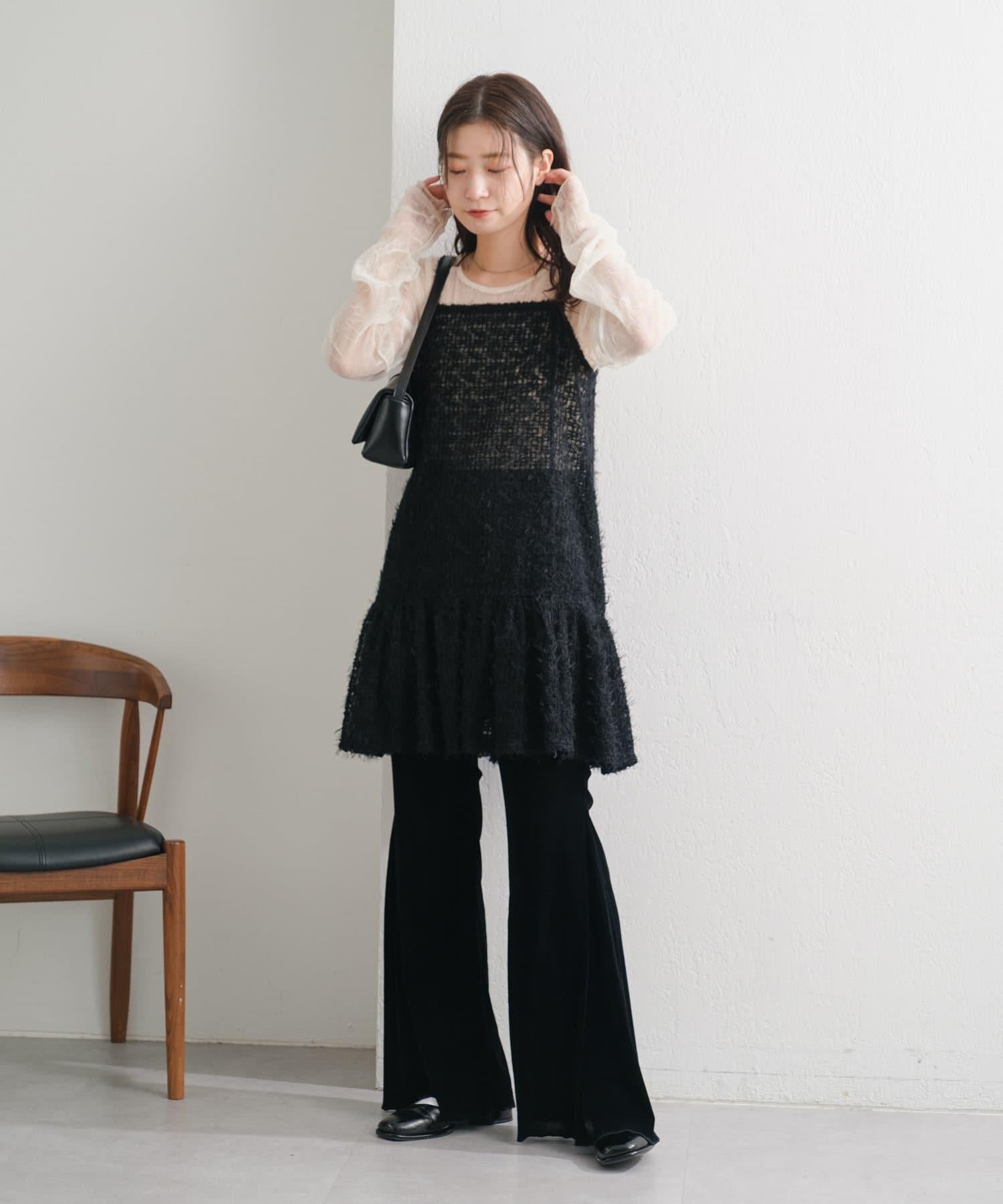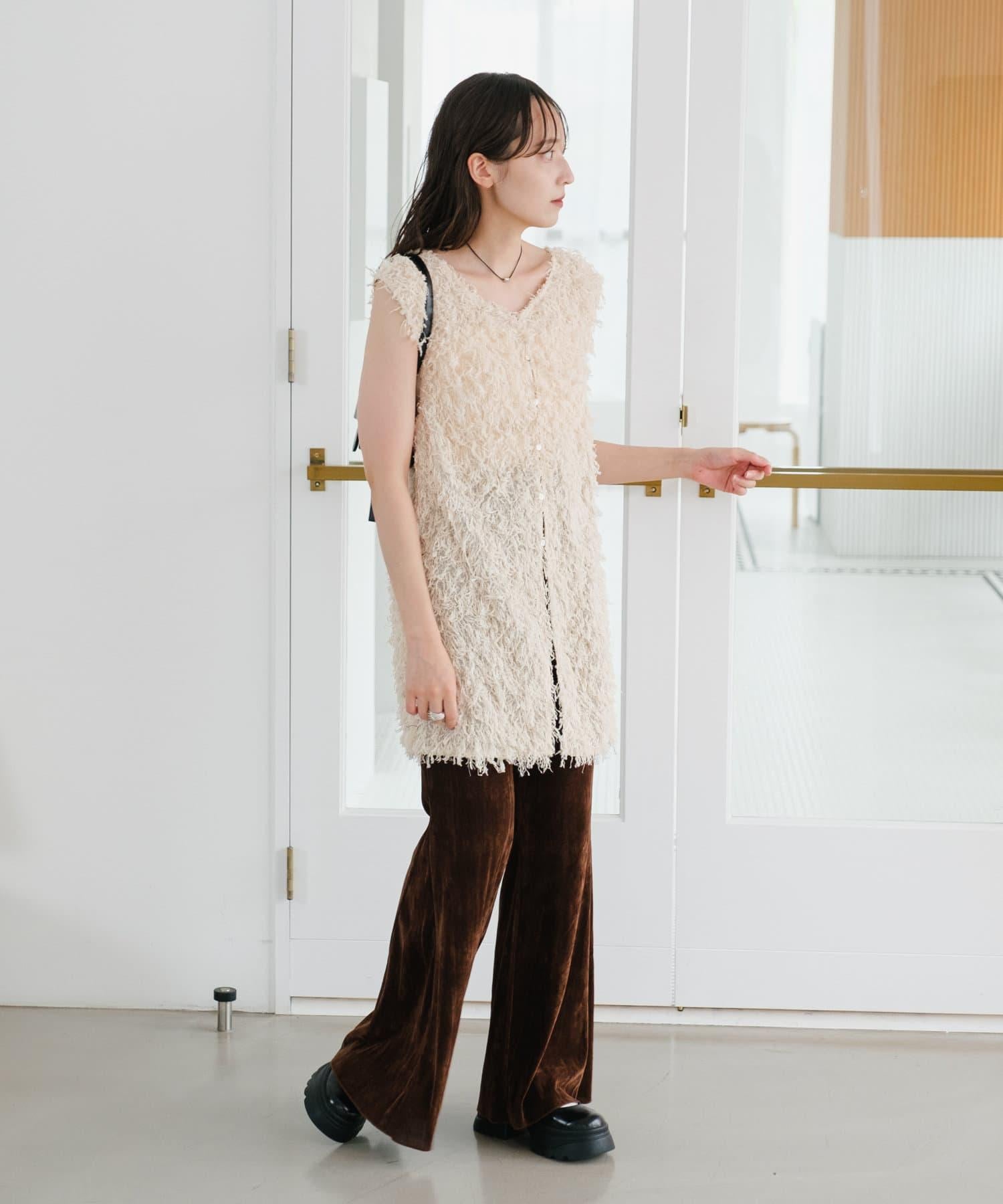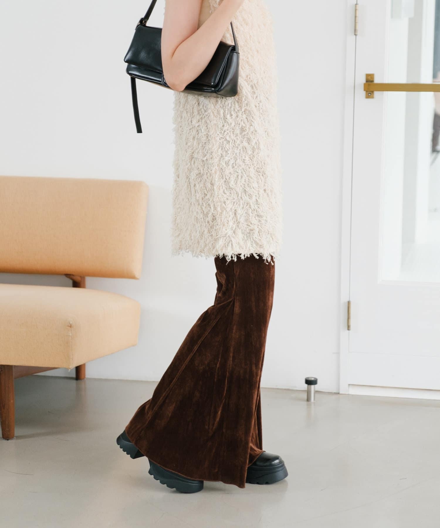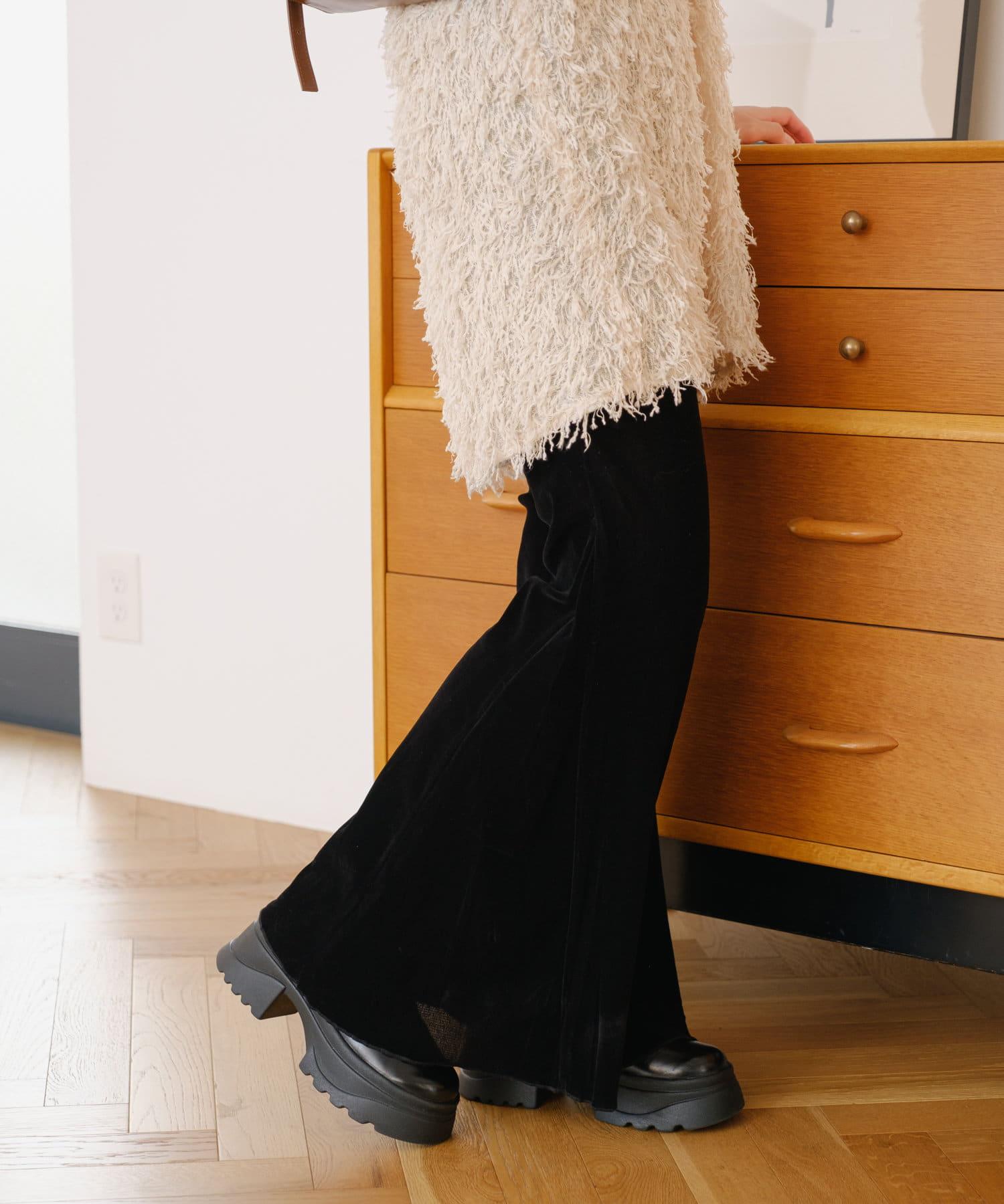 膝蓋處略顯緊身,喇叭形輪廓向下擺延伸。