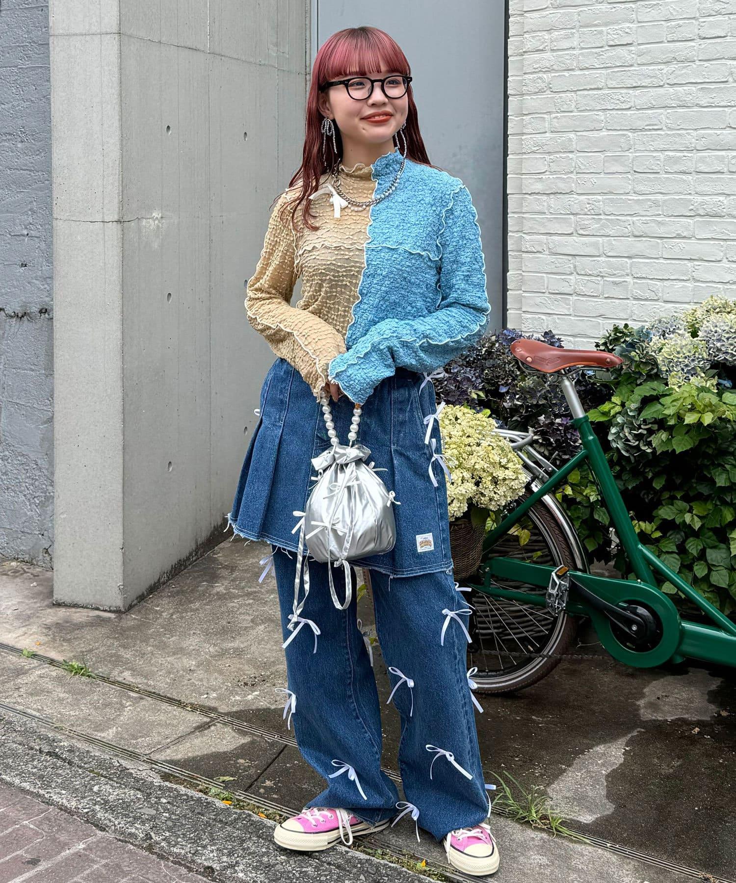 結合兩種不同材質的剪裁縫製,表面有麻點。
