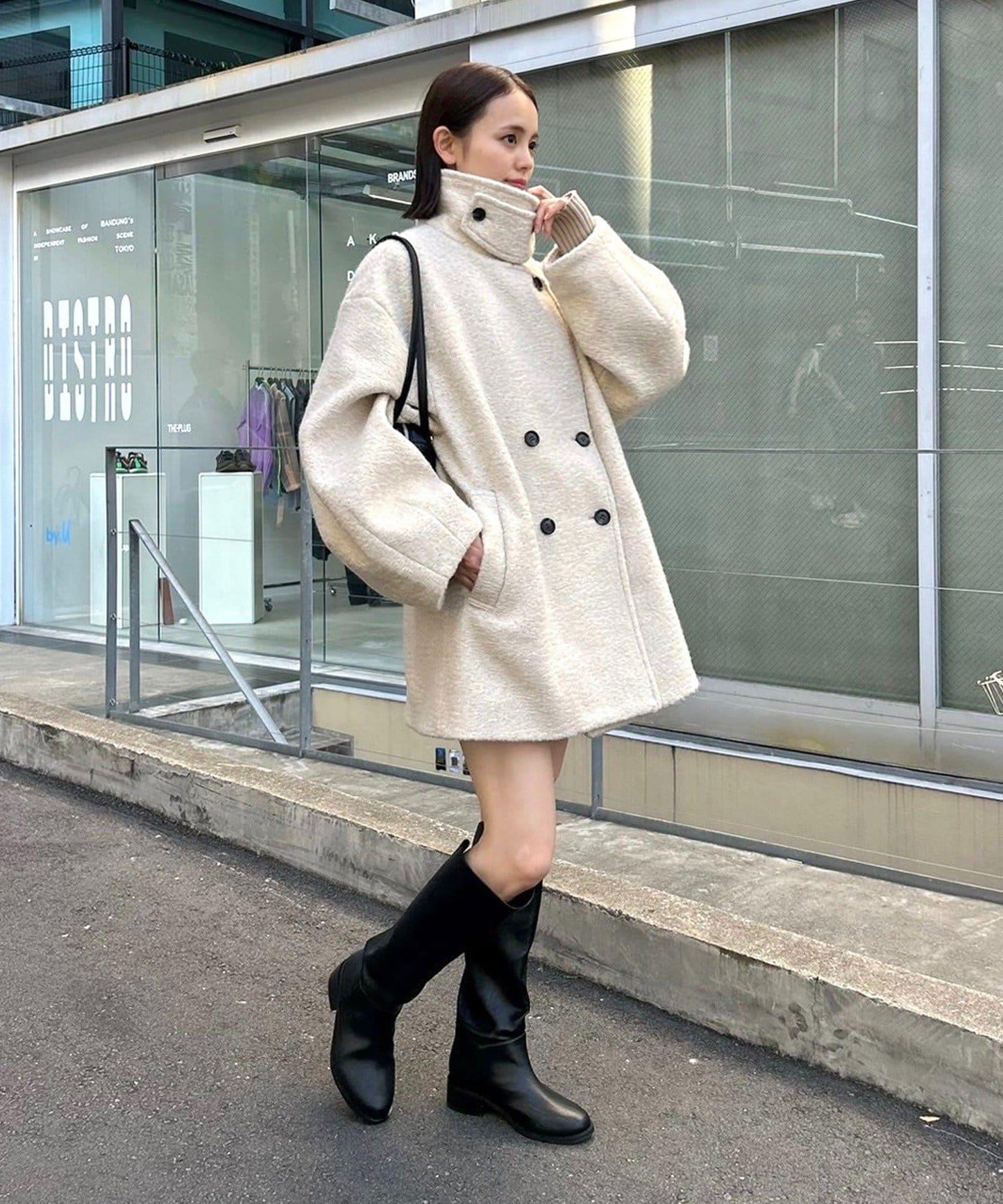 這款大衣擁有時尚的輪廓和糯米材質的觸感。