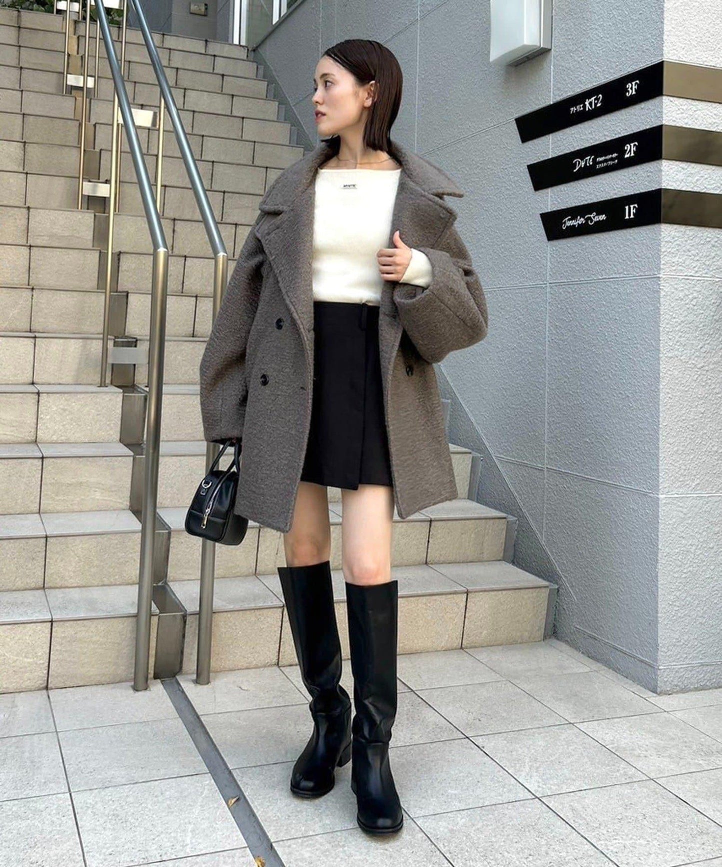 搭配迷你長褲和長筒靴,打造時髦造型。