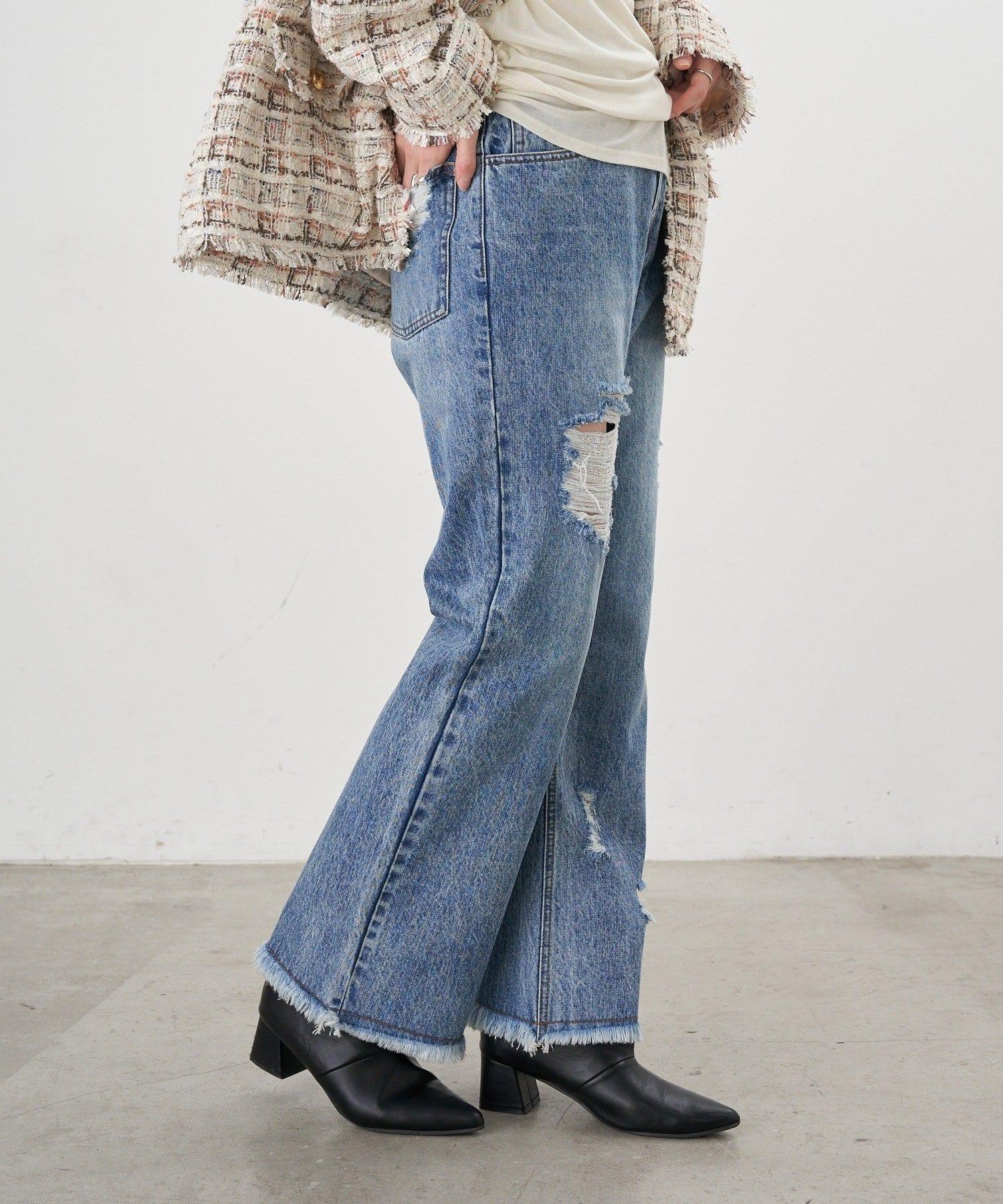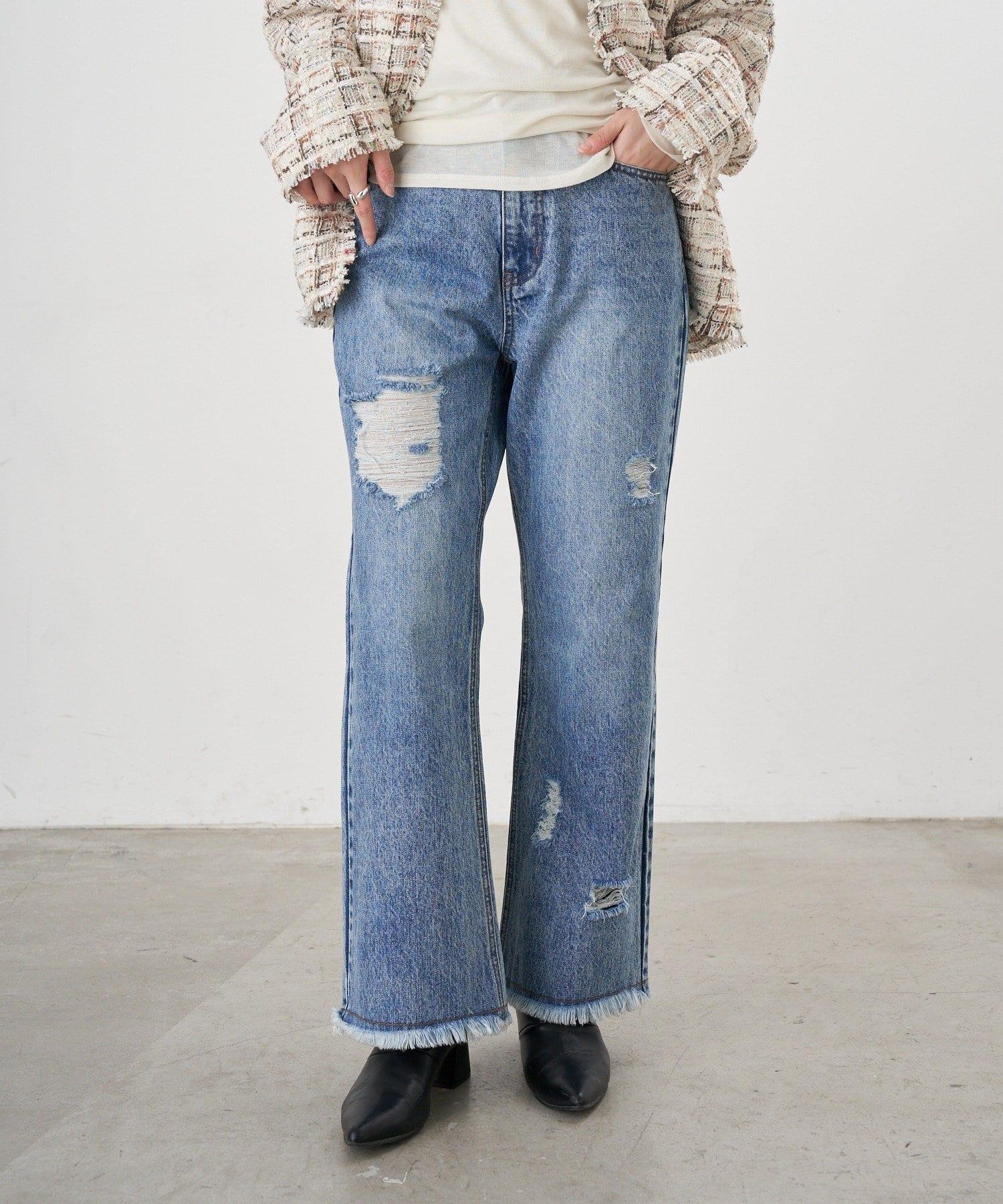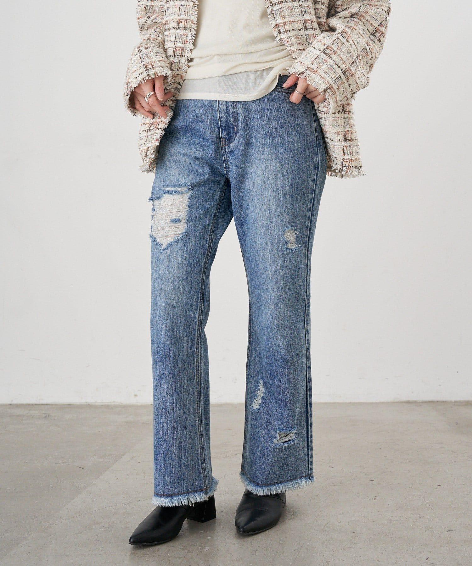 破損程度恰到好處的時尚牛仔長褲。