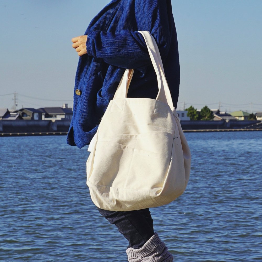 四個口袋以對角線表示,看起來很獨特。內側也有一個口袋。這款包設計簡潔,即使男士使用也會顯得很酷。 [尺寸] 扣合時寬度(頂部)35 厘米,打開時 67 厘米 寬(底部)30 厘米 高36cm 袼褙 32cm 手柄 75cm [材質] 100%棉質前航韓布/三河織布(愛知縣西尾市) *標籤位置自 2022 年 5 月 1 日起發生變化。[三河梭織面料的歷史 - 風帆前竹面料] 在 UZUiRO 所在的愛知縣西尾市,從明治時代到昭和時代初期,使用了一種獨特的紡紗方法: 船原紡紗,利用八柳河的水流 ,這在歷史上是罕見的:紡紗是在船上進行的。當時,附近 的一些織工利用粗捻的紗線編織結實的帆布,用於酒鋪和米鋪。到了昭和時代(1926-1989 年), 逐漸改用現代機械,紗羅紡紗也停止了,但在這種背景下, 直到👍近還在使用粗支紗生產帆布。自泡沫經濟破滅以來,帆布的產量逐漸減少, ,現在幾乎已經停止生產。我們從一位關閉了機械商店的 90 歲老奶奶手中接過了用於製作帆布圍裙的珍貴三川織物的剩餘庫存。 。我們可以使用這種織物。