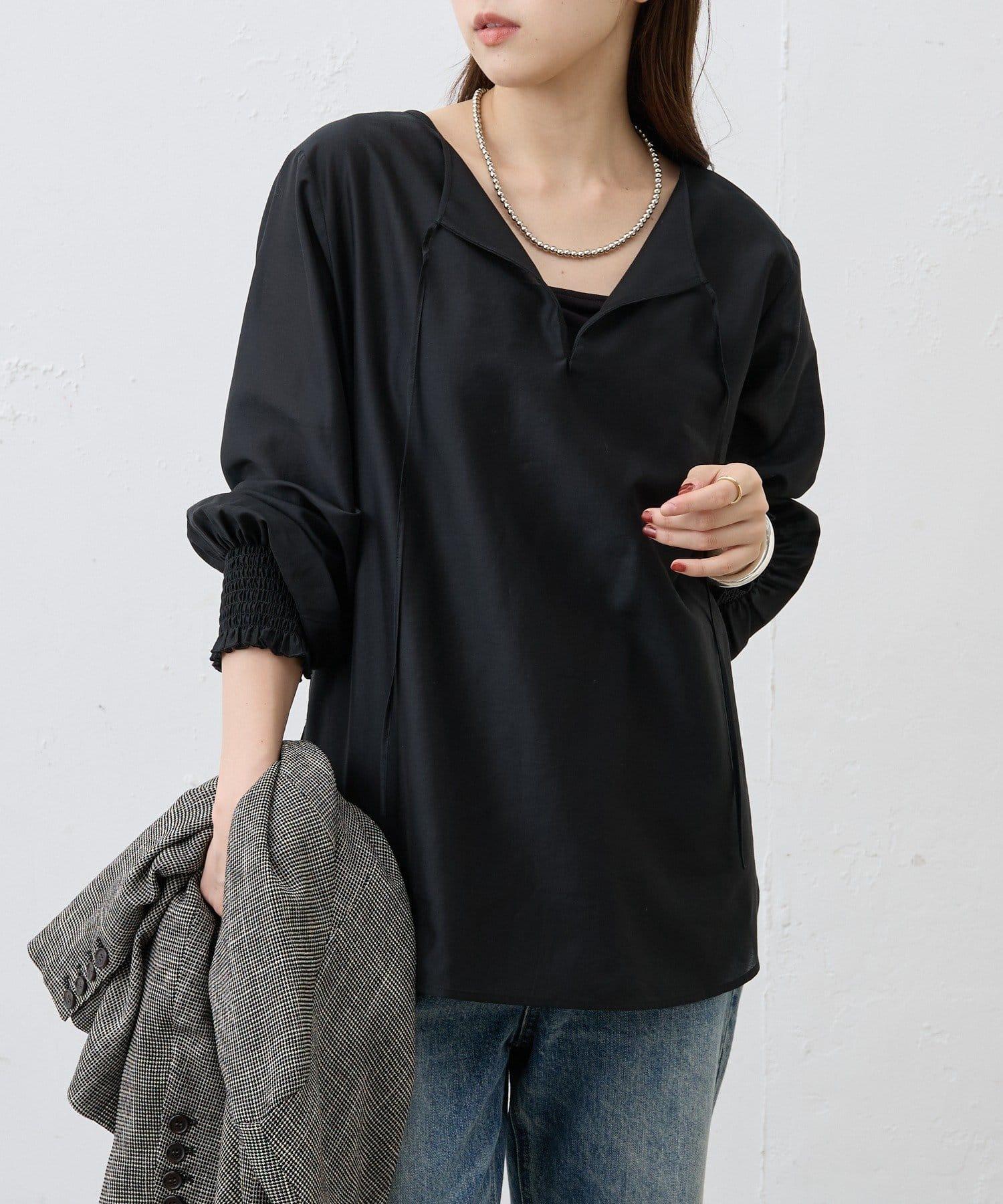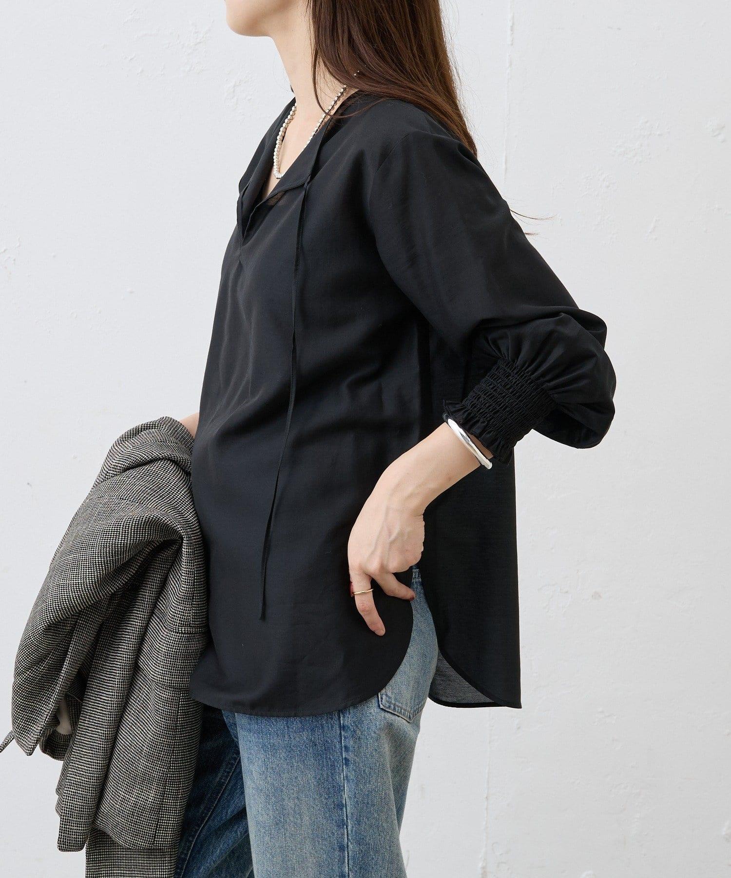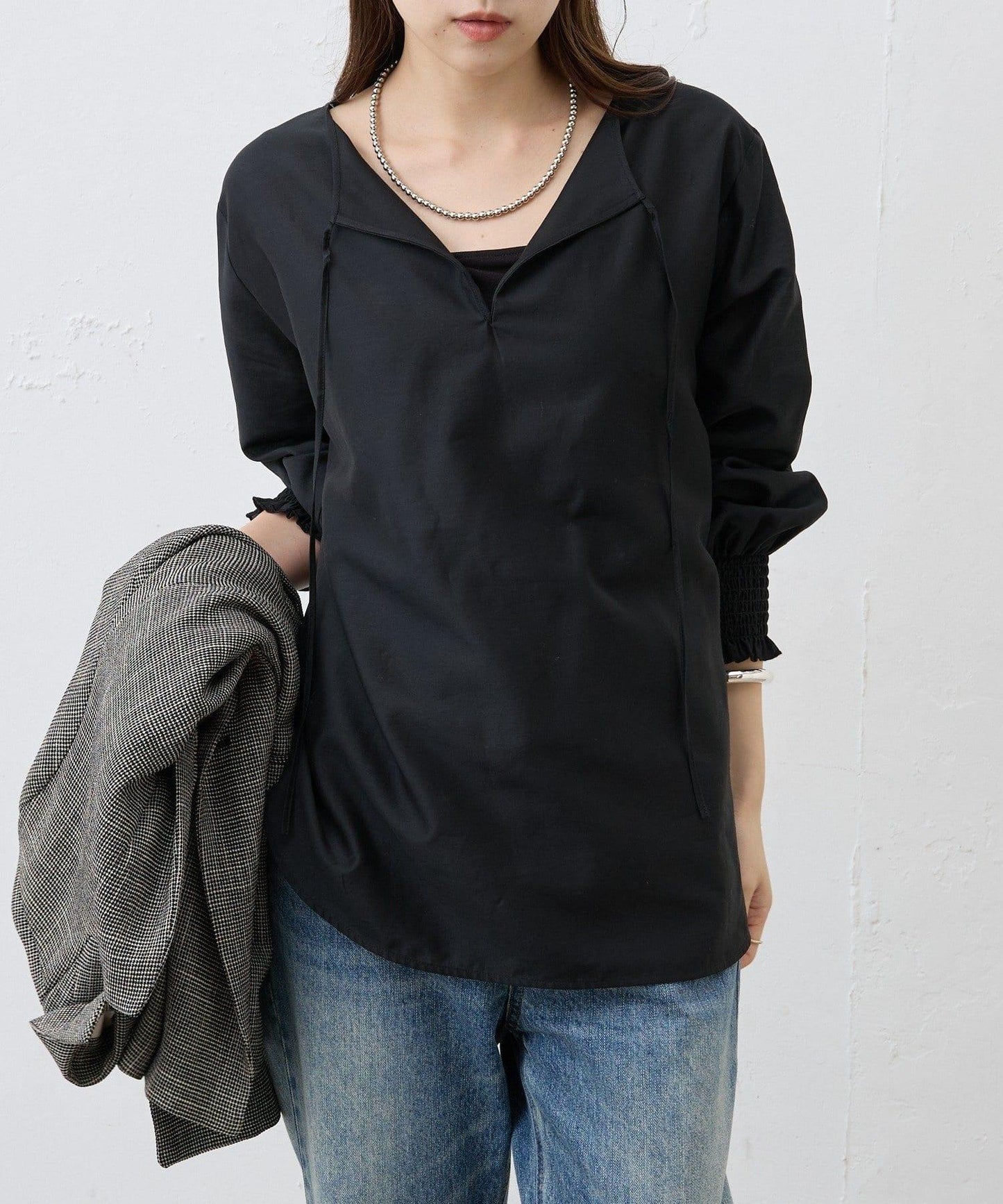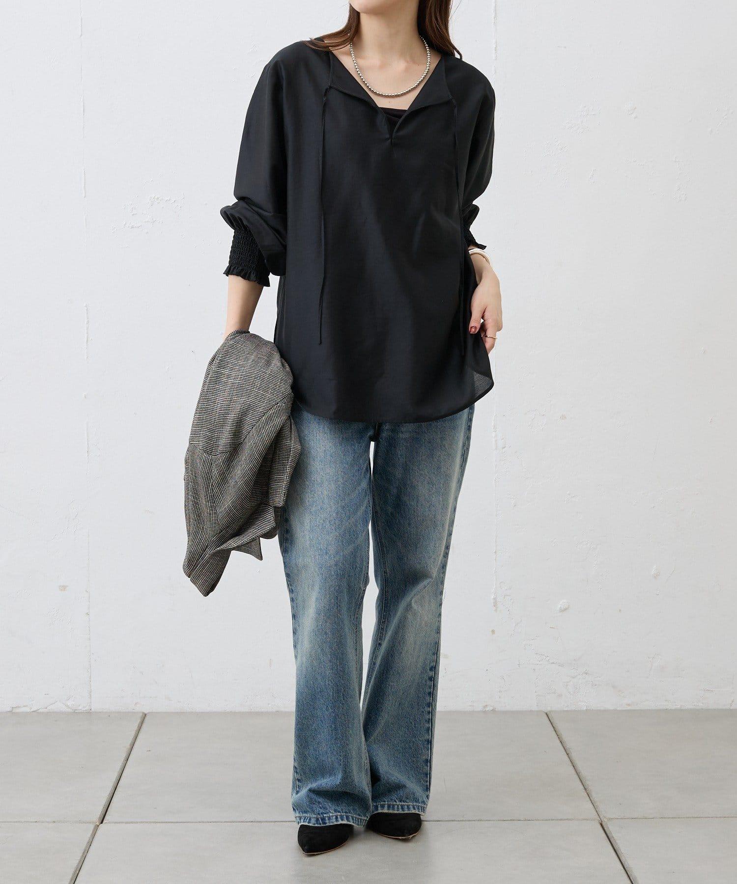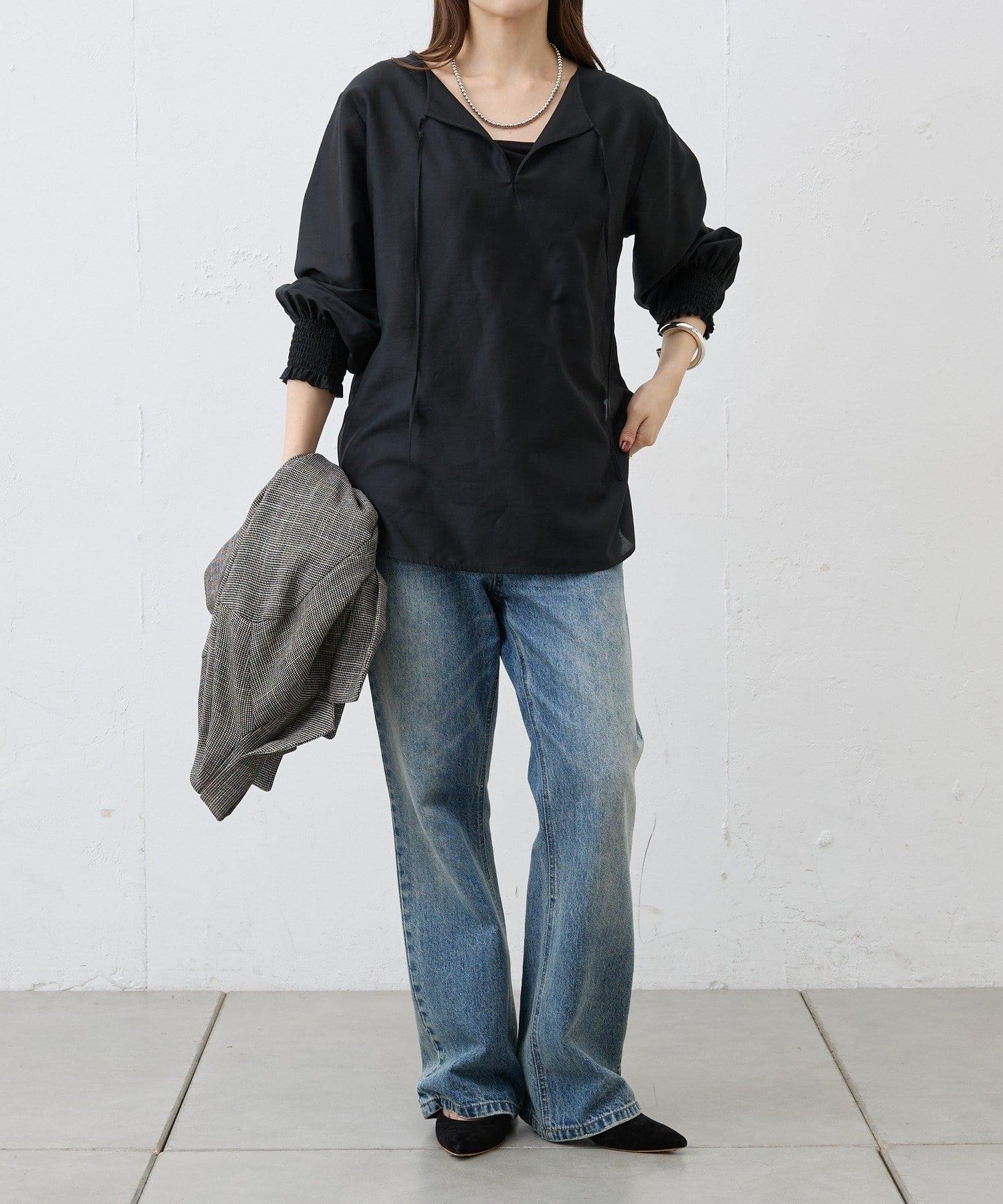 V 領的頂部有緞帶裝飾,看起來更寬鬆。