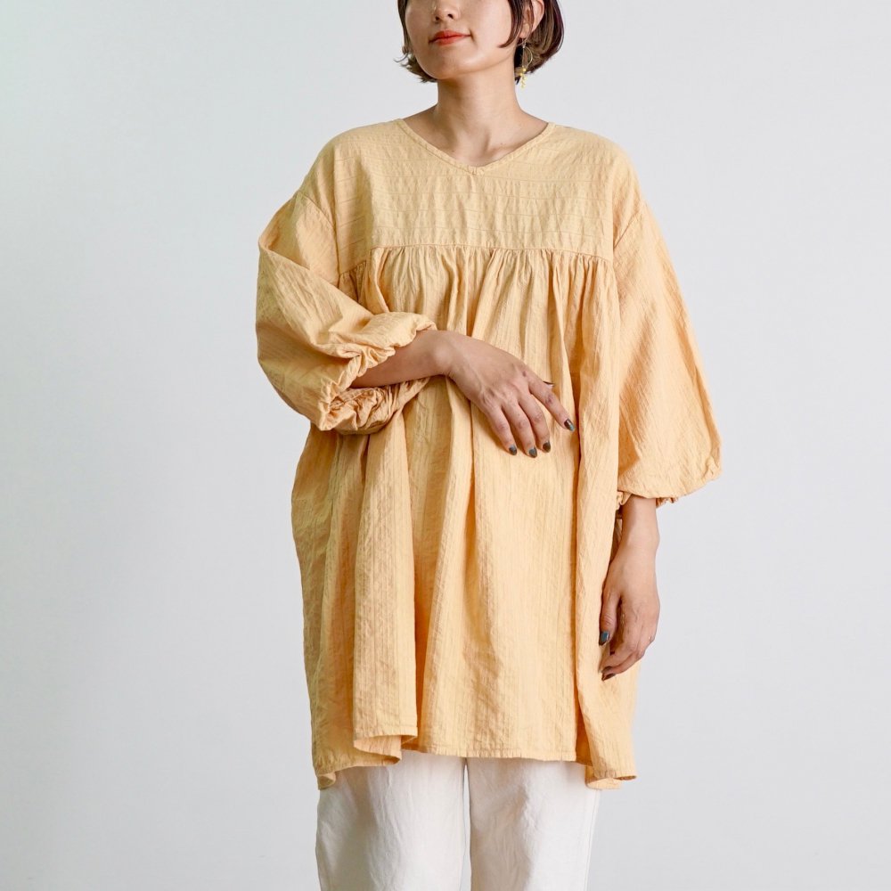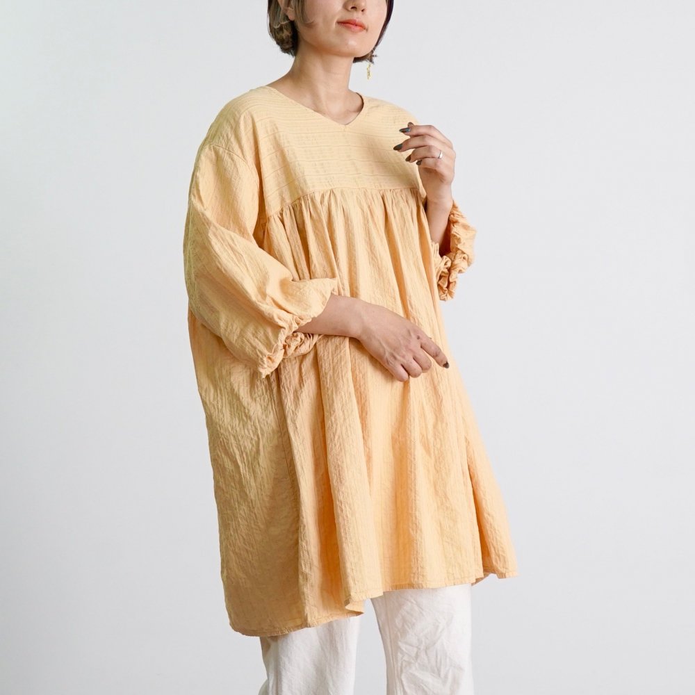 2way氣球袖束腰連衣裙/淺橙色/交織條紋