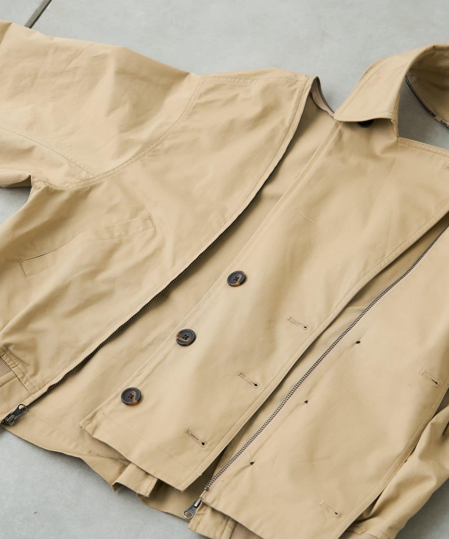 這款輕便外衣的設計極具吸引力和存在感,就像 MA-1 和短款風衣的混合體。衣領和後背收褶等細節設計與風衣相似,但袖子末端和下襬採用羅紋設計,營造出適度休閒的平衡感。雖然乍看之下很獨特,但其輪廓和麵料的觸感卻很容易穿上,自然融入您的日常造型。