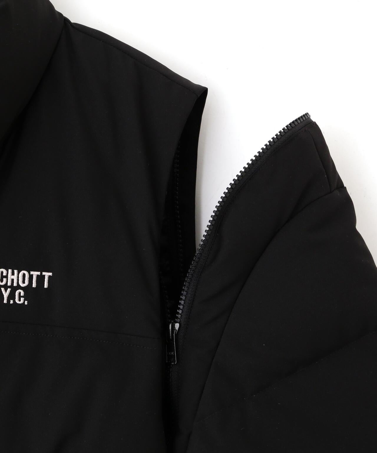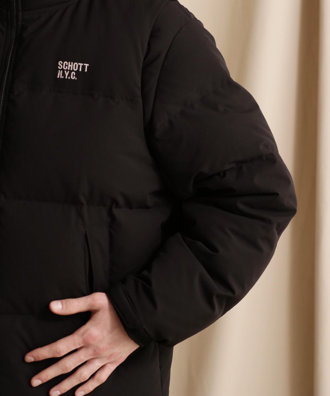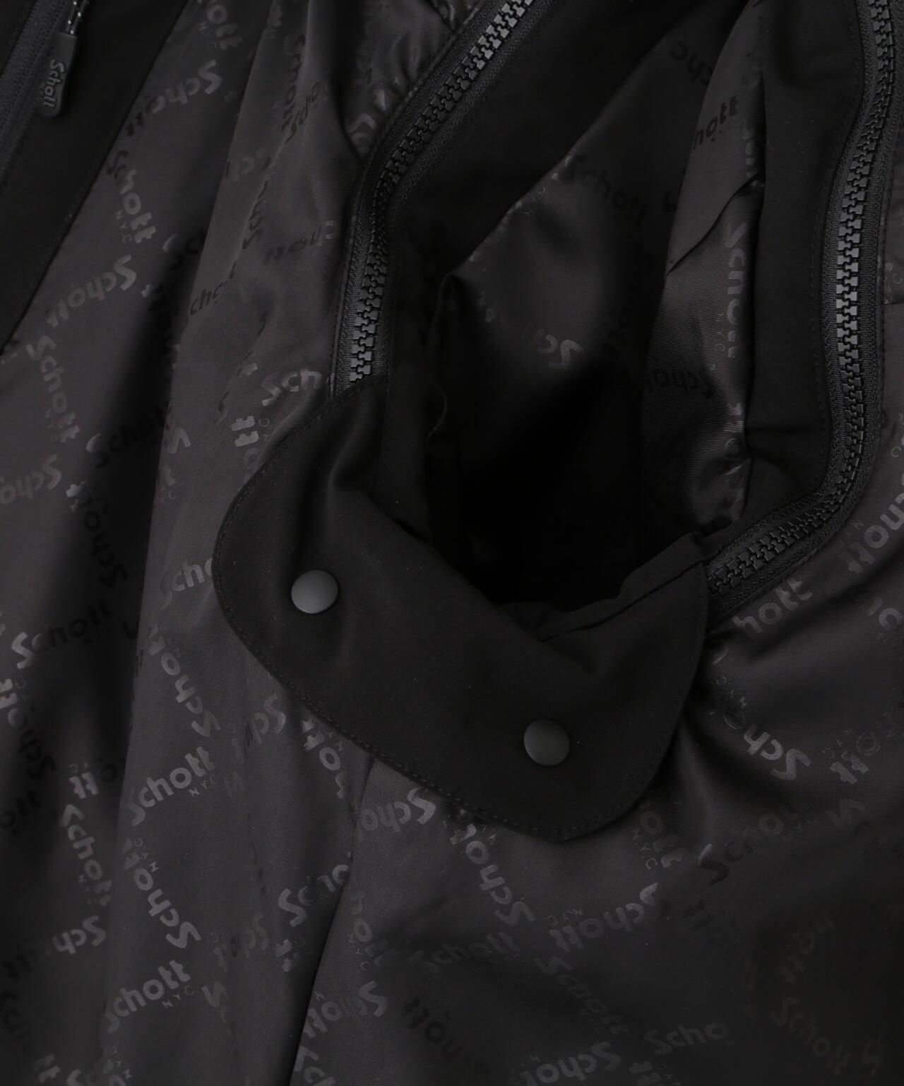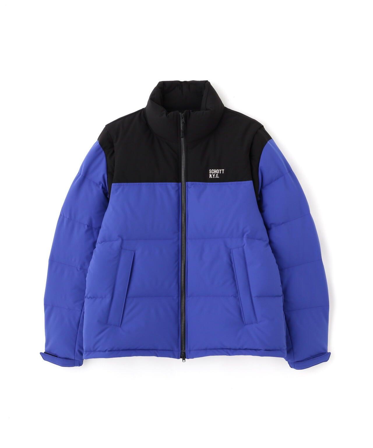 站立式雙色羽絨服由彈力 100%滌綸製成。80% 的羽絨和 20% 的羽毛包裹確保了高保暖性。袖子可拆卸,有兩種穿法。肩部採用特殊花紋,使肩部線條向內收攏,同時還實現了將其作為馬甲穿著的尺寸設計,而將袖子拆下作為馬甲穿著時會有很多不便之處。肖特(Schott)可以說是騎手夾克的代名詞,其歷史始於 1913 年,由歐文-肖特(Irving Schott)和傑克-肖特(Jack Schott)兄弟在紐約創立。起初,他們只是一家生產雨衣的工廠,1928 年,他們成為世界上👍家將前拉鍊應用於騎行夾克的公司。