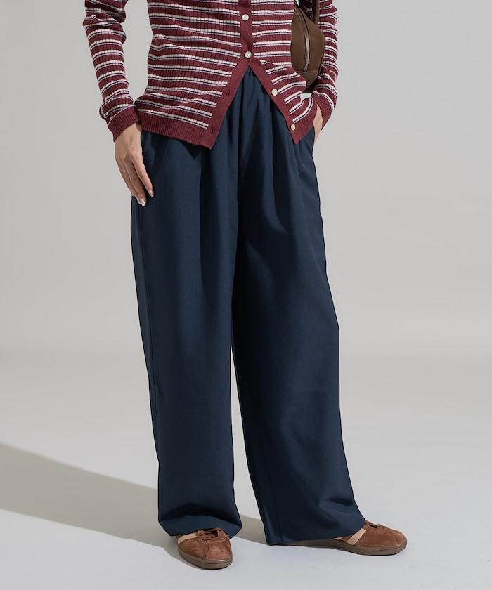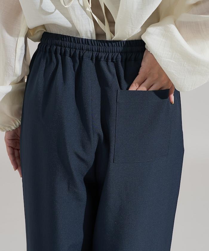 長褲的輪廓寬大,腰部採用鬆緊帶設計,寬鬆合體。