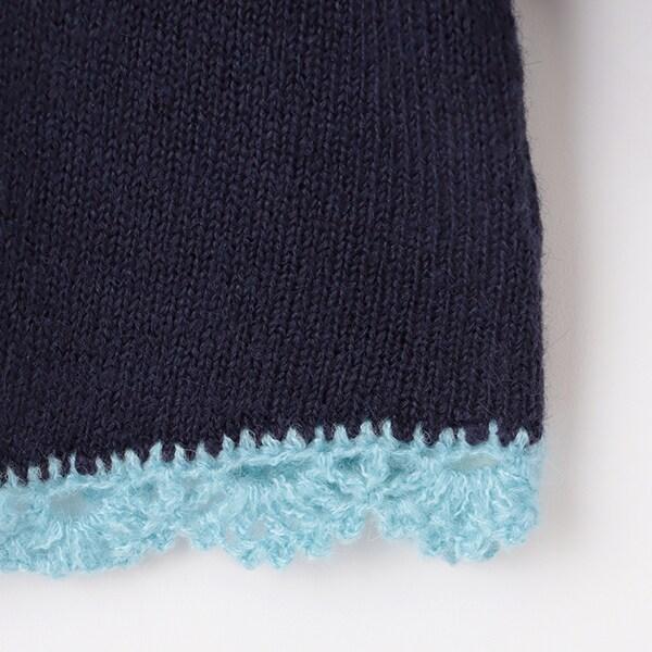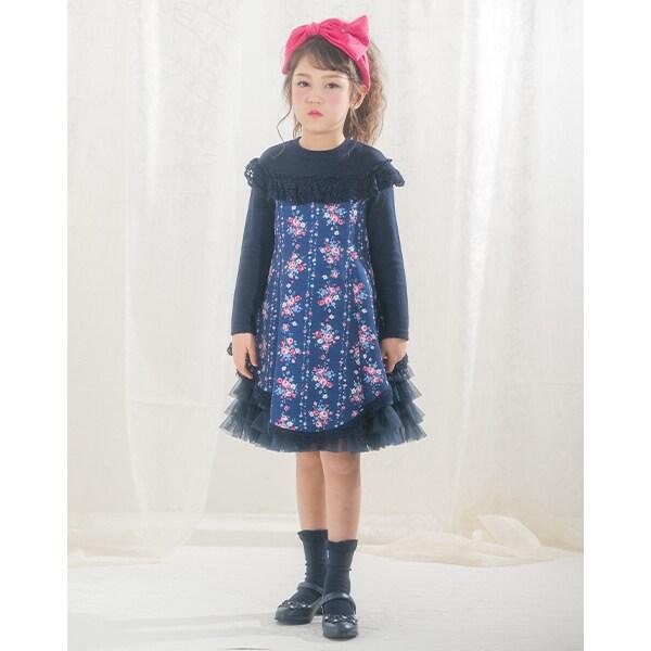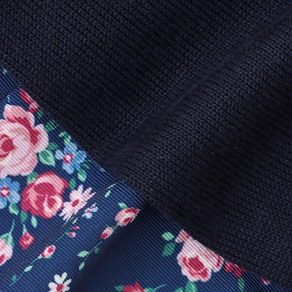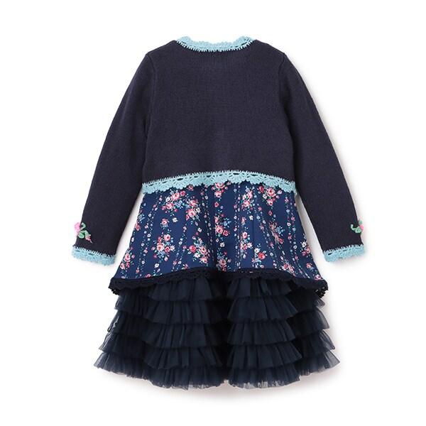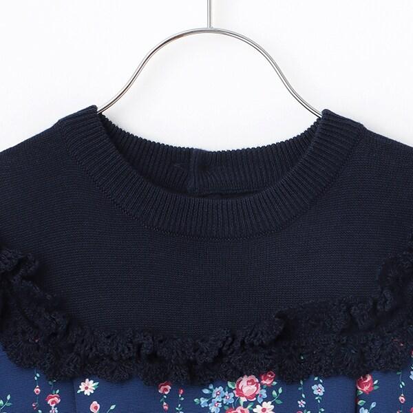 連衣裙上有復古壁紙風格的花朵圖案,採用針織面料,裙軛和下襬飾有與針織紗相匹配的原創花邊。