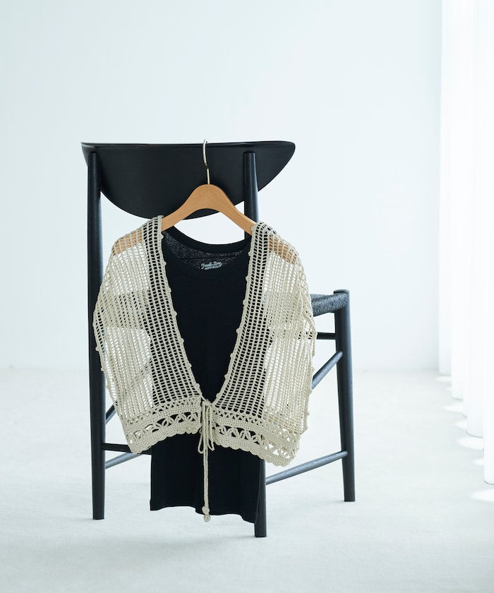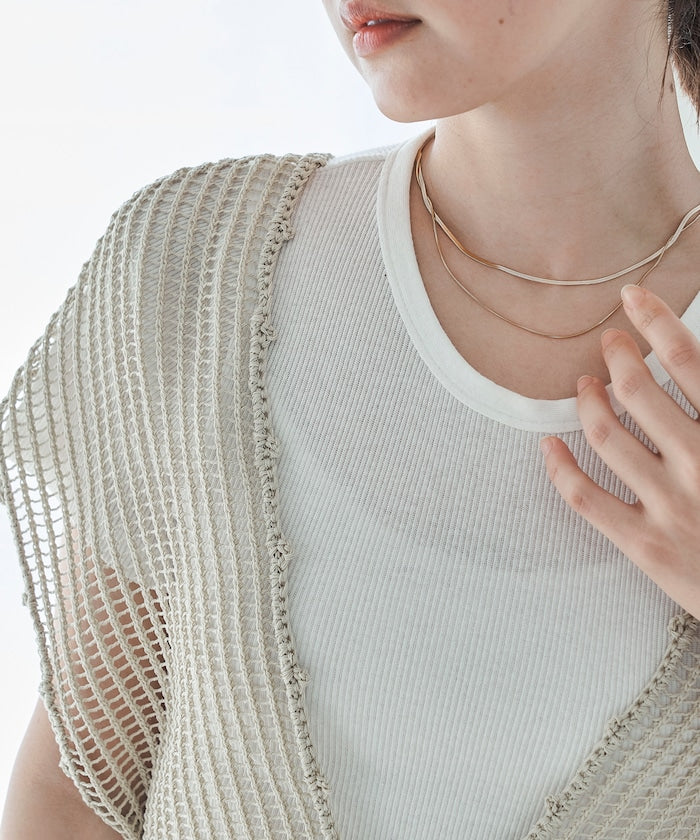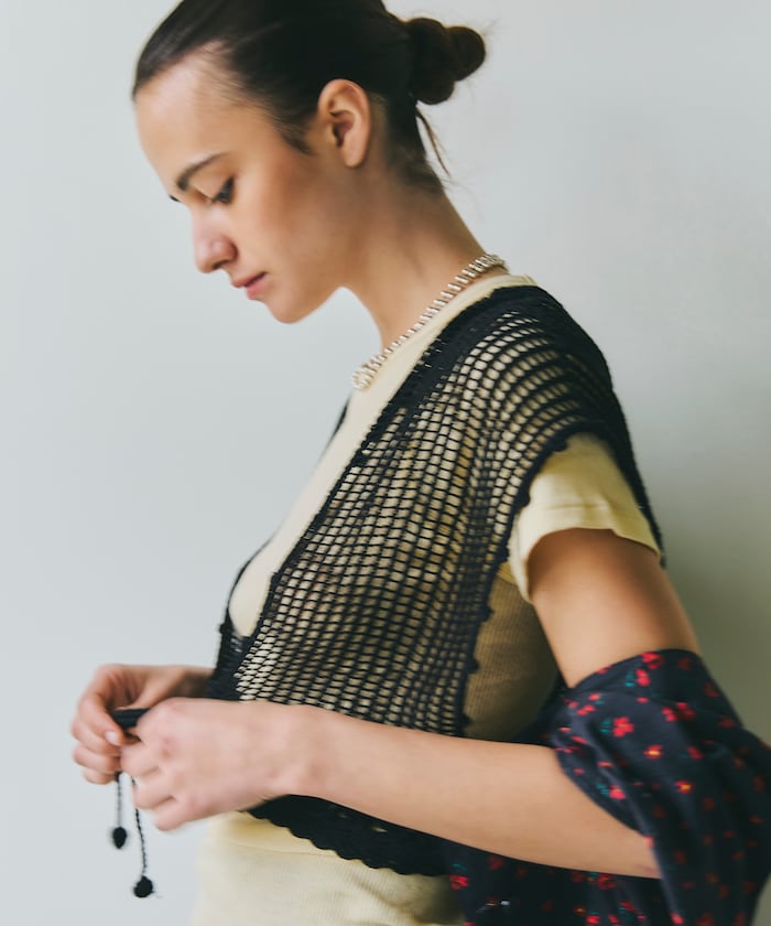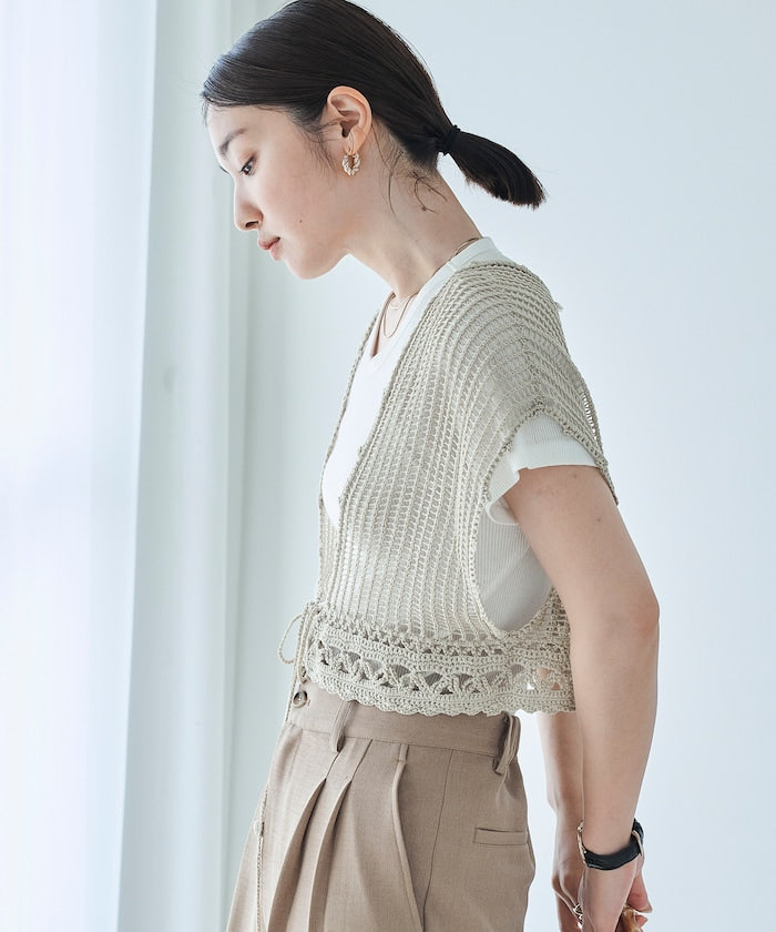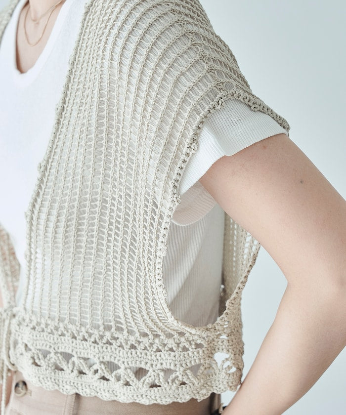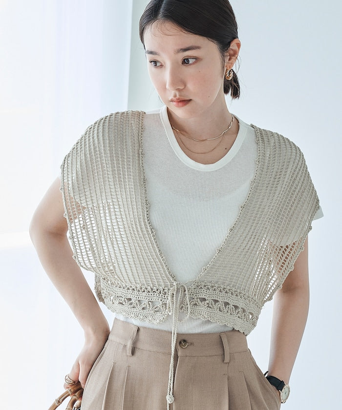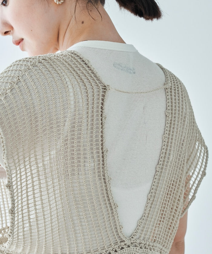 這款馬甲採用清爽的亞麻混紡紗線,並結合了多種針織面料。