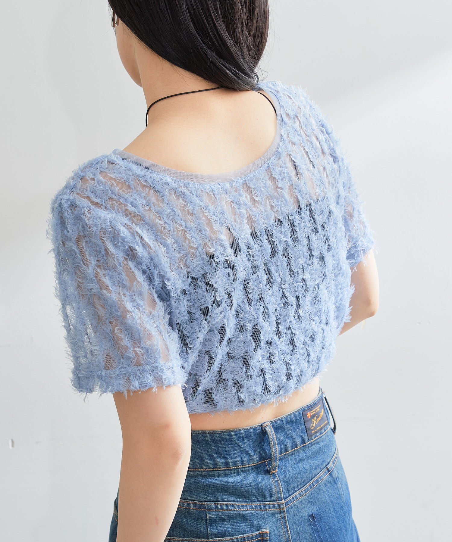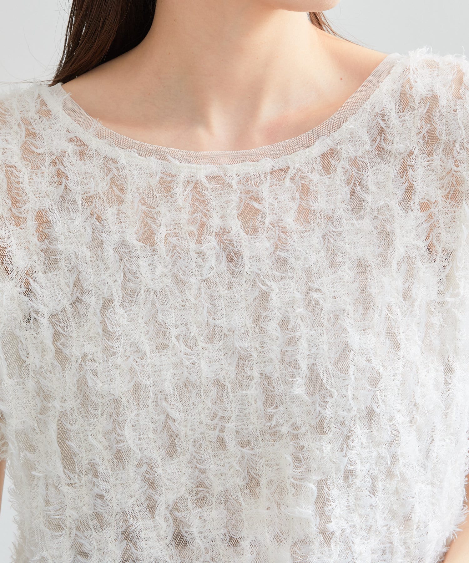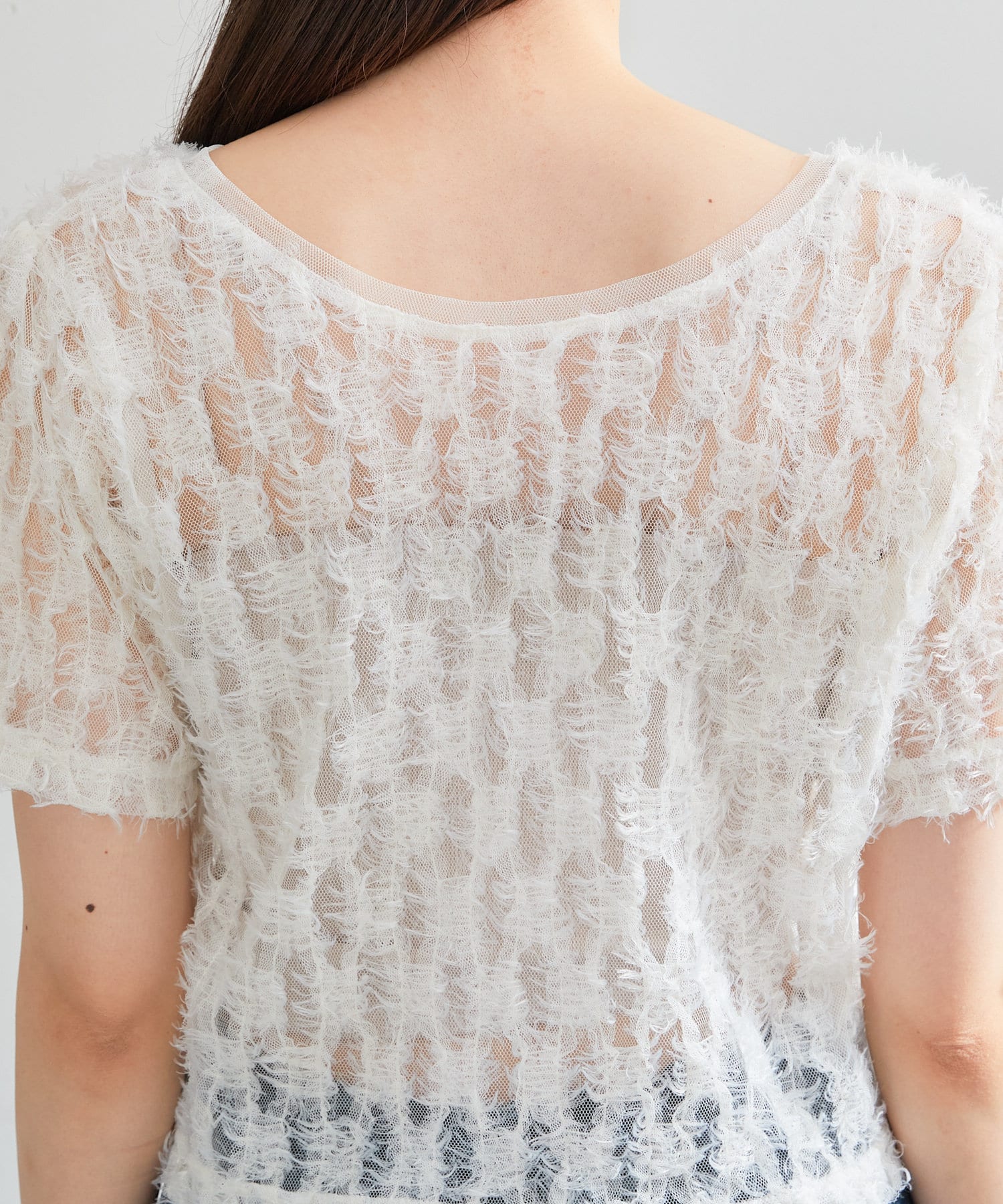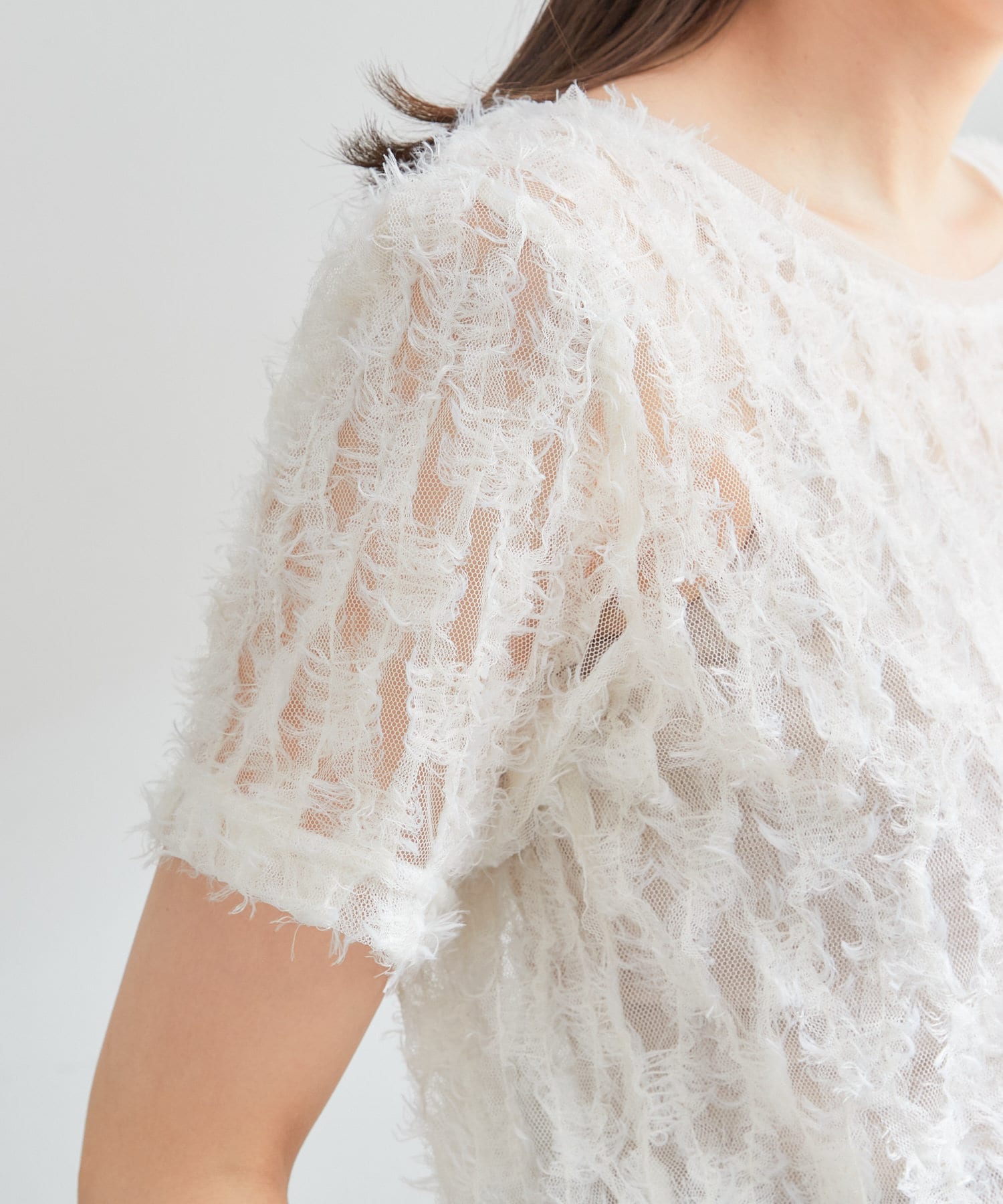 羽毛薄紗賦予了這件上衣女性化、成人化和可愛化的印象。