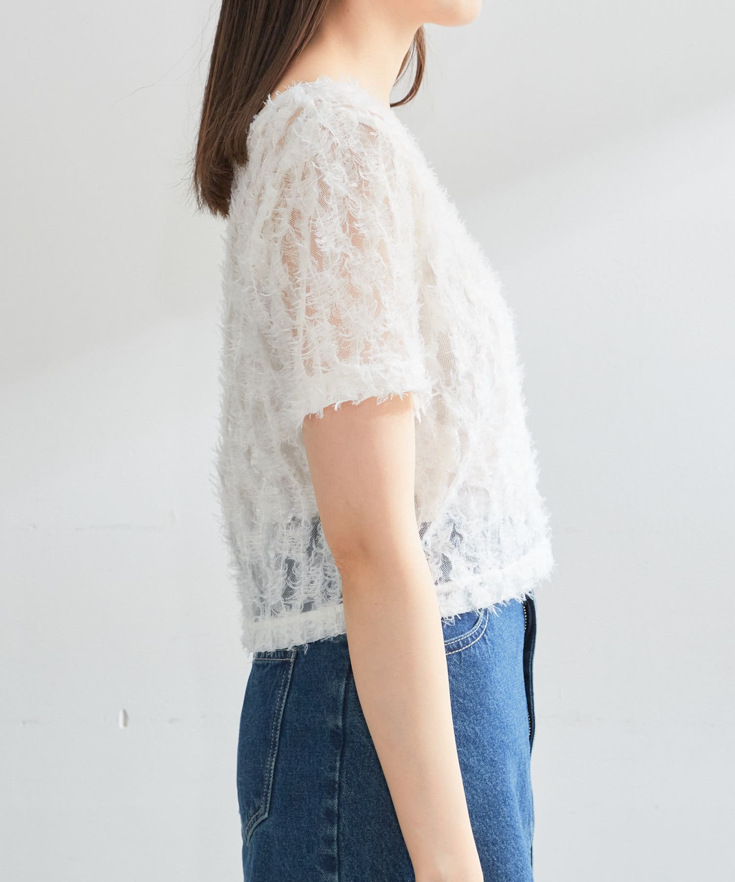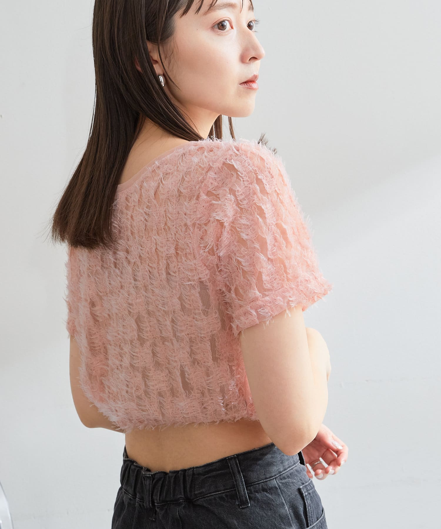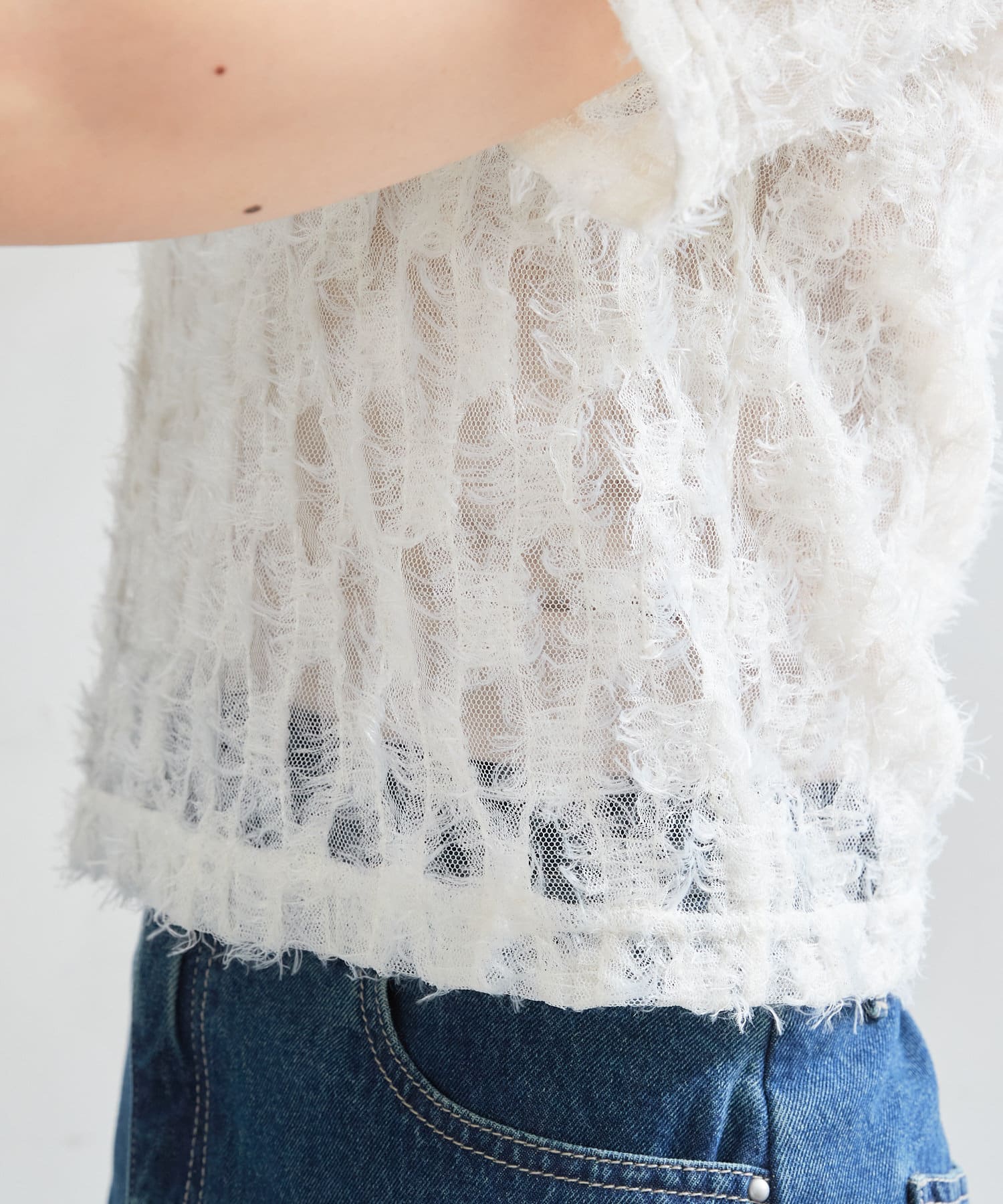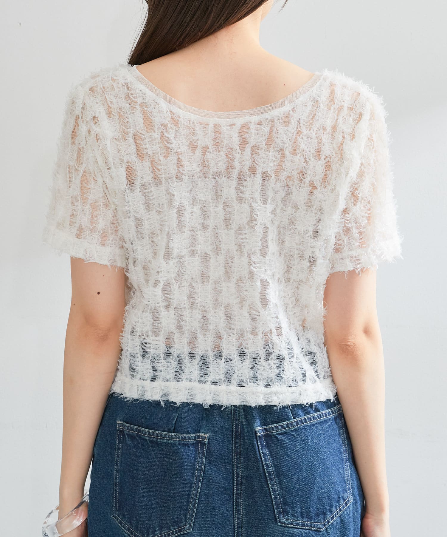 羽毛薄紗賦予了這件上衣女性化、成人化和可愛化的印象。