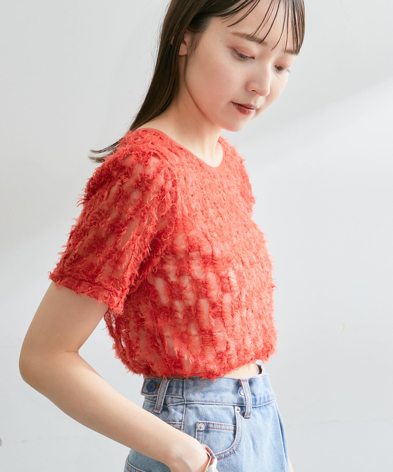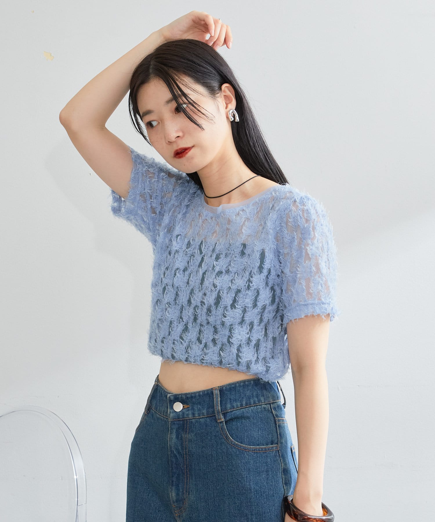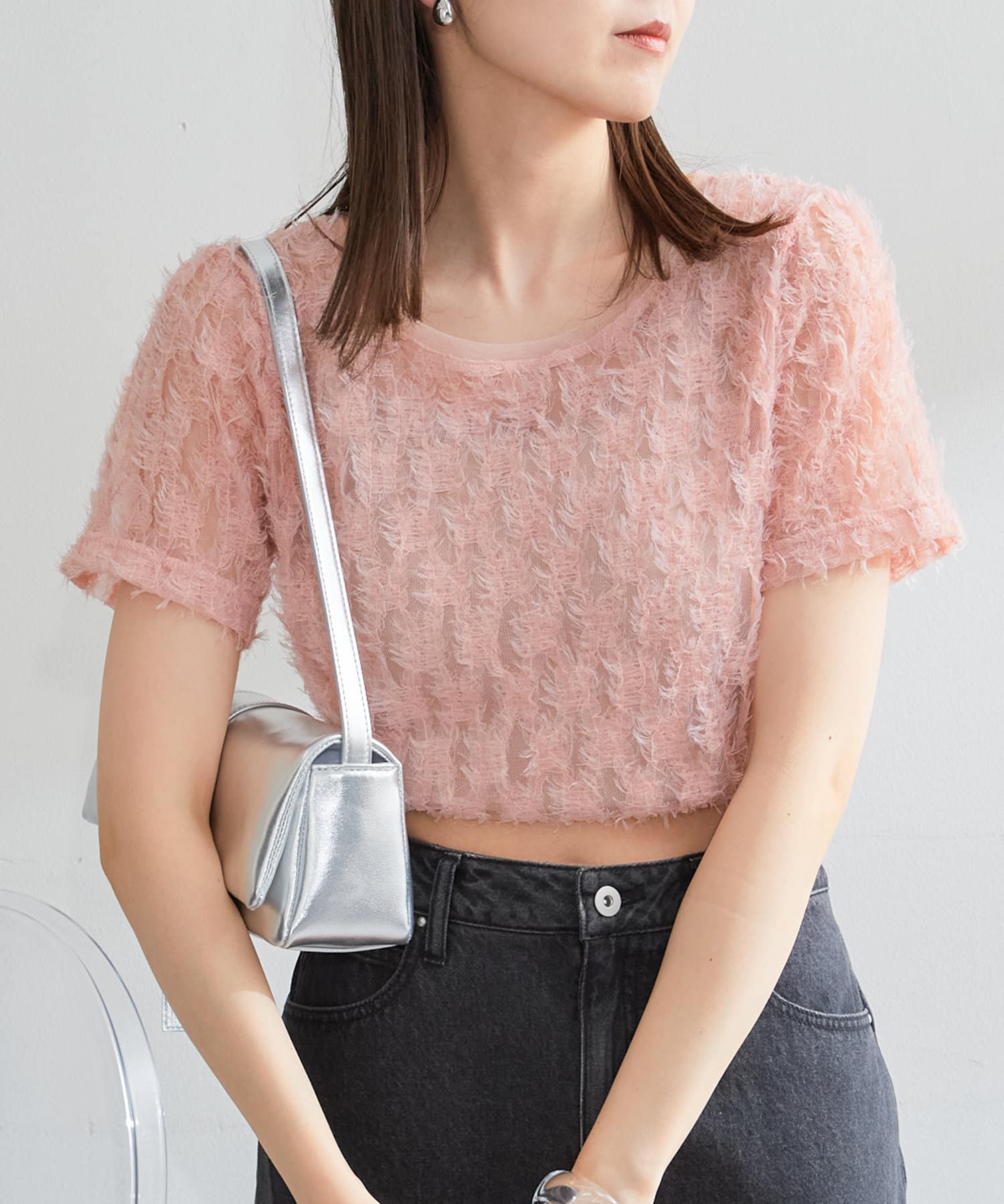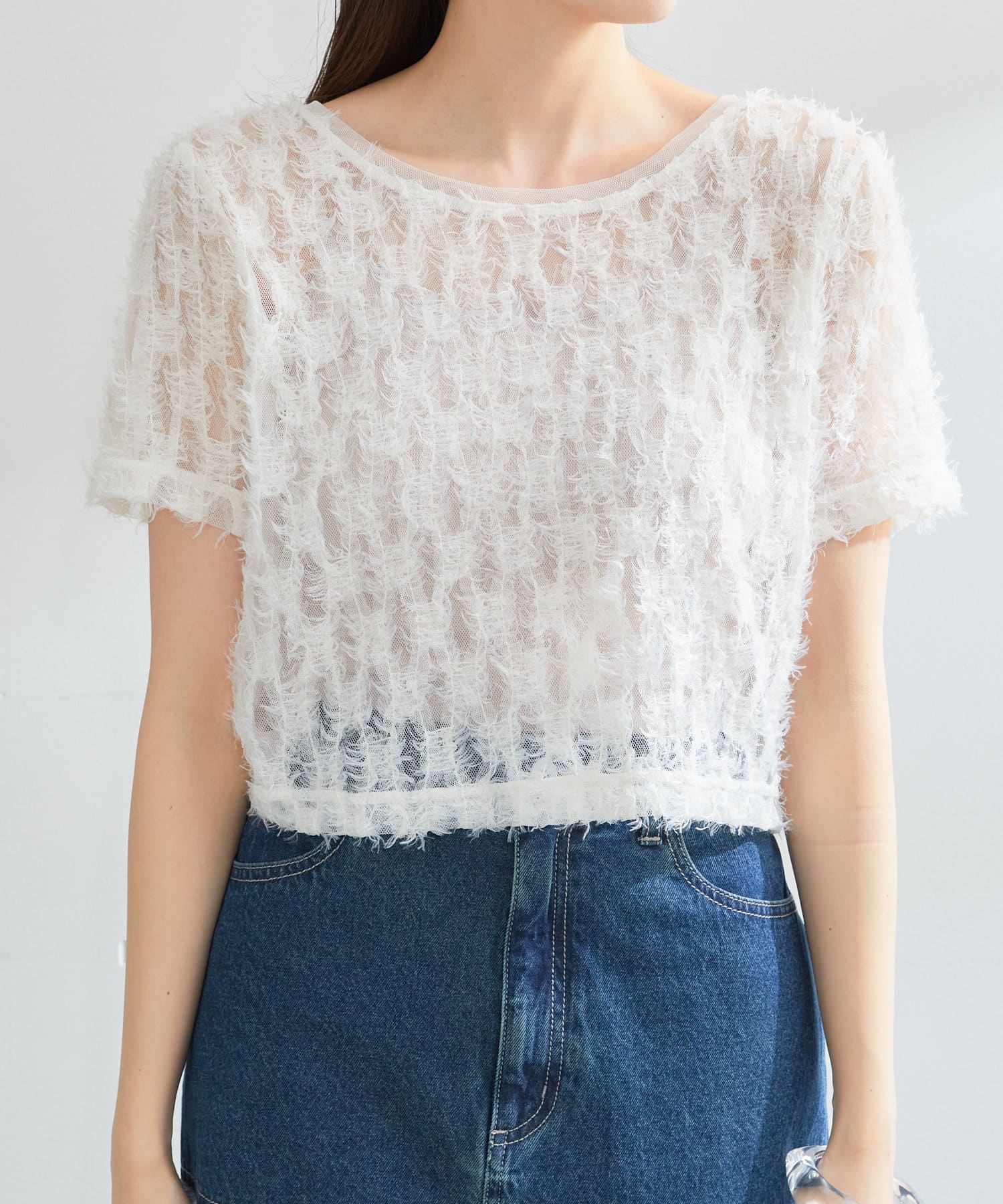 羽毛薄紗賦予了這件上衣女性化、成人化和可愛化的印象。