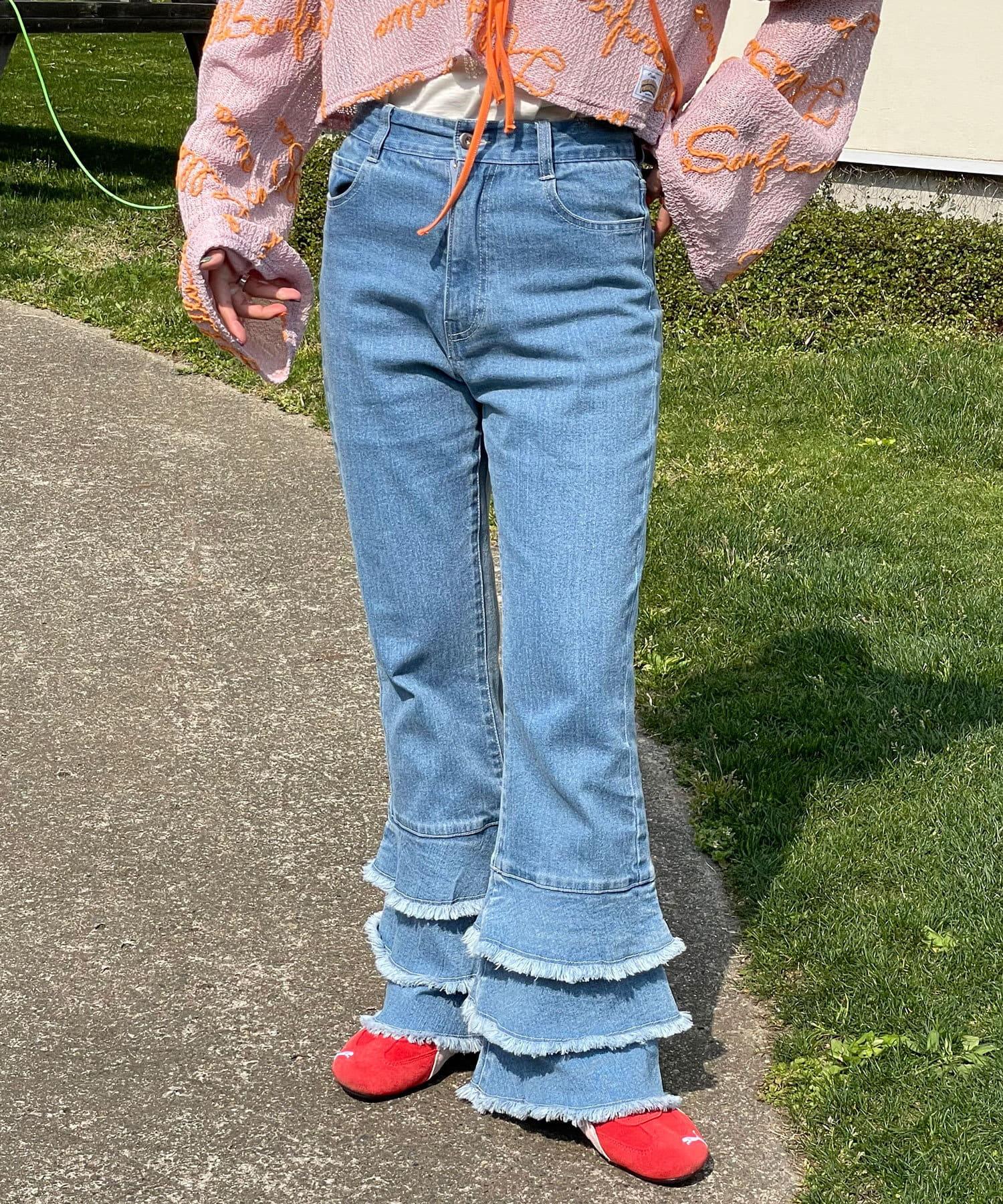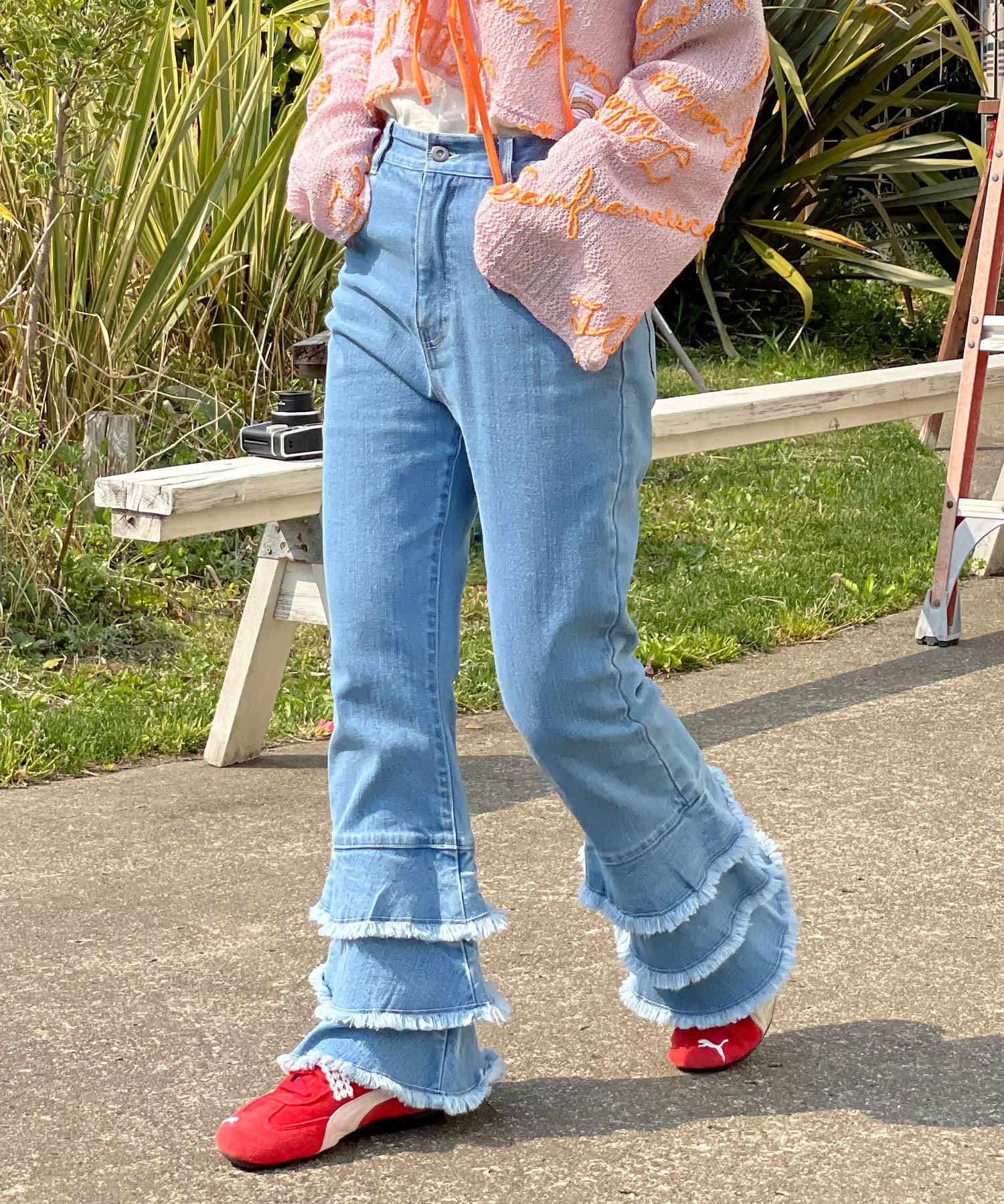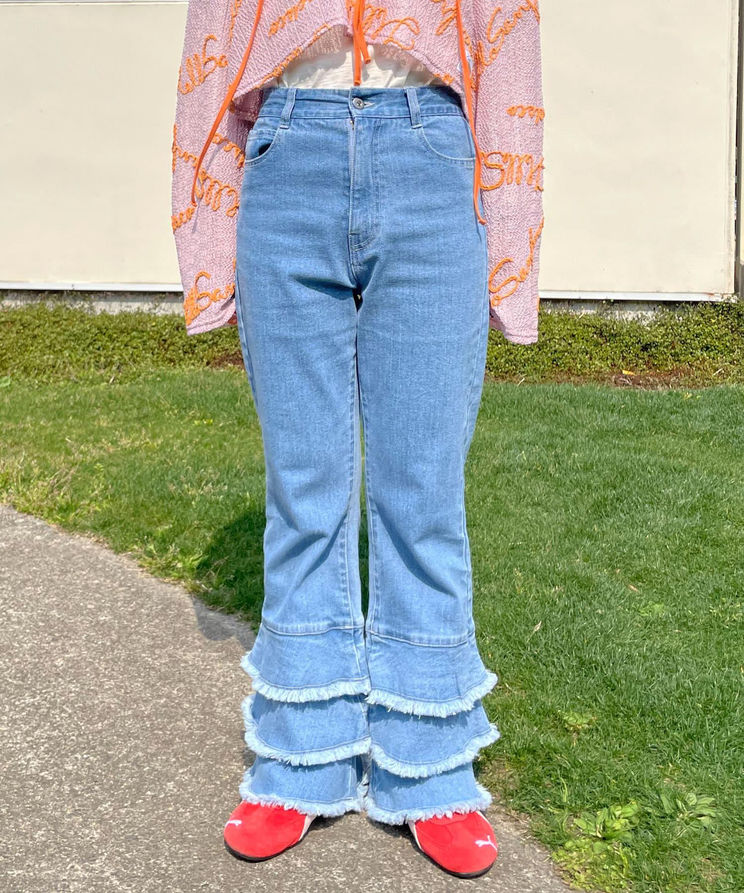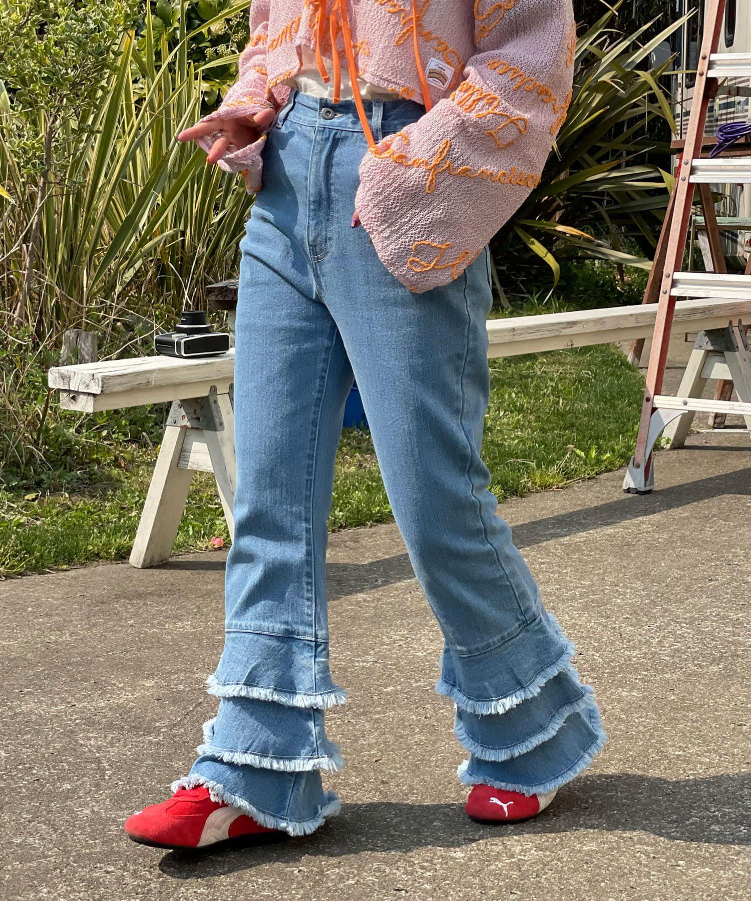 喇叭廓形牛仔長褲,三層荷葉邊下襬設計引人注目。