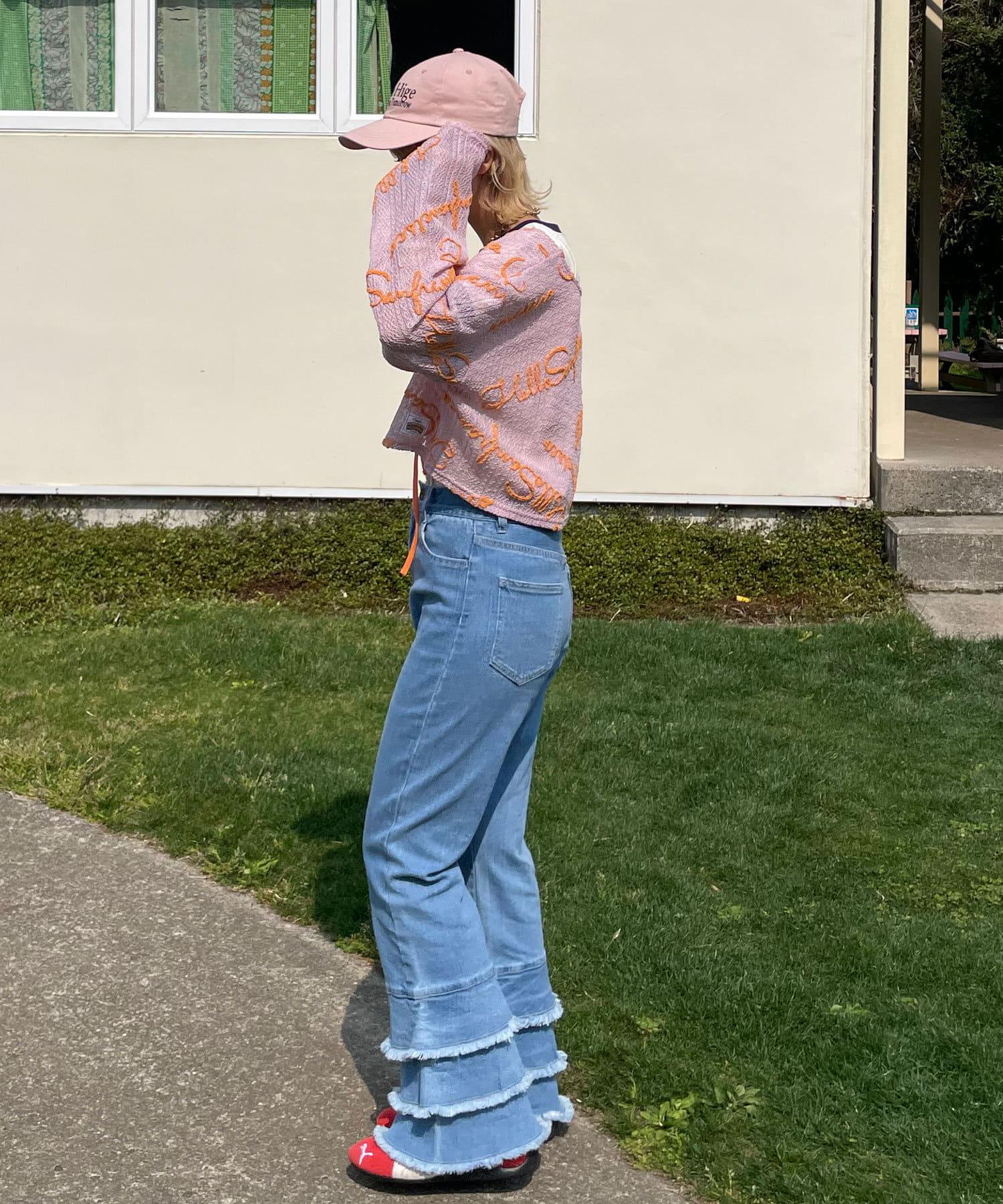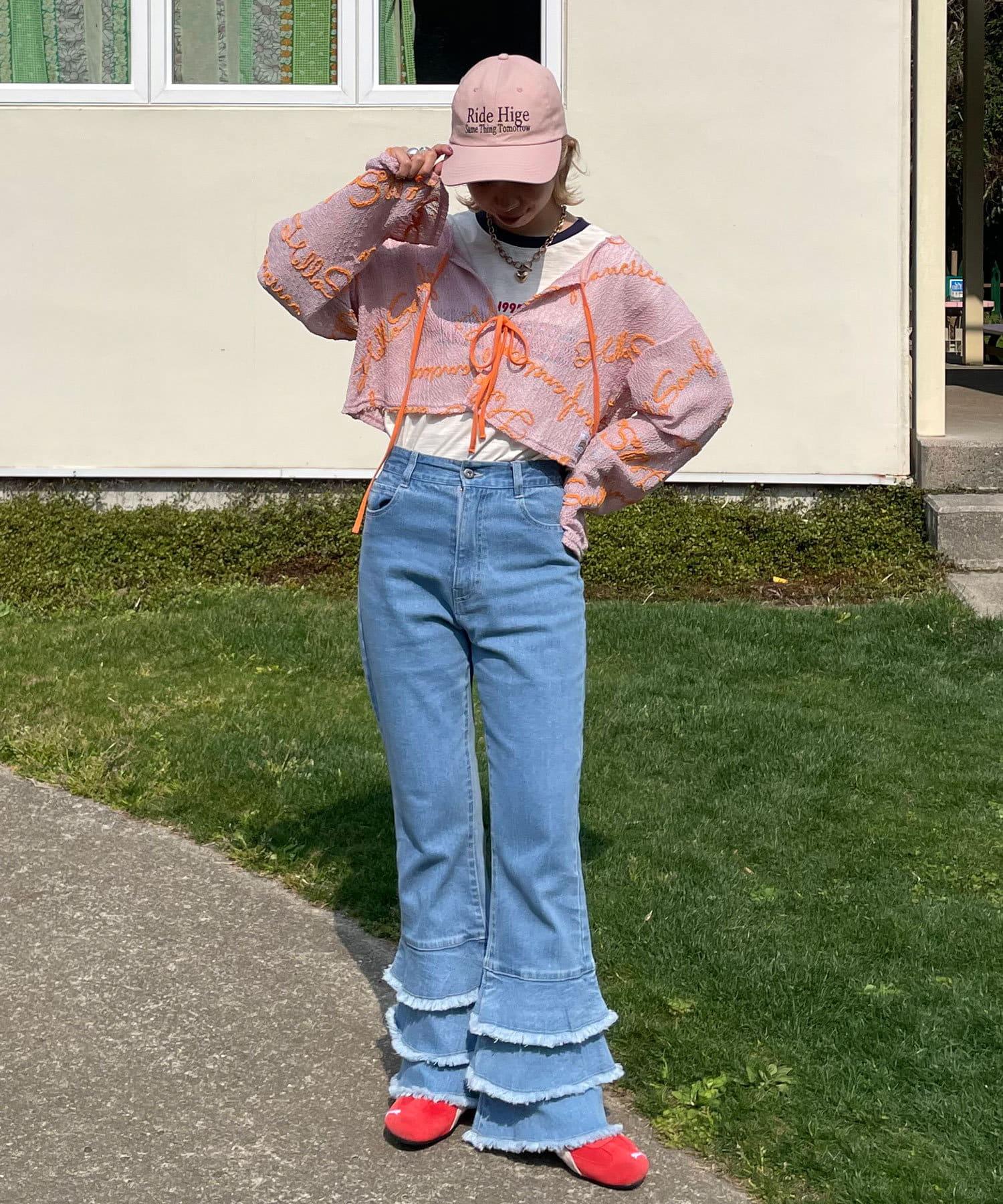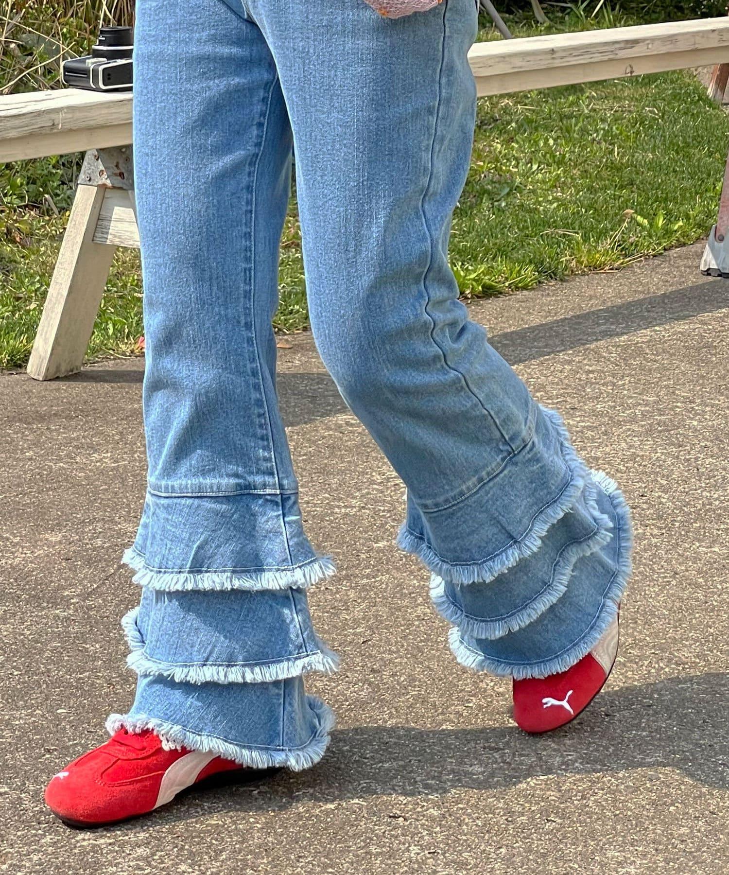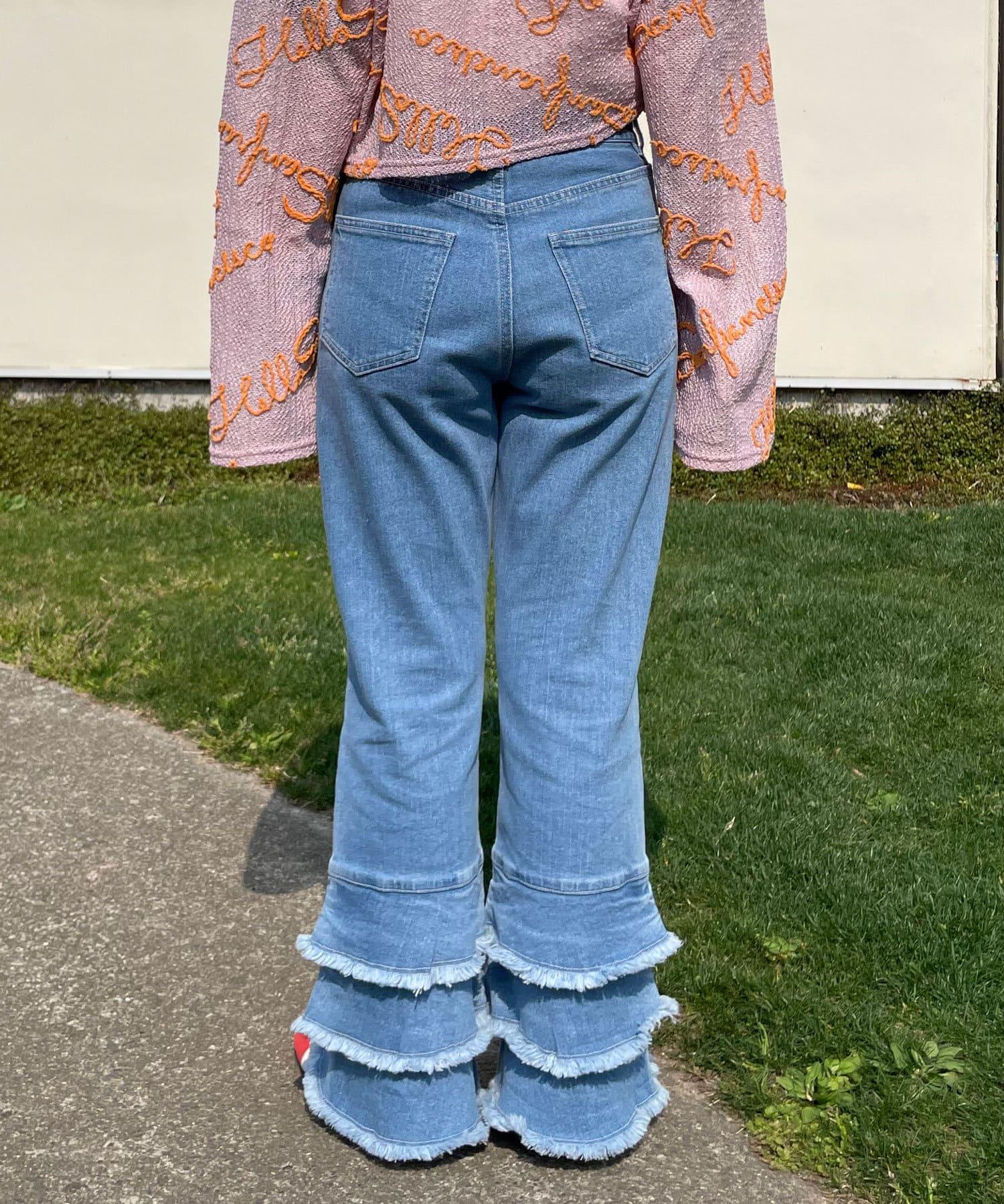 喇叭廓形牛仔長褲,三層荷葉邊下襬設計引人注目。