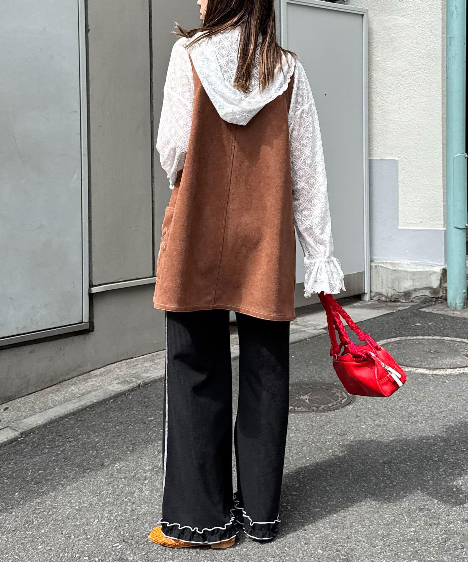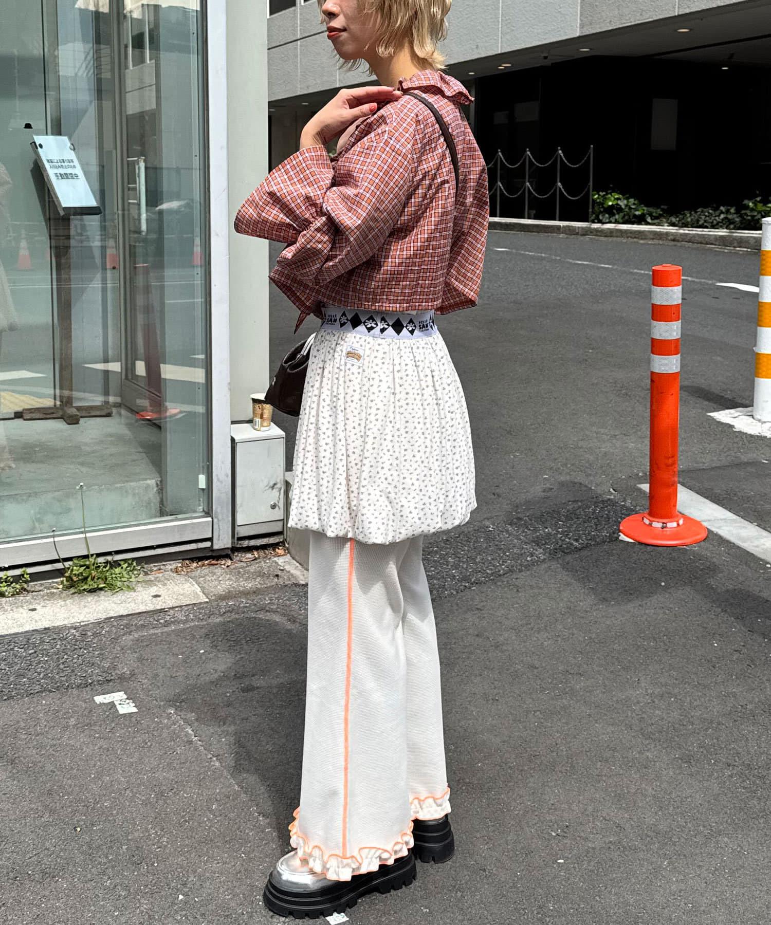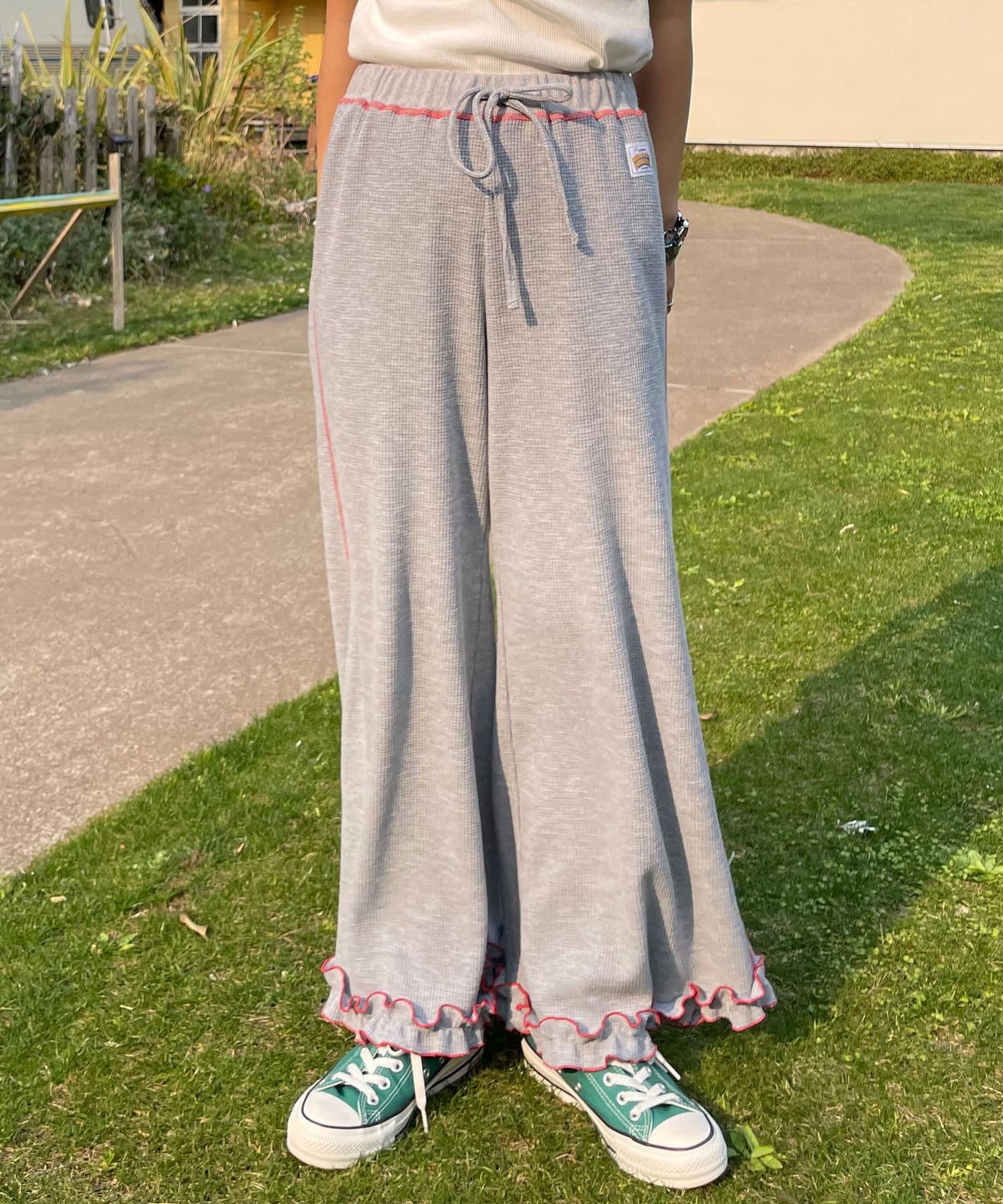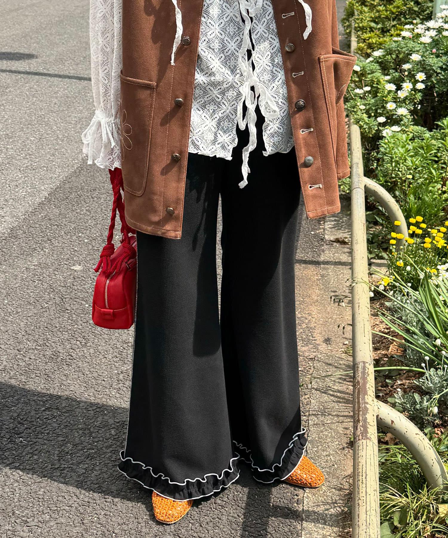 喇叭廓形適度展開,使腿部線條更加簡潔,下襬處的圓潤流蘇更添點睛之筆。腰部完全鬆緊設計,穿著毫無壓力。