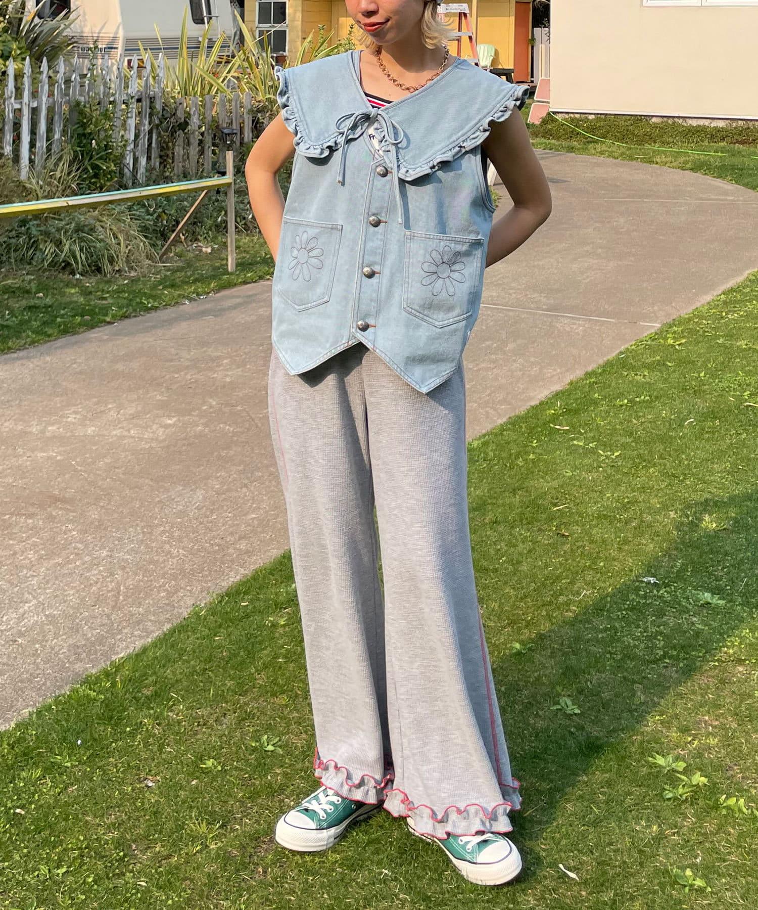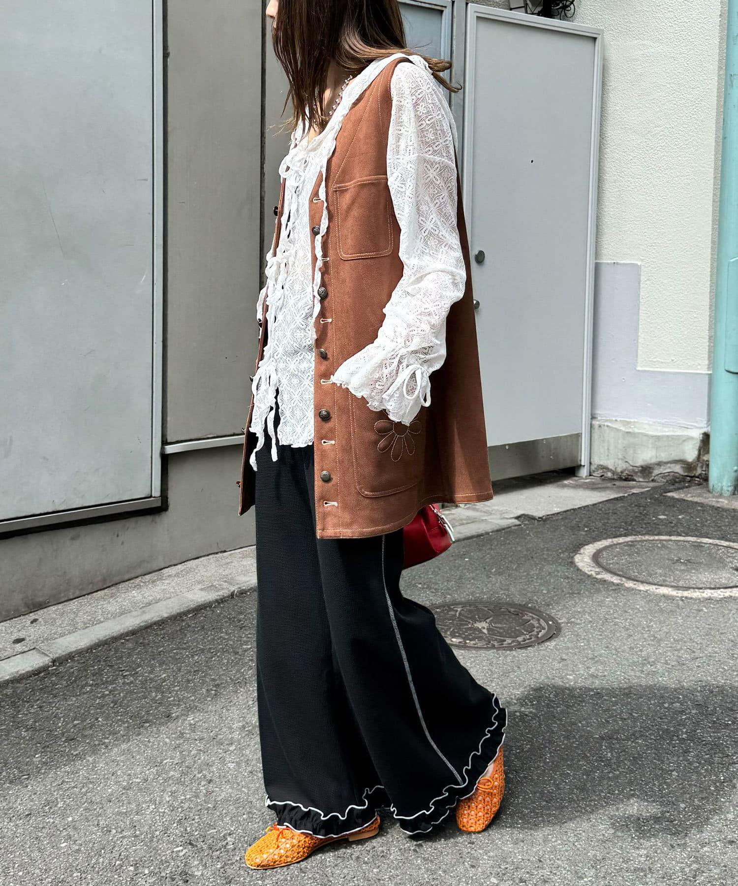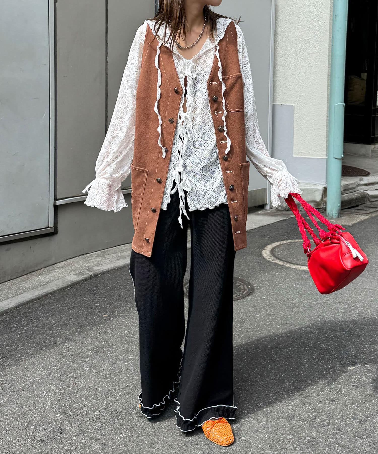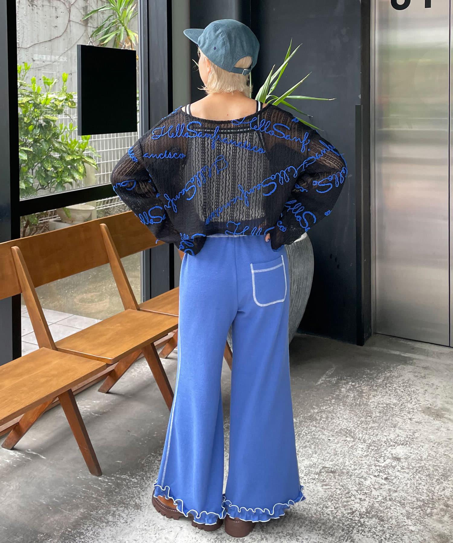 喇叭廓形適度展開,使腿部線條更加簡潔,下襬處的圓潤流蘇更添點睛之筆。腰部完全鬆緊設計,穿著毫無壓力。