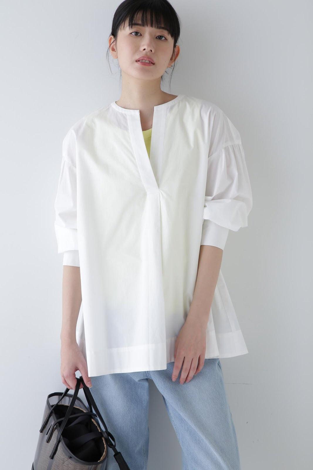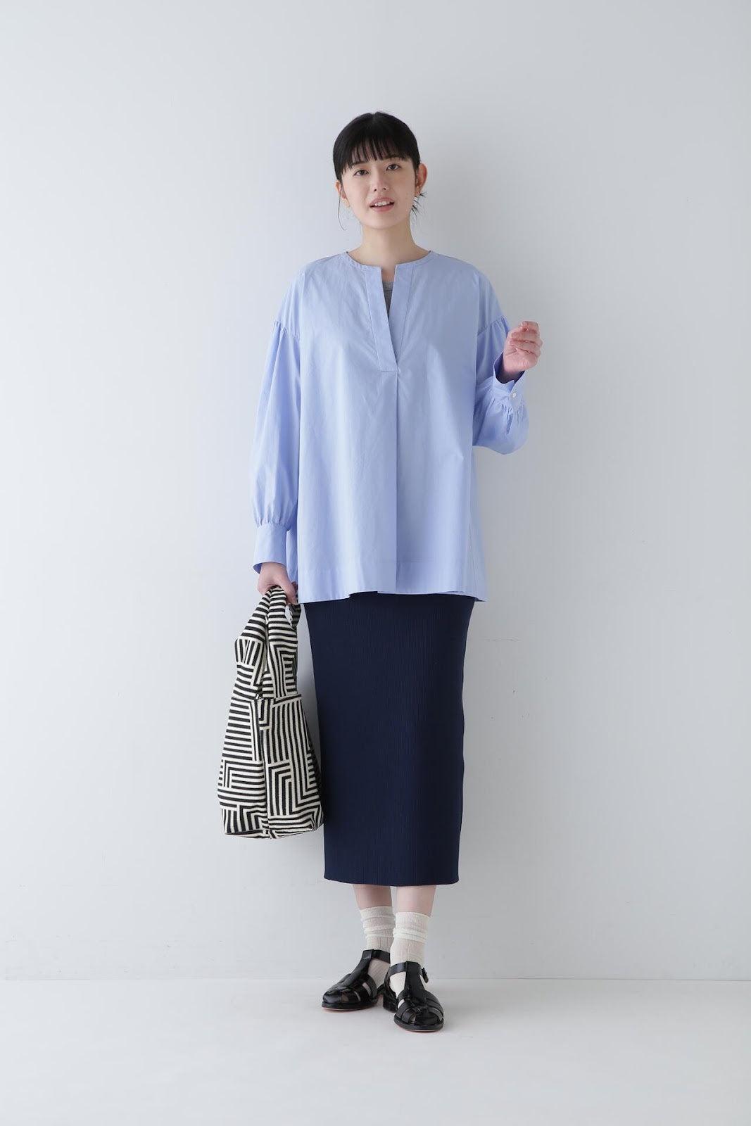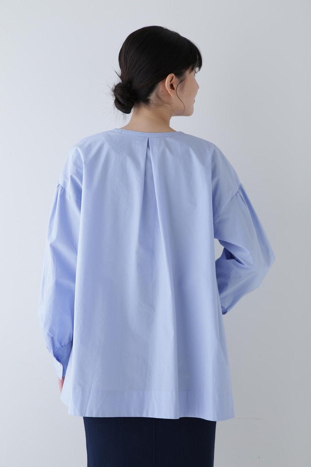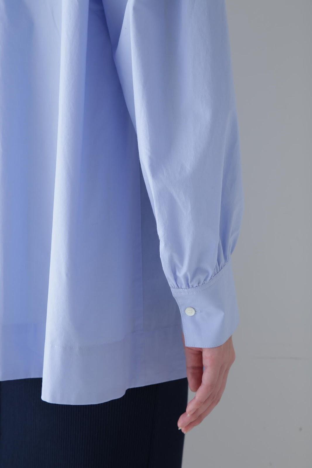 一款打字機襯衫,在女性的慵懶和男性化材質之間取得了很好的平衡 [設計特色] 長袖襯衫,採用寬鬆的喇叭廓形。圓領設計給人寬鬆的感覺。喇叭廓形和肩部的褶皺使其細節略顯甜美,但面料和袖口又使其兼顧了男人味。面料輕薄、高密度,美麗的表面之間具有良好的回彈性。推薦搭配】該單品的長度位於臀線上,建議搭配修身長褲和緊身裙,或搭配半寬鬆長褲和大碼褲,打造粗獷氣質。是一款適合各種辦公場景和外出風格的單品。