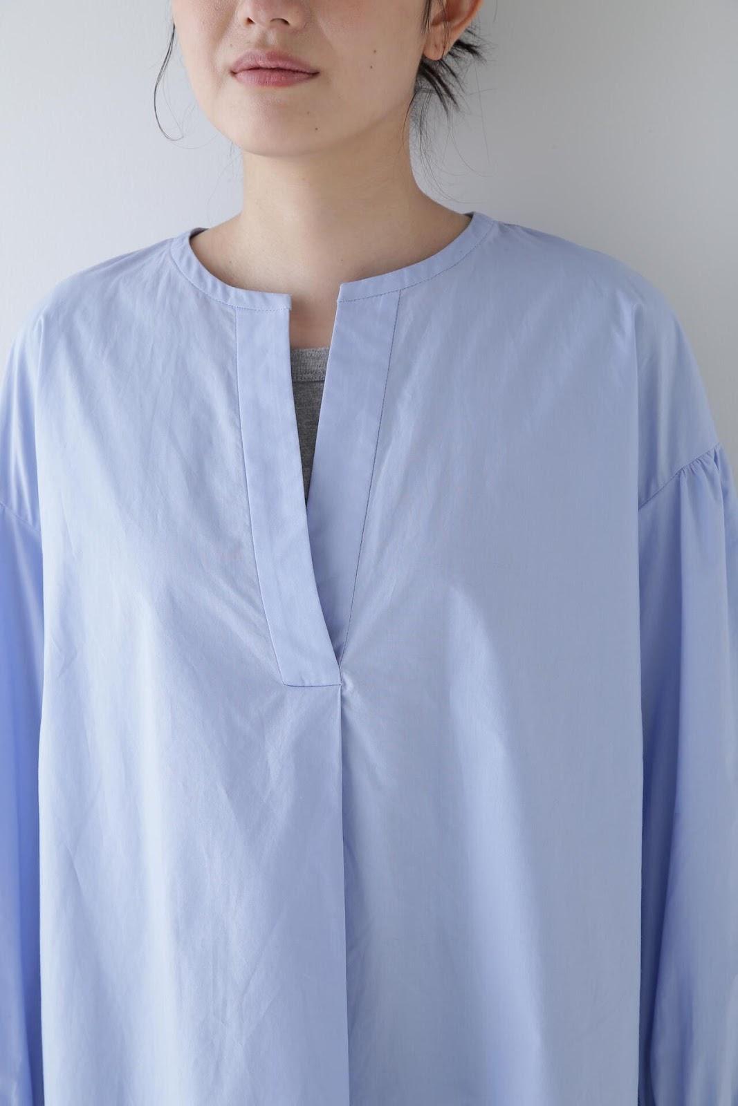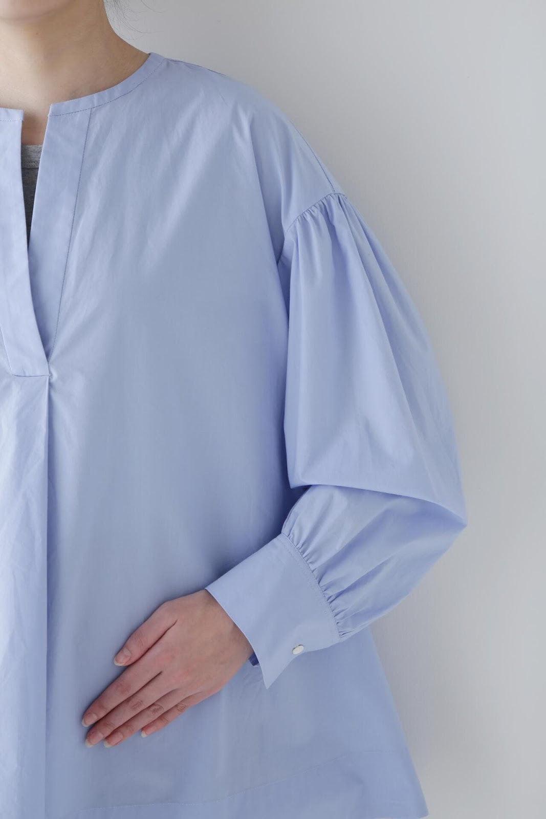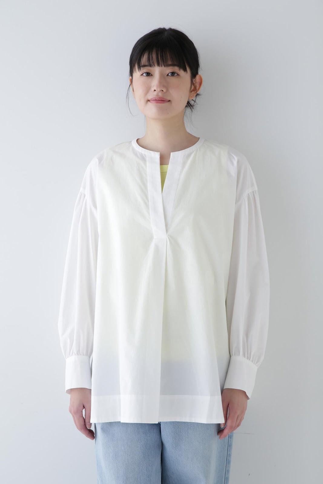 一款打字機襯衫,在女性的慵懶和男性化材質之間取得了很好的平衡 [設計特色] 長袖襯衫,採用寬鬆的喇叭廓形。圓領設計給人寬鬆的感覺。喇叭廓形和肩部的褶皺使其細節略顯甜美,但面料和袖口又使其兼顧了男人味。面料輕薄、高密度,美麗的表面之間具有良好的回彈性。推薦搭配】該單品的長度位於臀線上,建議搭配修身長褲和緊身裙,或搭配半寬鬆長褲和大碼褲,打造粗獷氣質。是一款適合各種辦公場景和外出風格的單品。