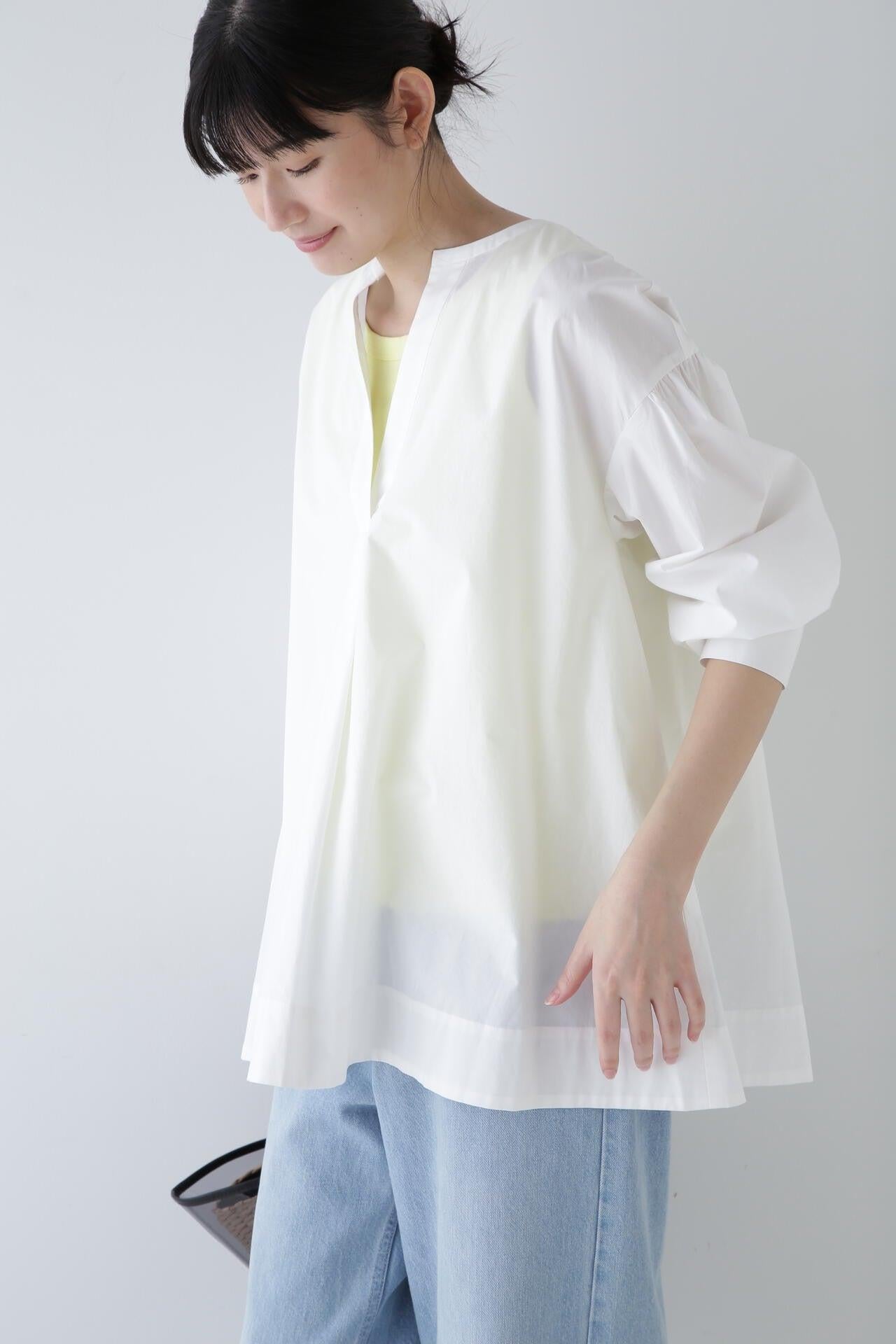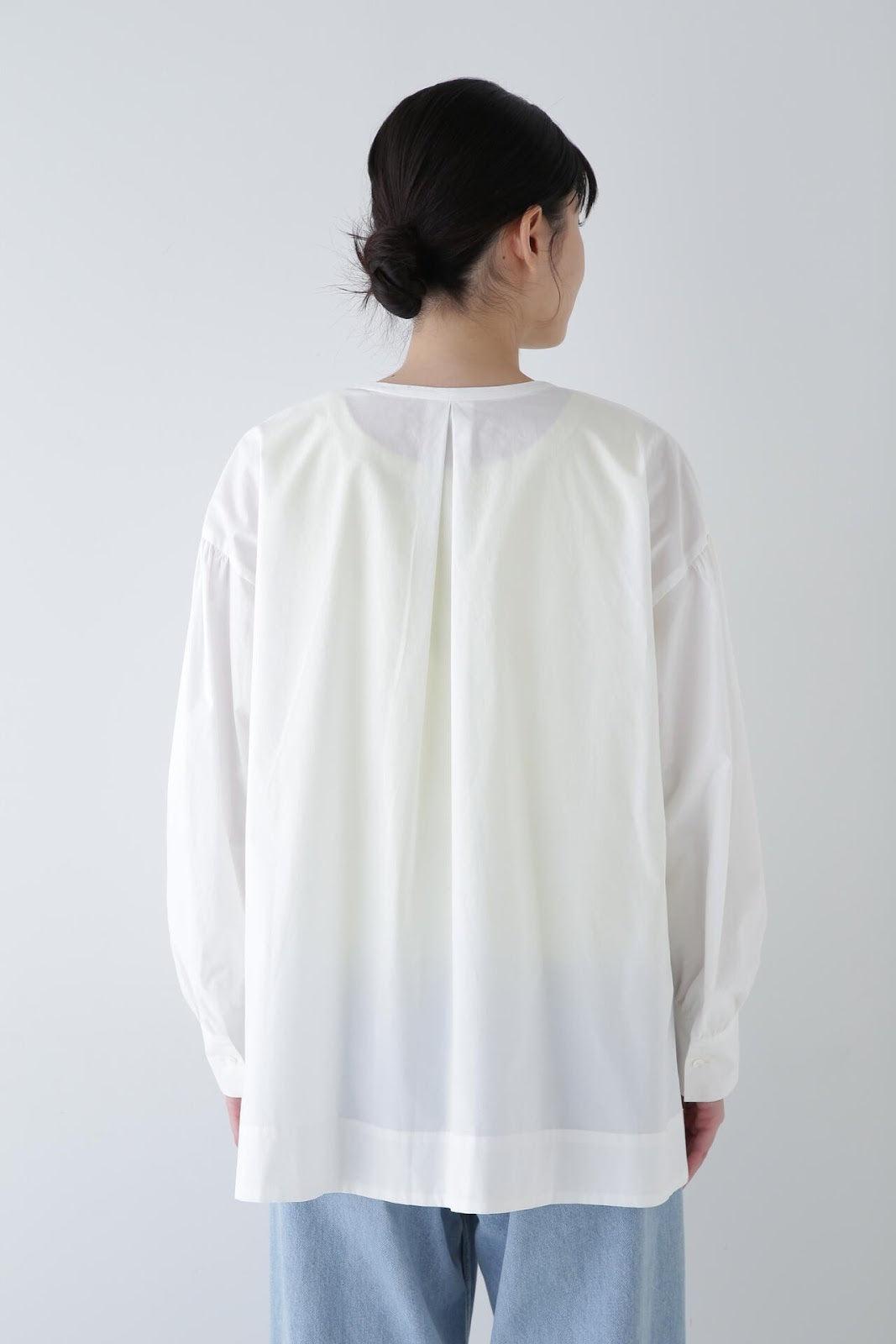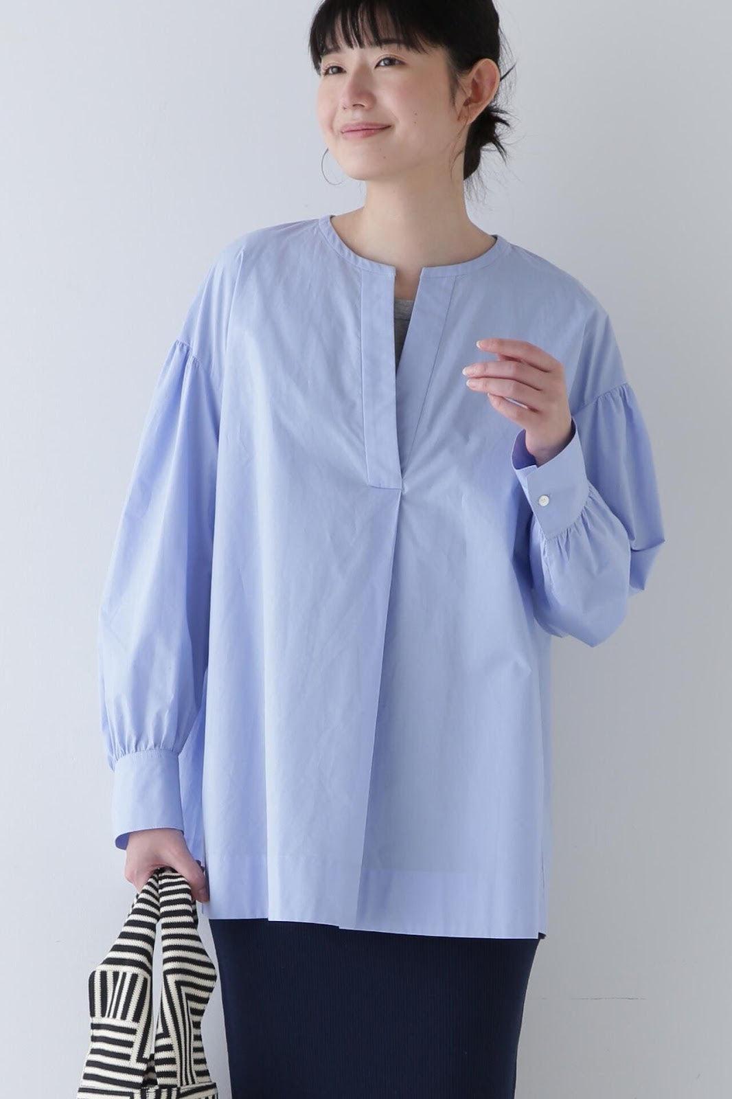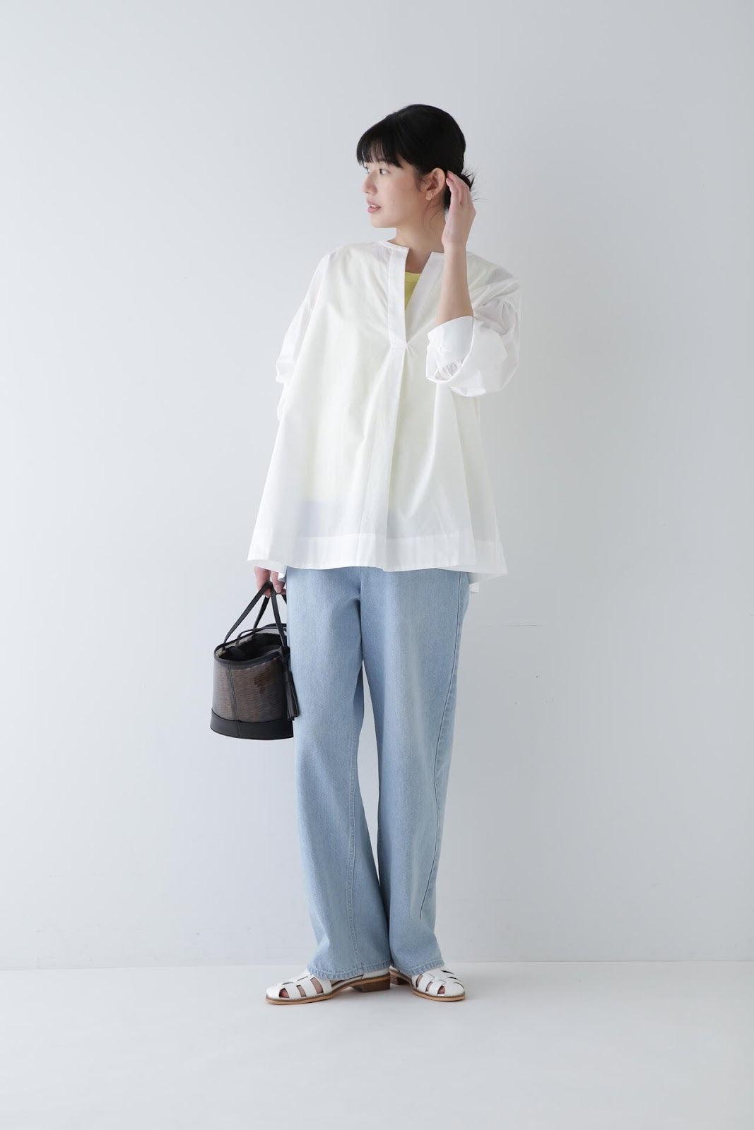 一款打字機襯衫,在女性的慵懶和男性化材質之間取得了很好的平衡 [設計特色] 長袖襯衫,採用寬鬆的喇叭廓形。圓領設計給人寬鬆的感覺。喇叭廓形和肩部的褶皺使其細節略顯甜美,但面料和袖口又使其兼顧了男人味。面料輕薄、高密度,美麗的表面之間具有良好的回彈性。推薦搭配】該單品的長度位於臀線上,建議搭配修身長褲和緊身裙,或搭配半寬鬆長褲和大碼褲,打造粗獷氣質。是一款適合各種辦公場景和外出風格的單品。