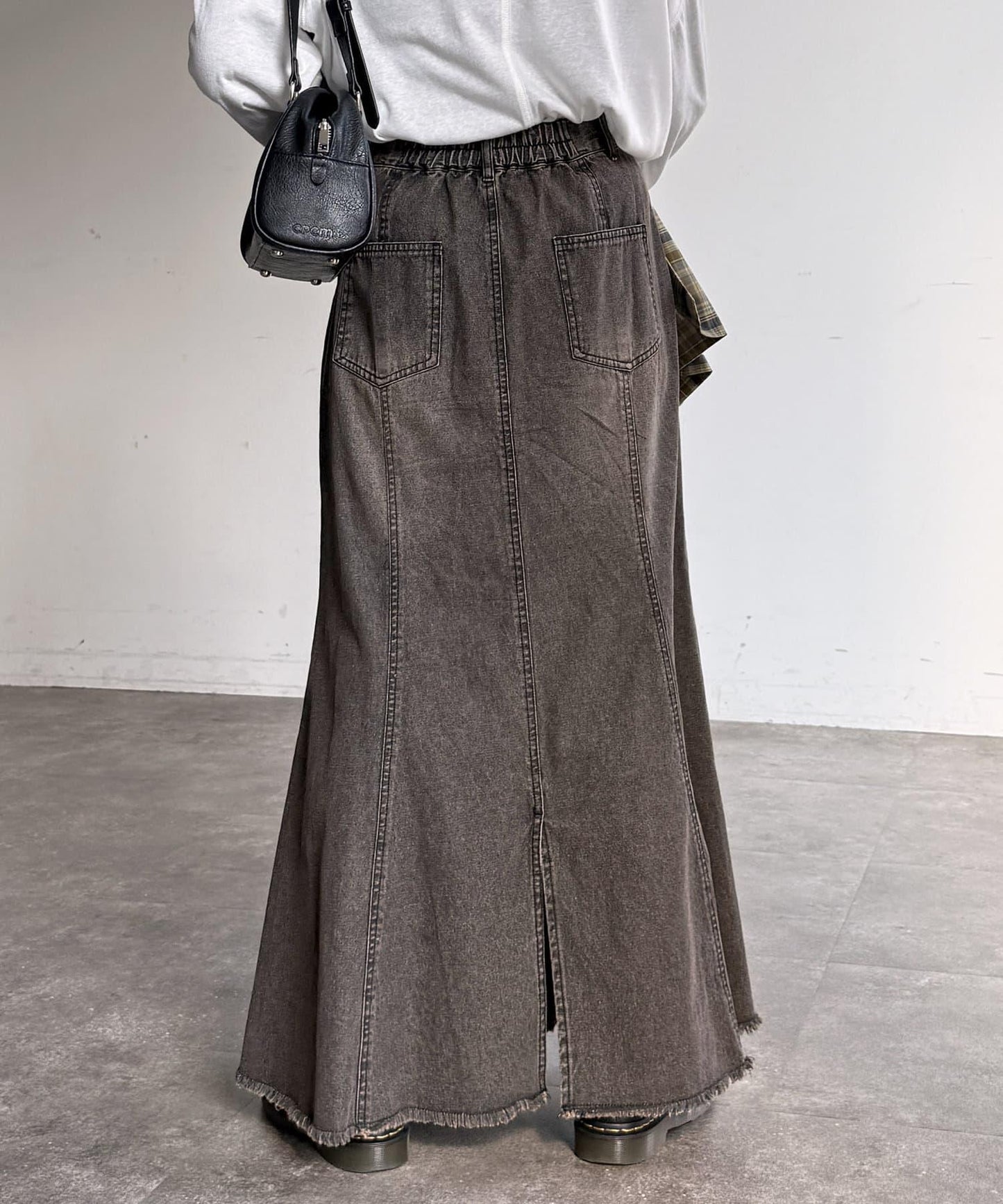 腰部的鬆緊帶只在後部,穿起來很方便,從前面看也很時尚。