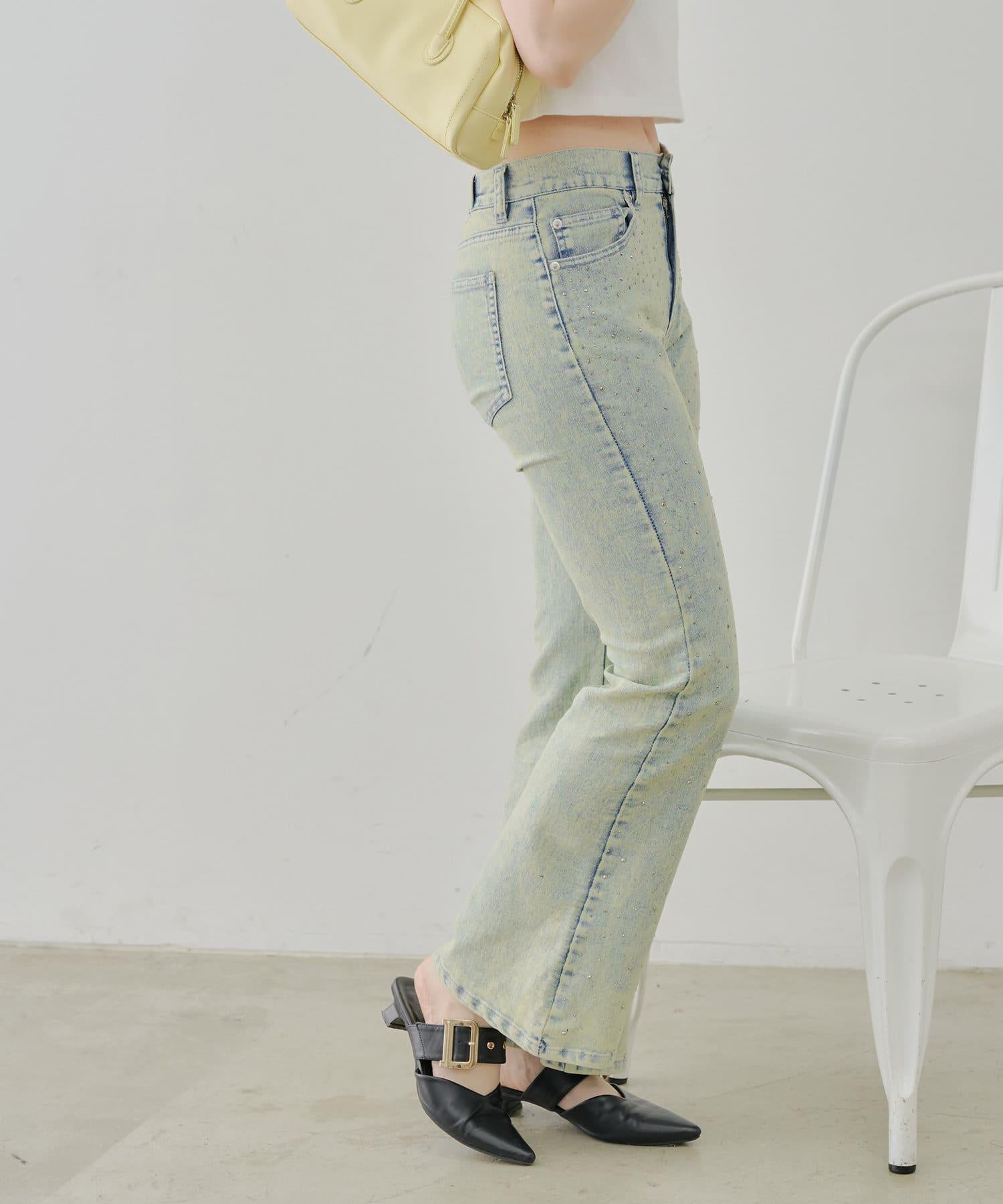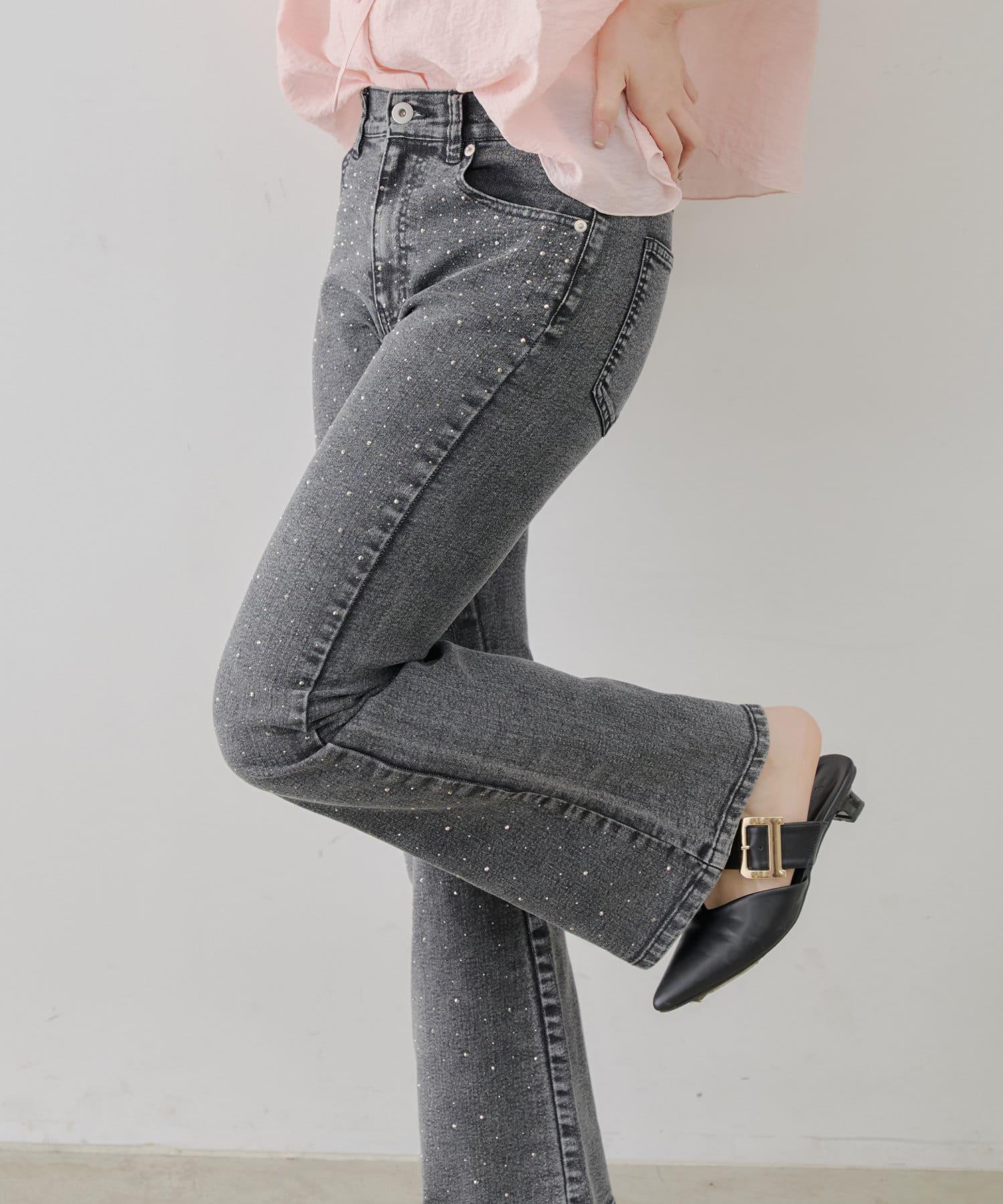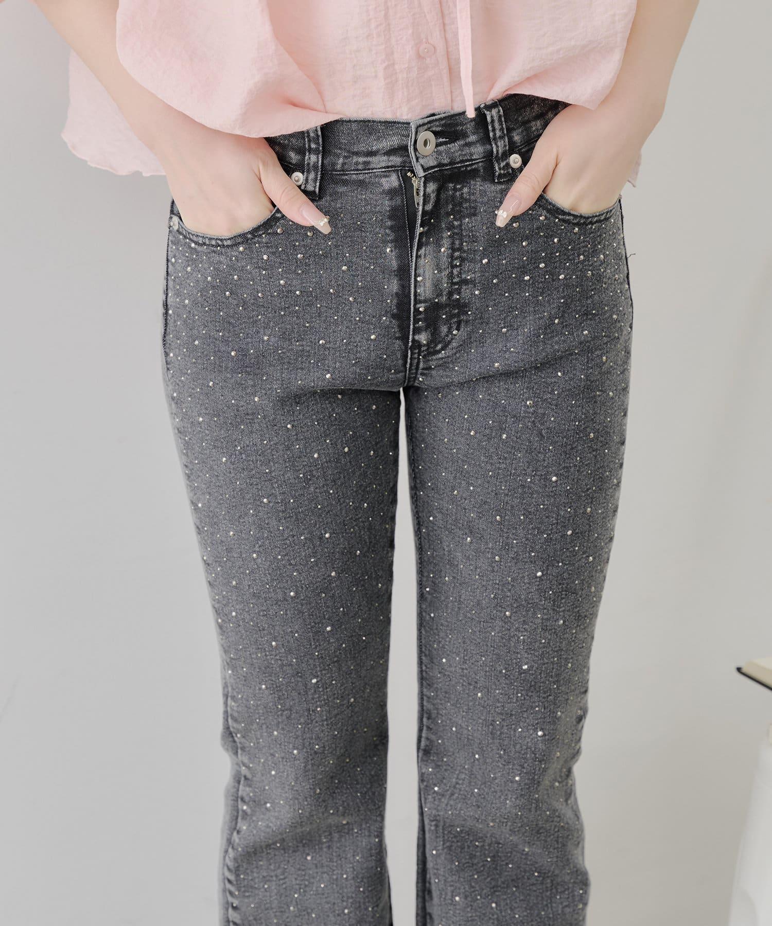 牛仔喇叭褲,鑲有水鑽,走起路來閃閃發光。