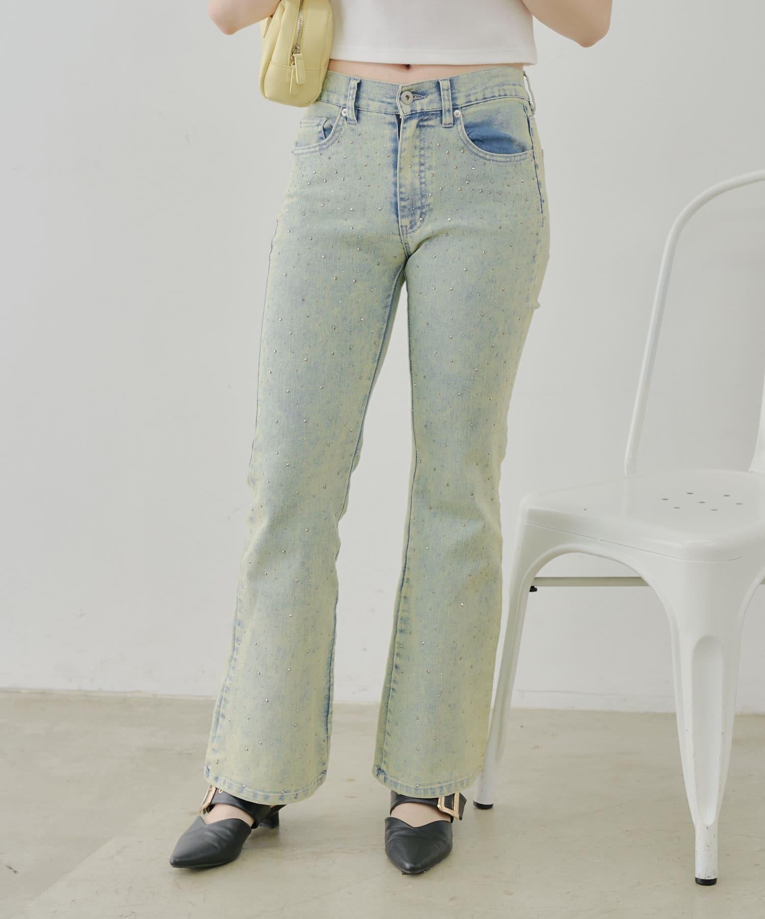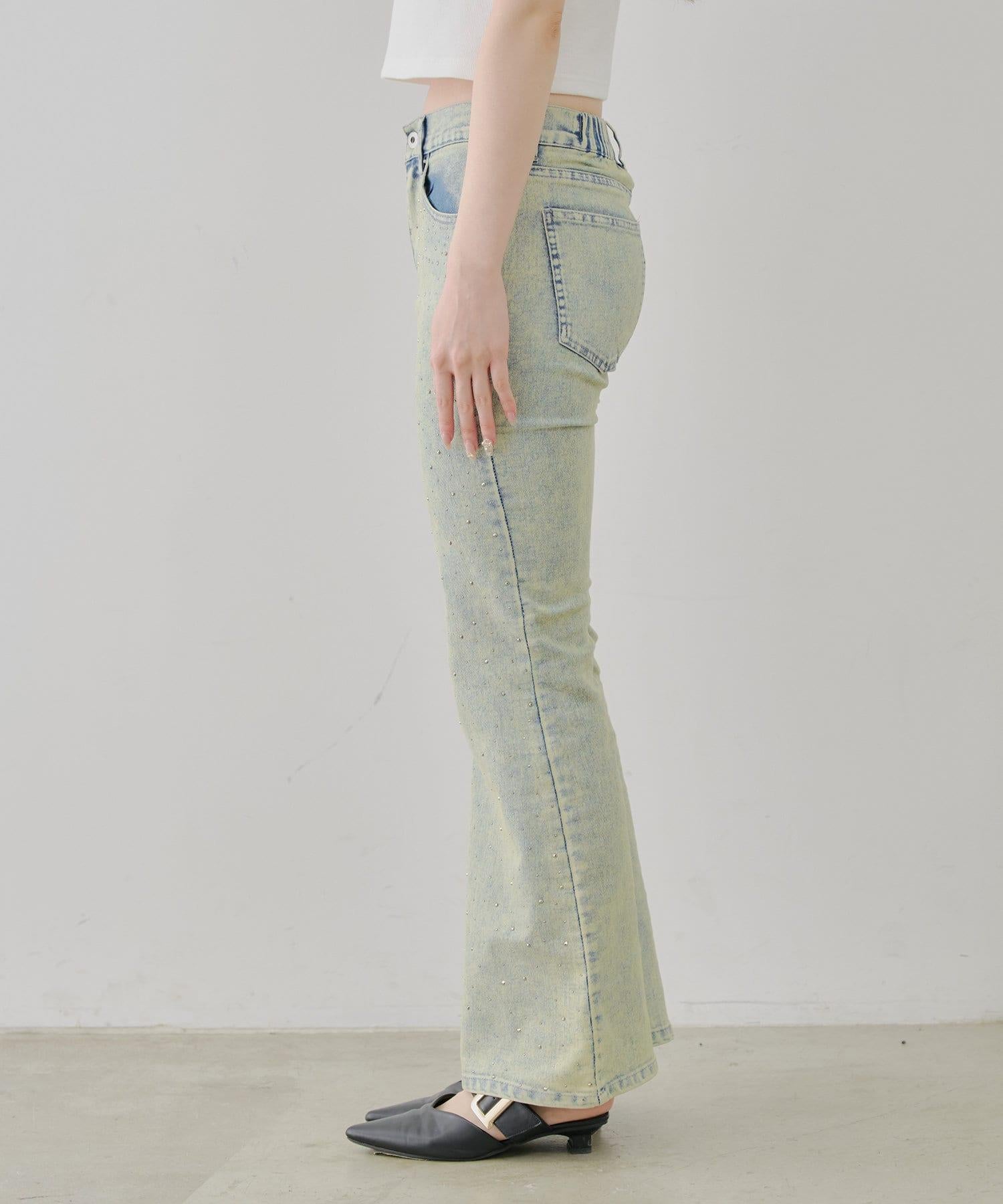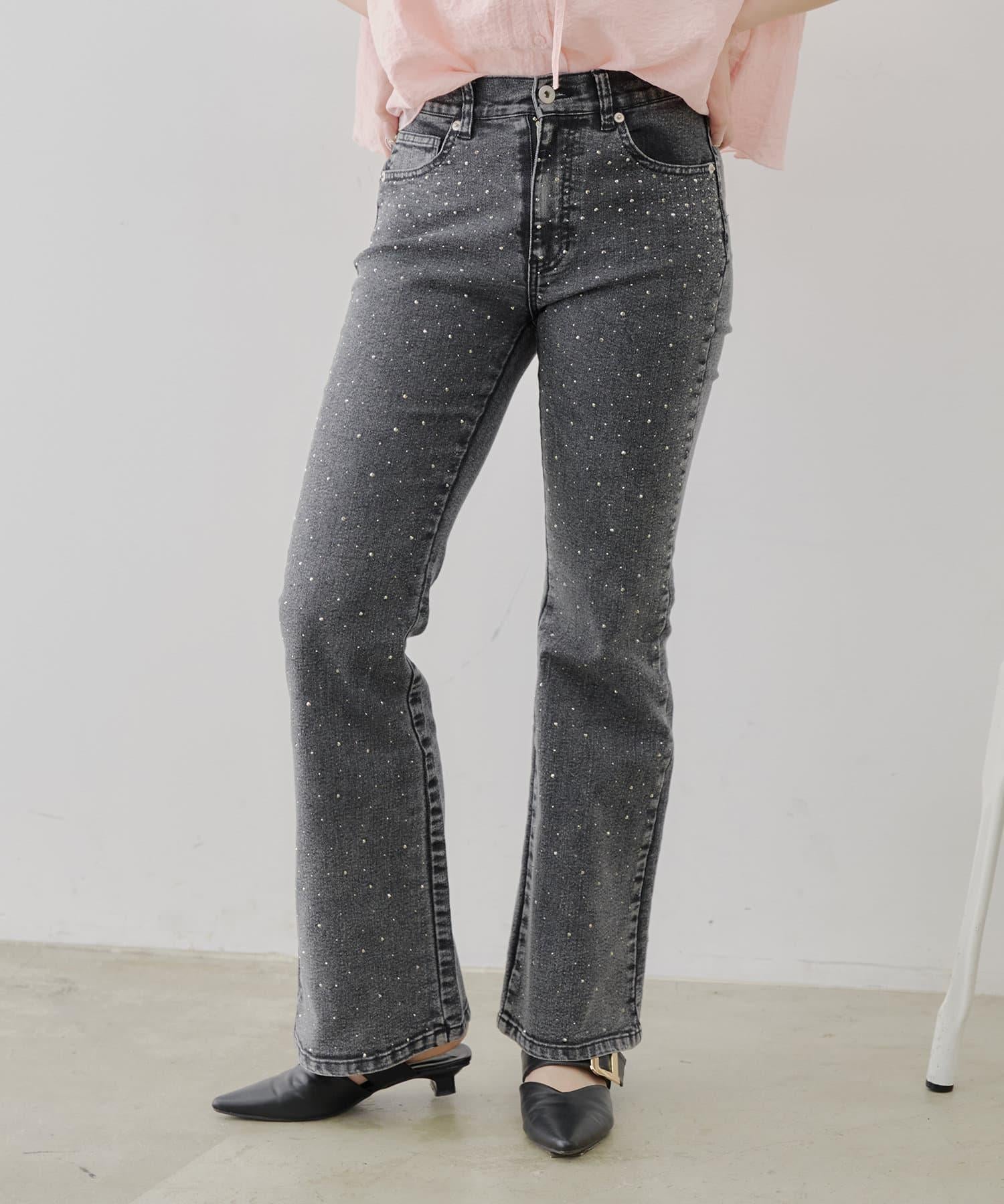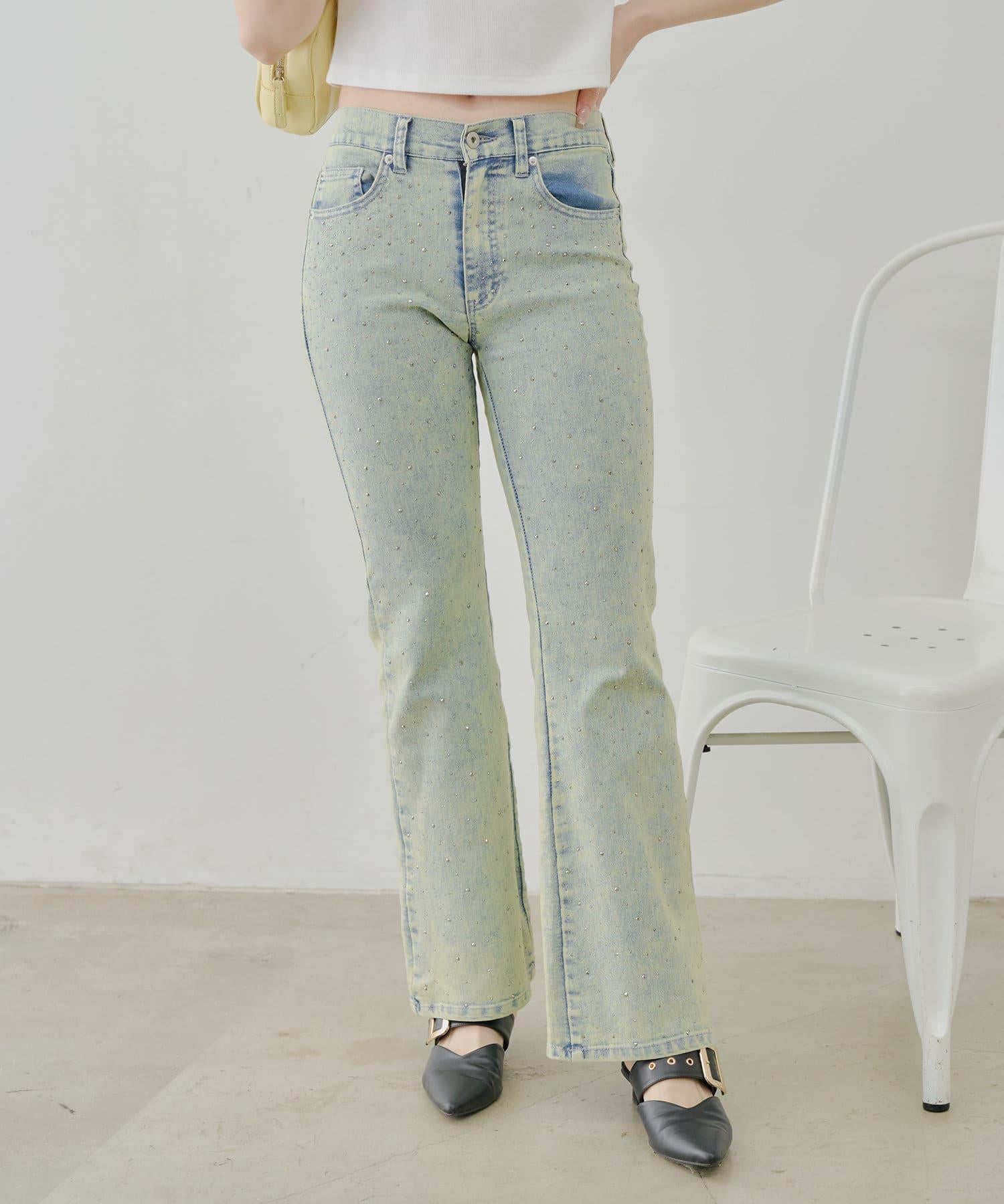牛仔喇叭褲,鑲有水鑽,走起路來閃閃發光。
