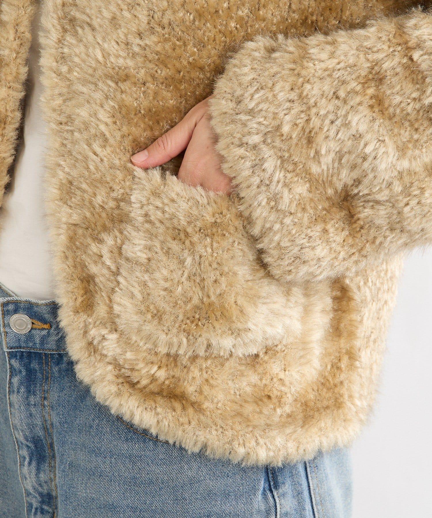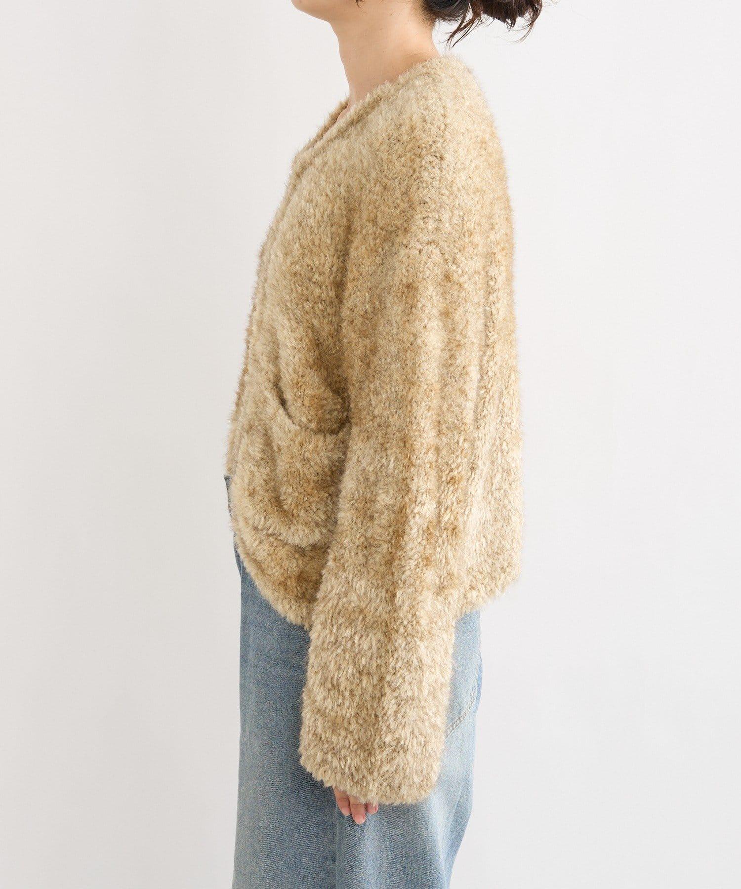 一款具有皮草外套質感的針織外套。