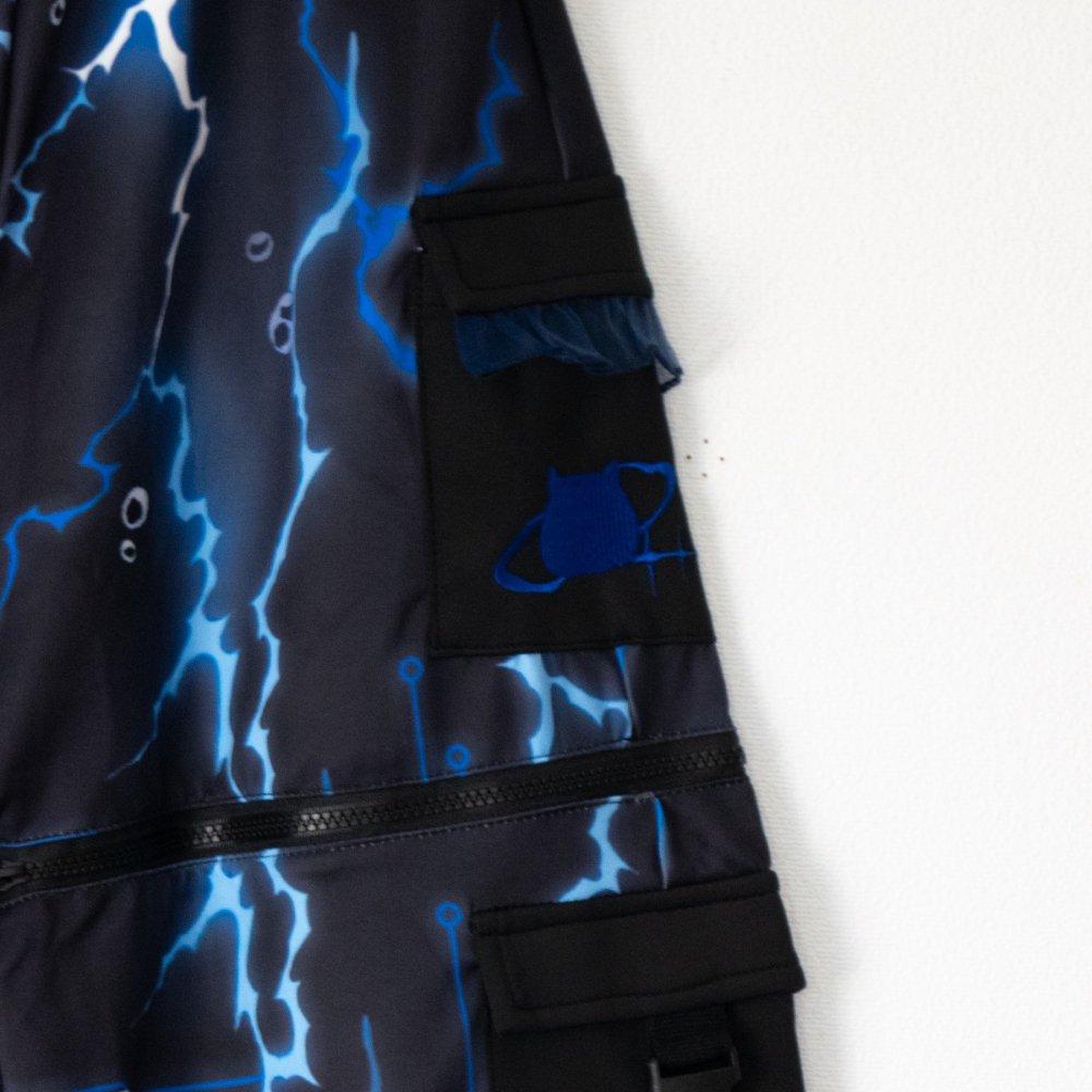 [細節] 網絡長褲配有腰帶、刺繡和拉鍊。