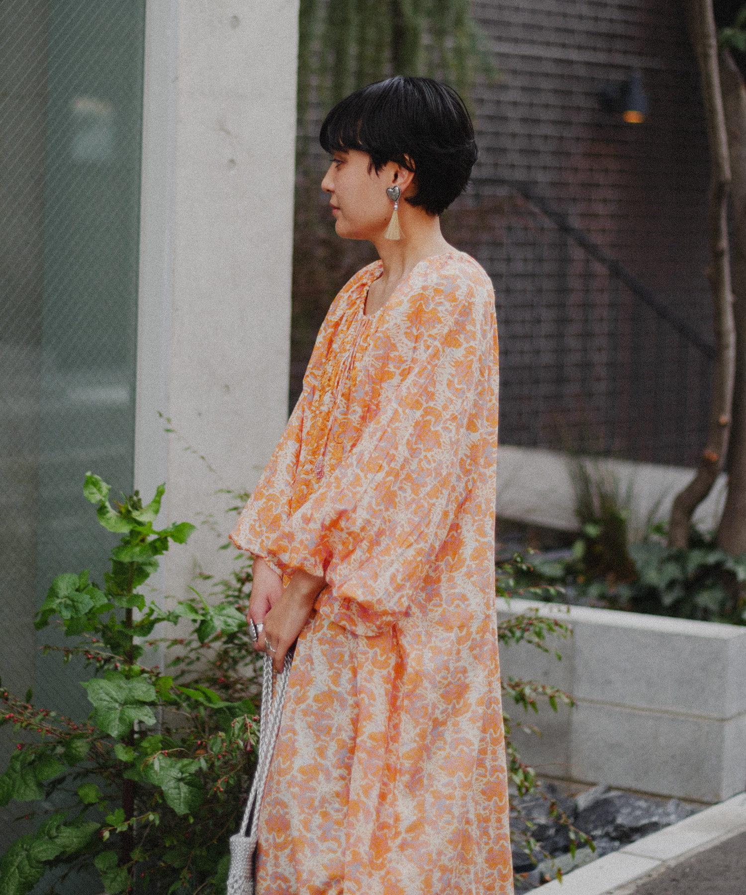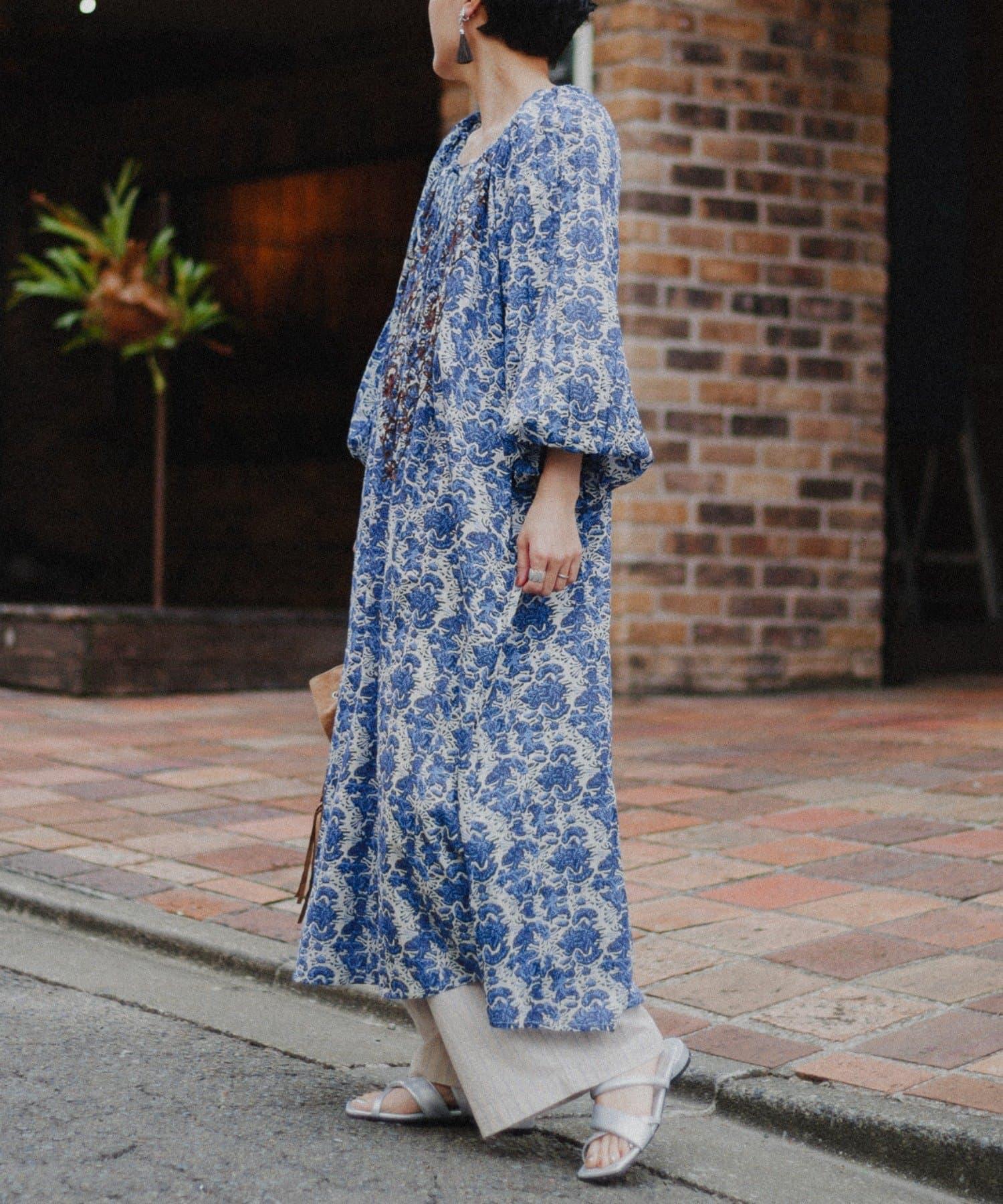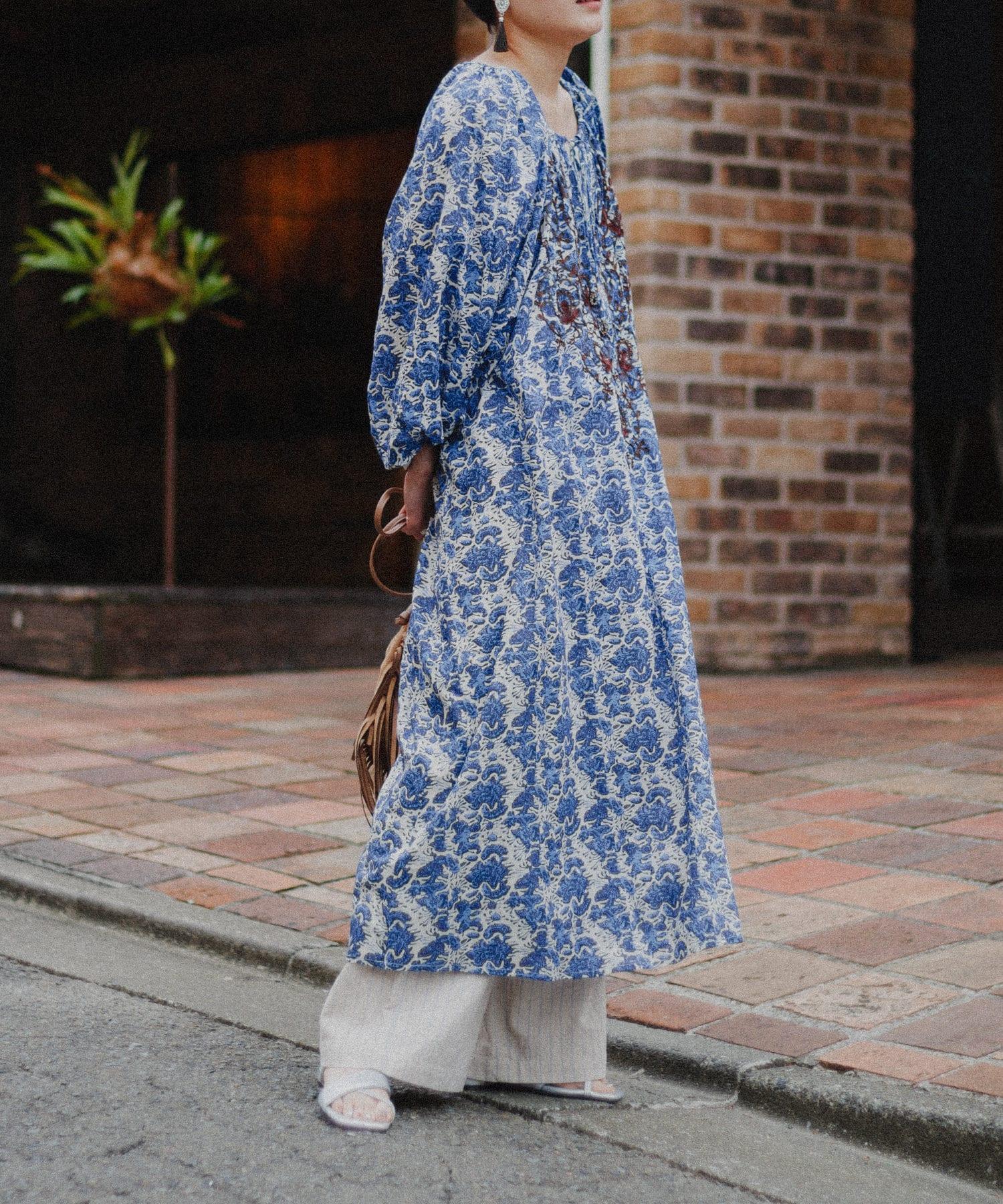 復古風格的花朵圖案和優雅細節。精緻平衡的長裙。