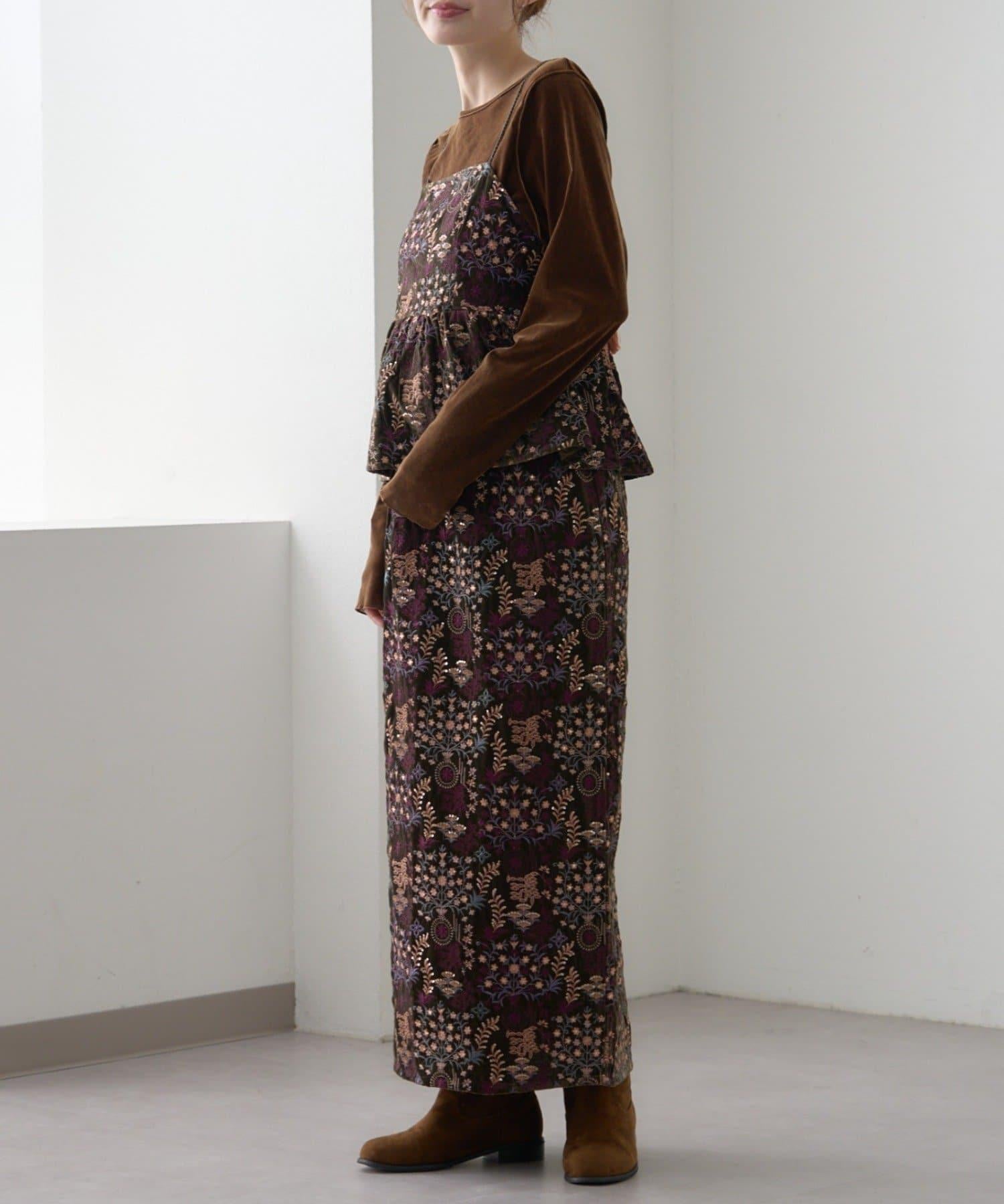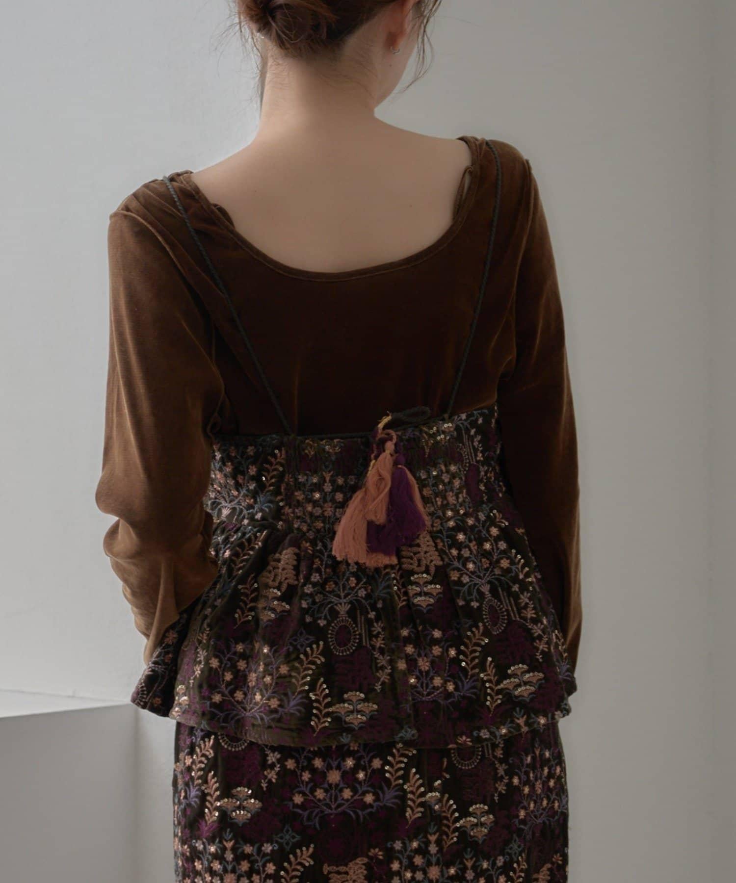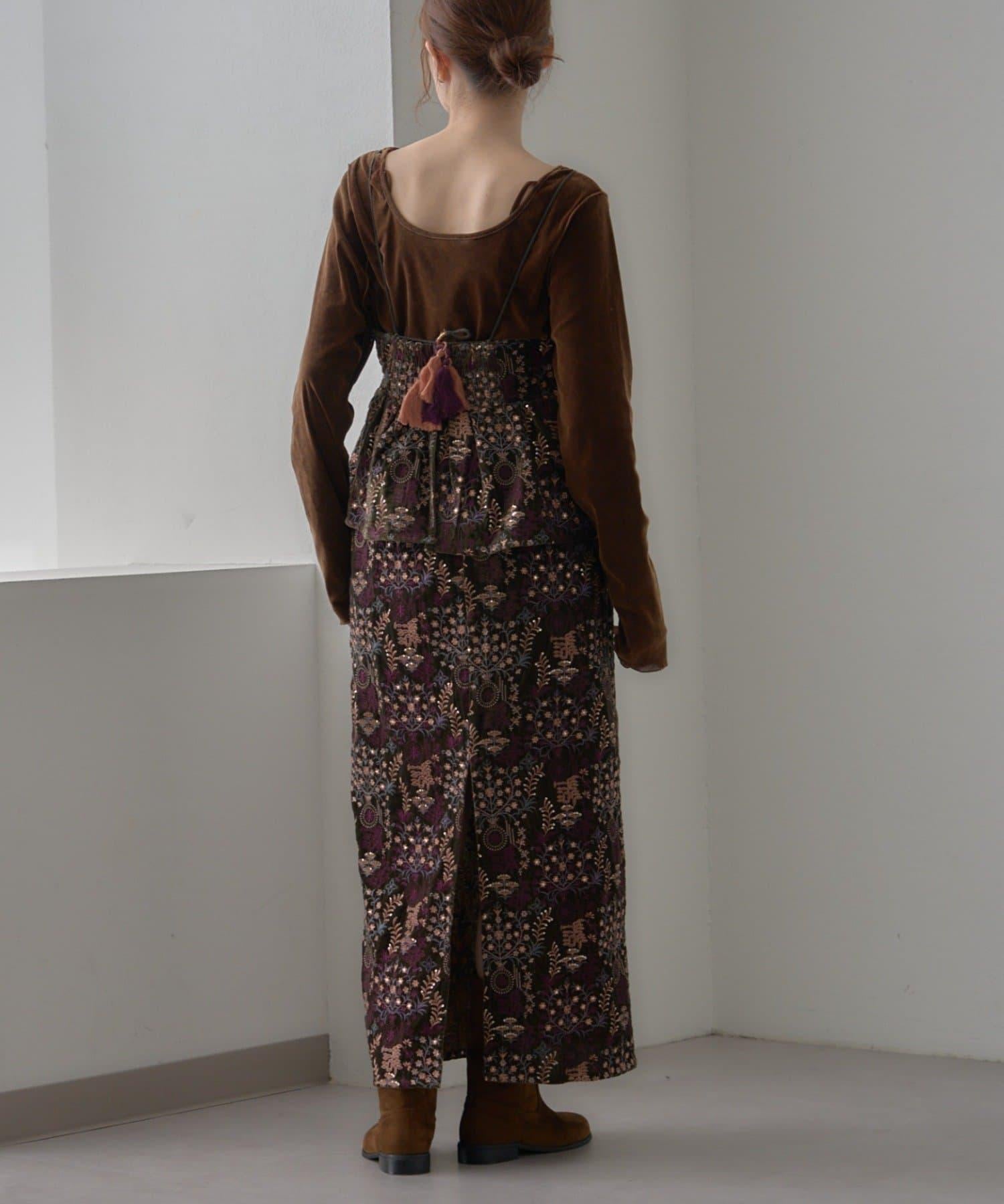 這款吊帶半身裙採用絲絨面料製成,並飾有復古刺繡,極具氣場。
