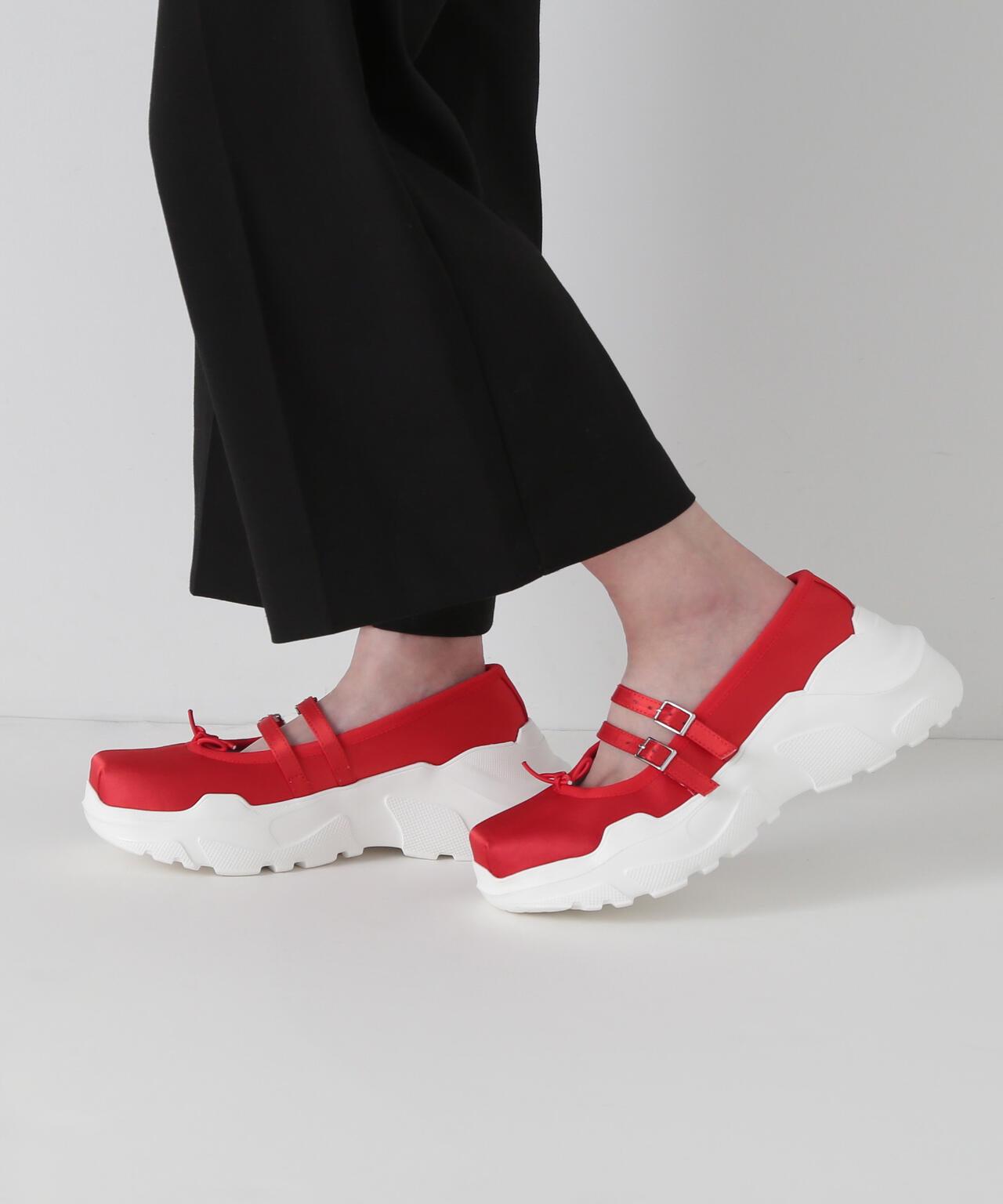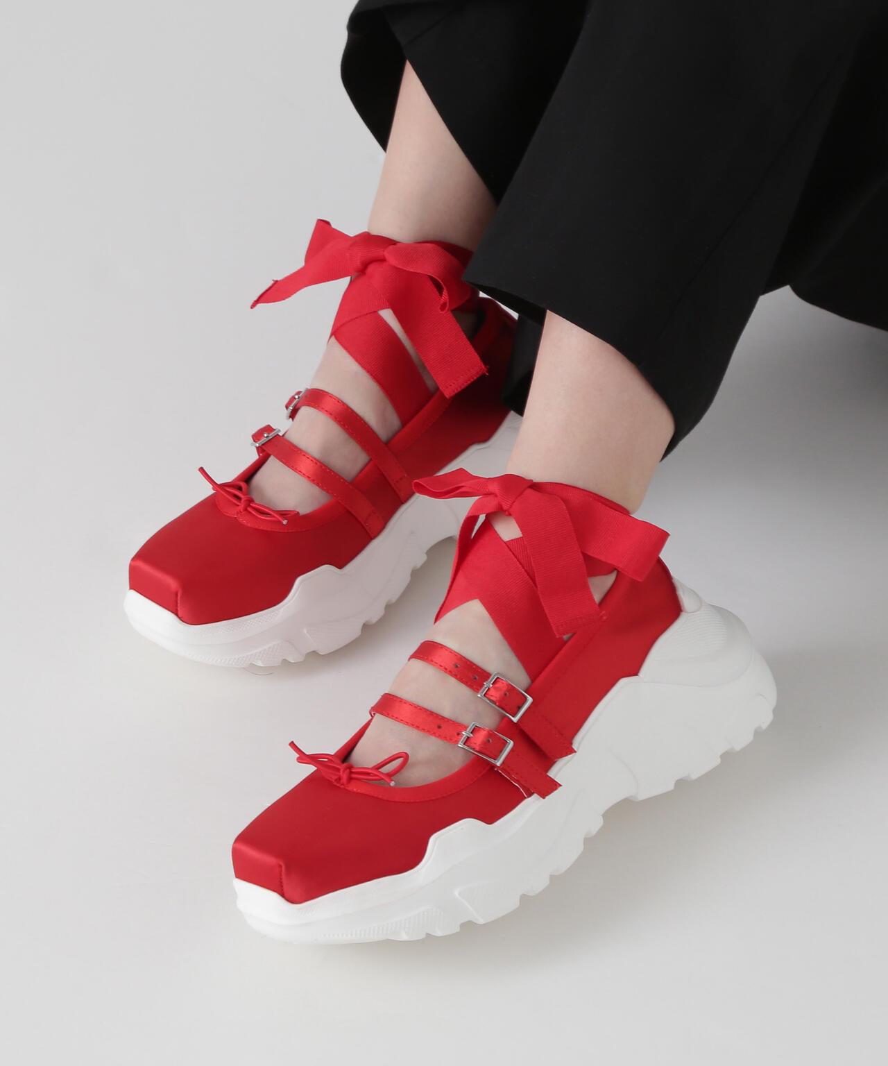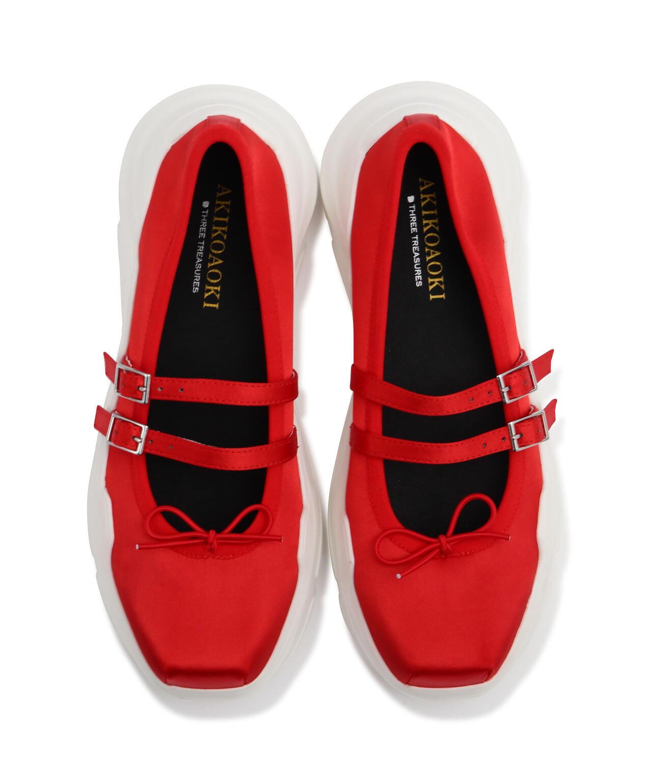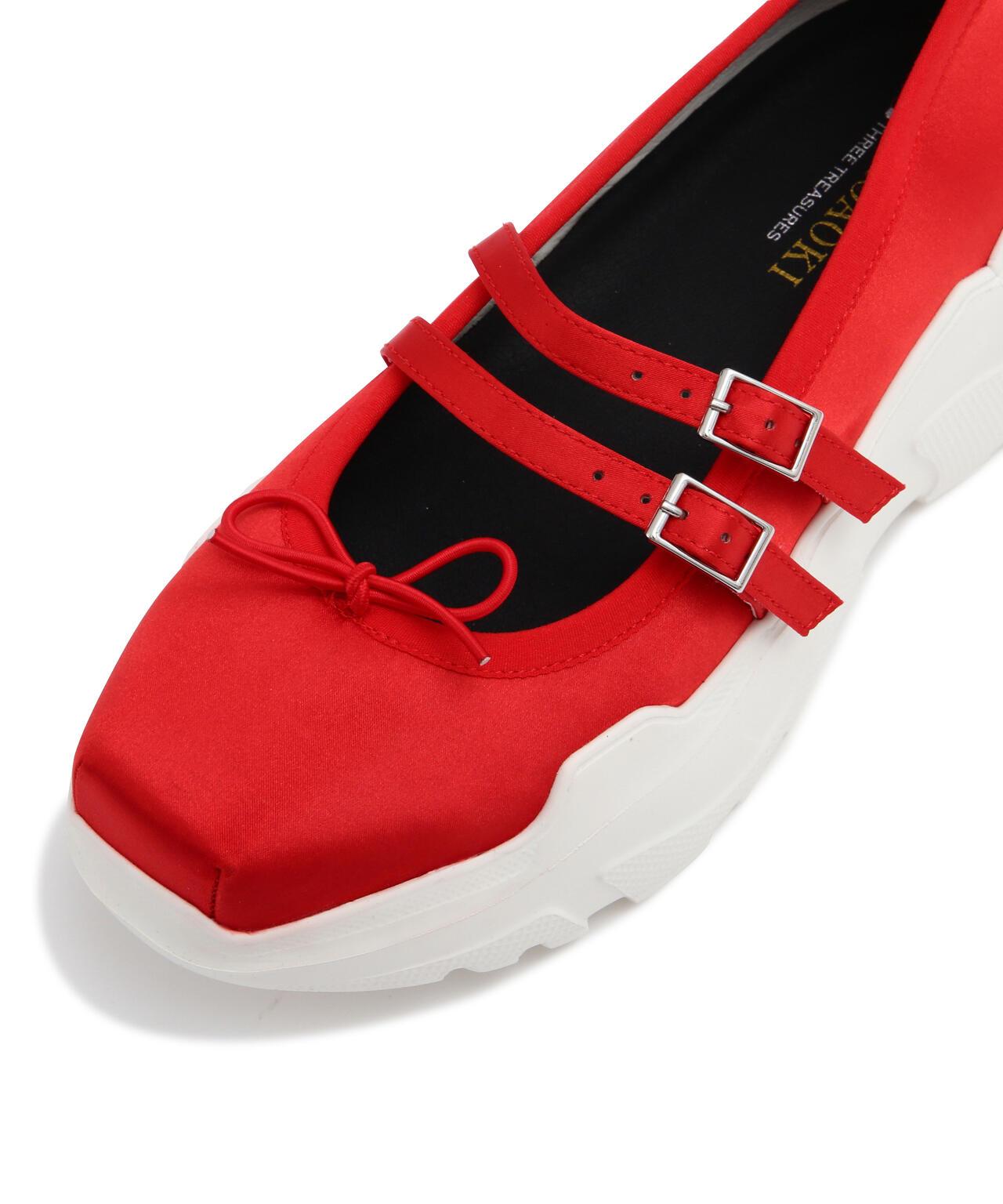 ROYAL FLASH 特別訂製產品吉賽爾系列緞面限量版設計,靈感來自芭蕾舞鞋,方形鞋頭和絲帶細節。緞面材料採用特有的硃紅色編織,其中一根經線或緯線長期漂浮在表面,給人以優雅迷人的印象,是時尚芭蕾舞核心風格的完美搭配。鞋上的絲帶可以取下,以獲得協調的外觀,腳背上的兩條腰帶可以調節合腳程度。