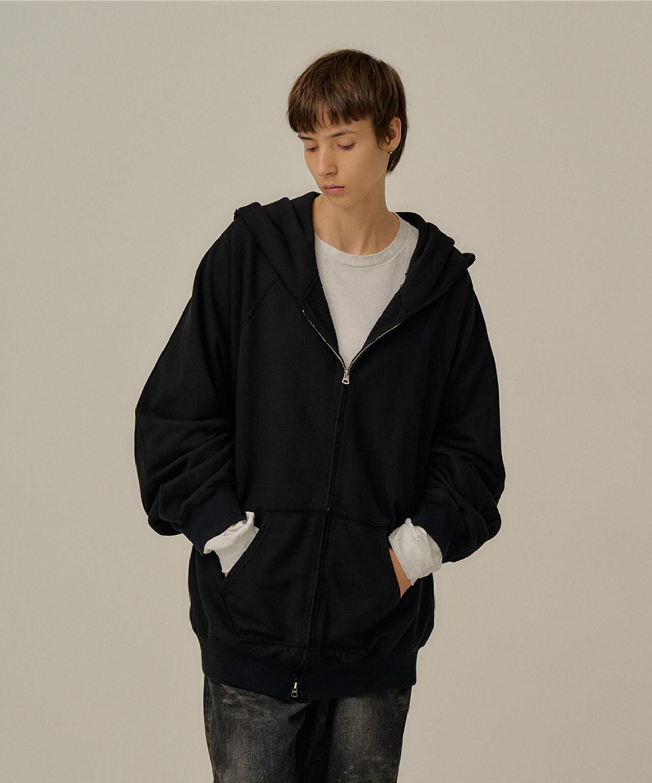 ANCELLM/SWEAT HOODIE COATA 大膽的超大衛衣連帽外套。腋下和衣身寬度處有大量布料,可作為大衣進行多層疊穿,凸顯整體形象的力量感。雙拉鍊可調節前襟開口,外穿夾克、運動衫、針織衫甚至大衣。此外,還可以像穿和服或武士服一樣,在不拉上拉鍊的情況下將門襟深深地重疊在一起,並在腰部繫上腰帶。我們認為,如果能根據自己的想法將它疊穿在很多東西上,造型會變得更加有趣。由於全身所佔面積較大,因此巧妙地將破損處分散開,營造出層次感和立體感。 馬德