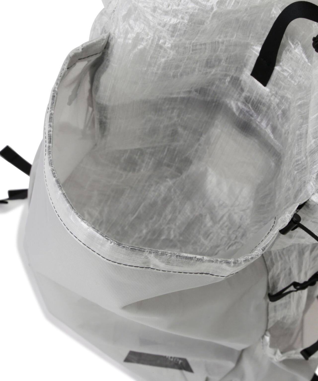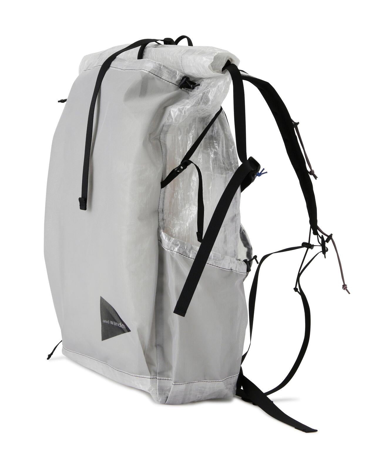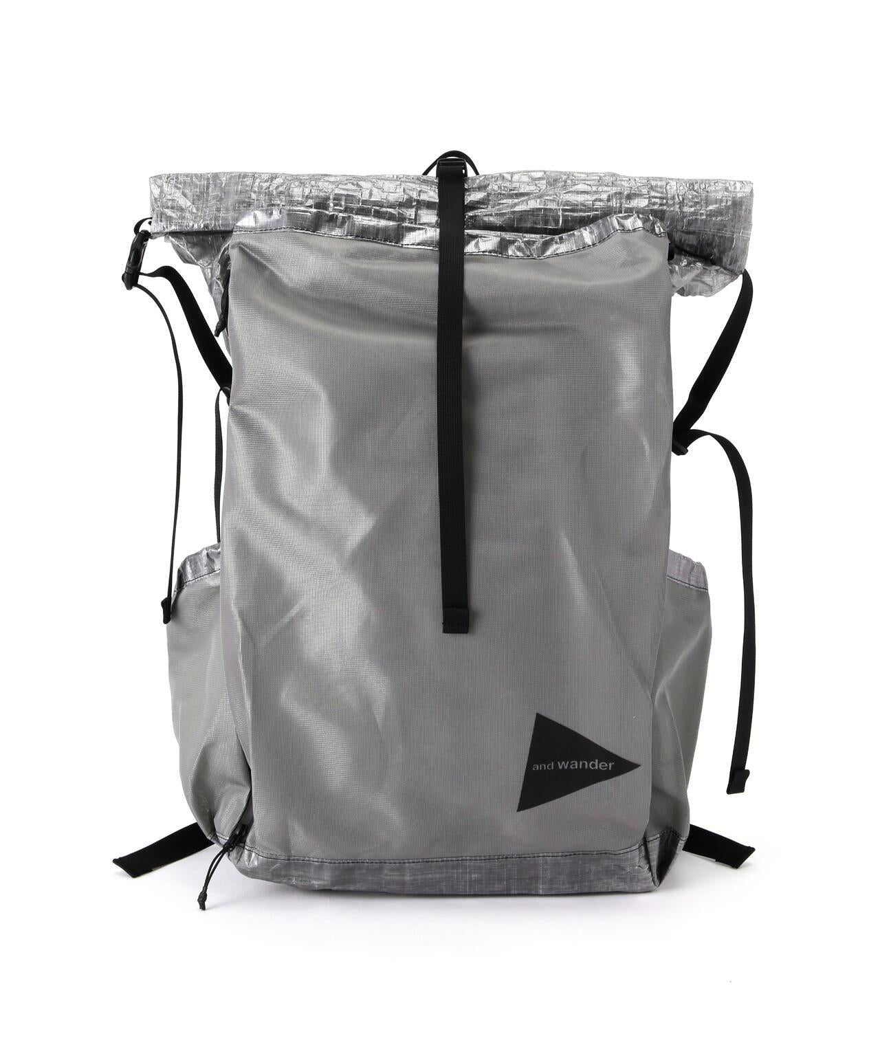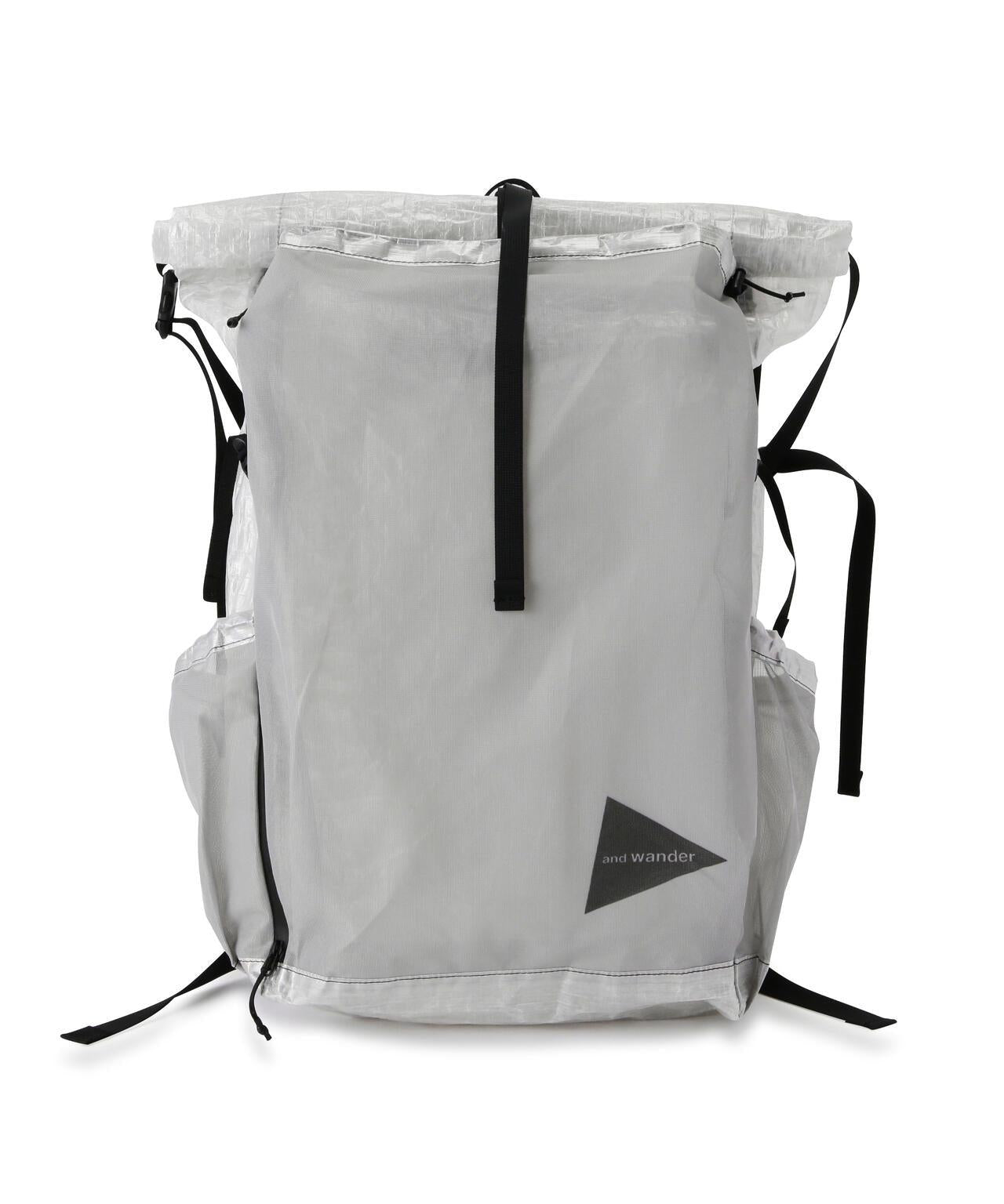 and wander/and wander UL 揹包採用 DyneemaDSM Dyneema 複合織物(原名 Cuben Fibre)。Dyneema 複合織物是由 Dyneema 纖維與 UV 樹脂層壓而成的薄膜,可用於賽艇等的高性能風帆。由於該揹包以輕量化為首要考慮因素,因此如果單點集中受力,可能會刺破或損壞揹包。前袋側面的拉鍊可以讓您進入內部取出物品。實測容量 25-32 升 [和漫步] 風雨無阻。