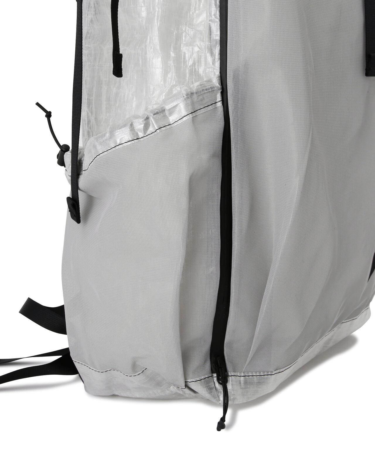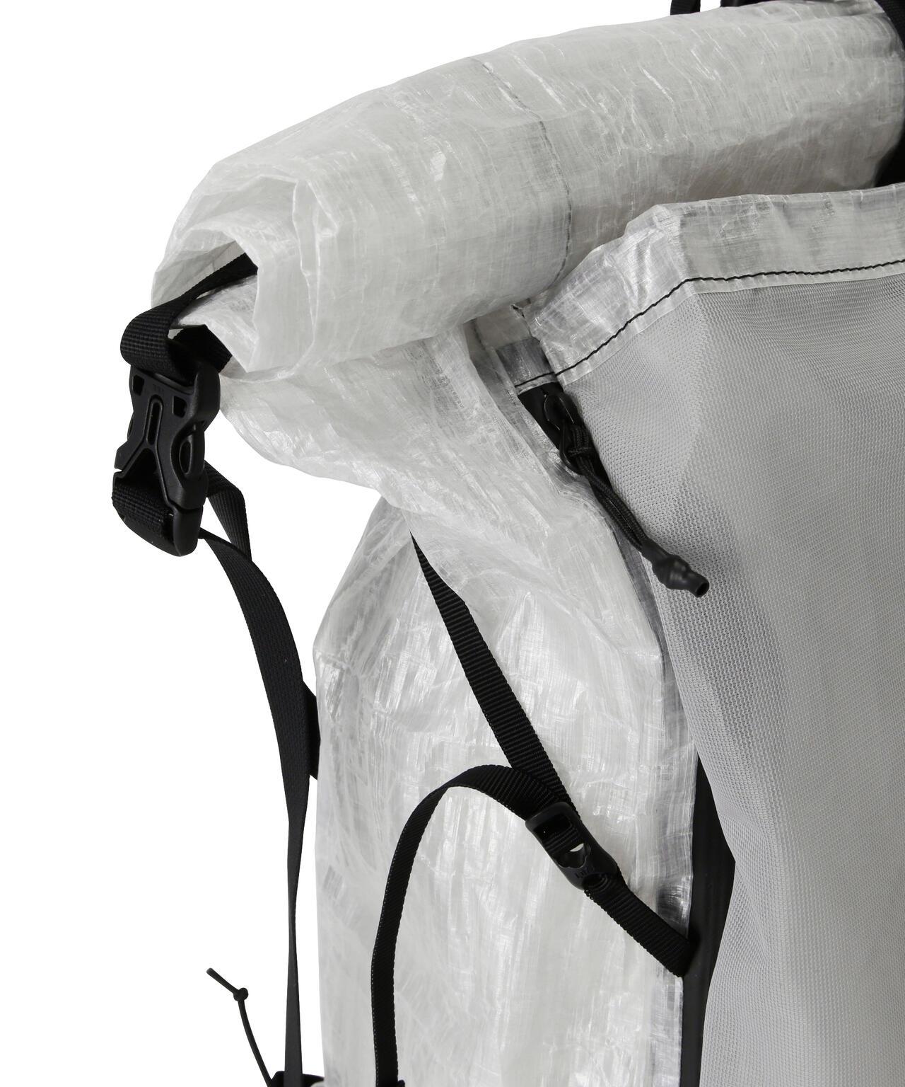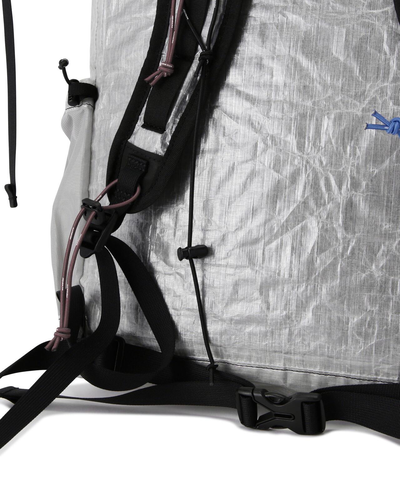 and wander/and wander UL 揹包採用 DyneemaDSM Dyneema 複合織物(原名 Cuben Fibre)。Dyneema 複合織物是由 Dyneema 纖維與 UV 樹脂層壓而成的薄膜,可用於賽艇等的高性能風帆。由於該揹包以輕量化為首要考慮因素,因此如果單點集中受力,可能會刺破或損壞揹包。前袋側面的拉鍊可以讓您進入內部取出物品。實測容量 25-32 升 [和漫步] 風雨無阻。