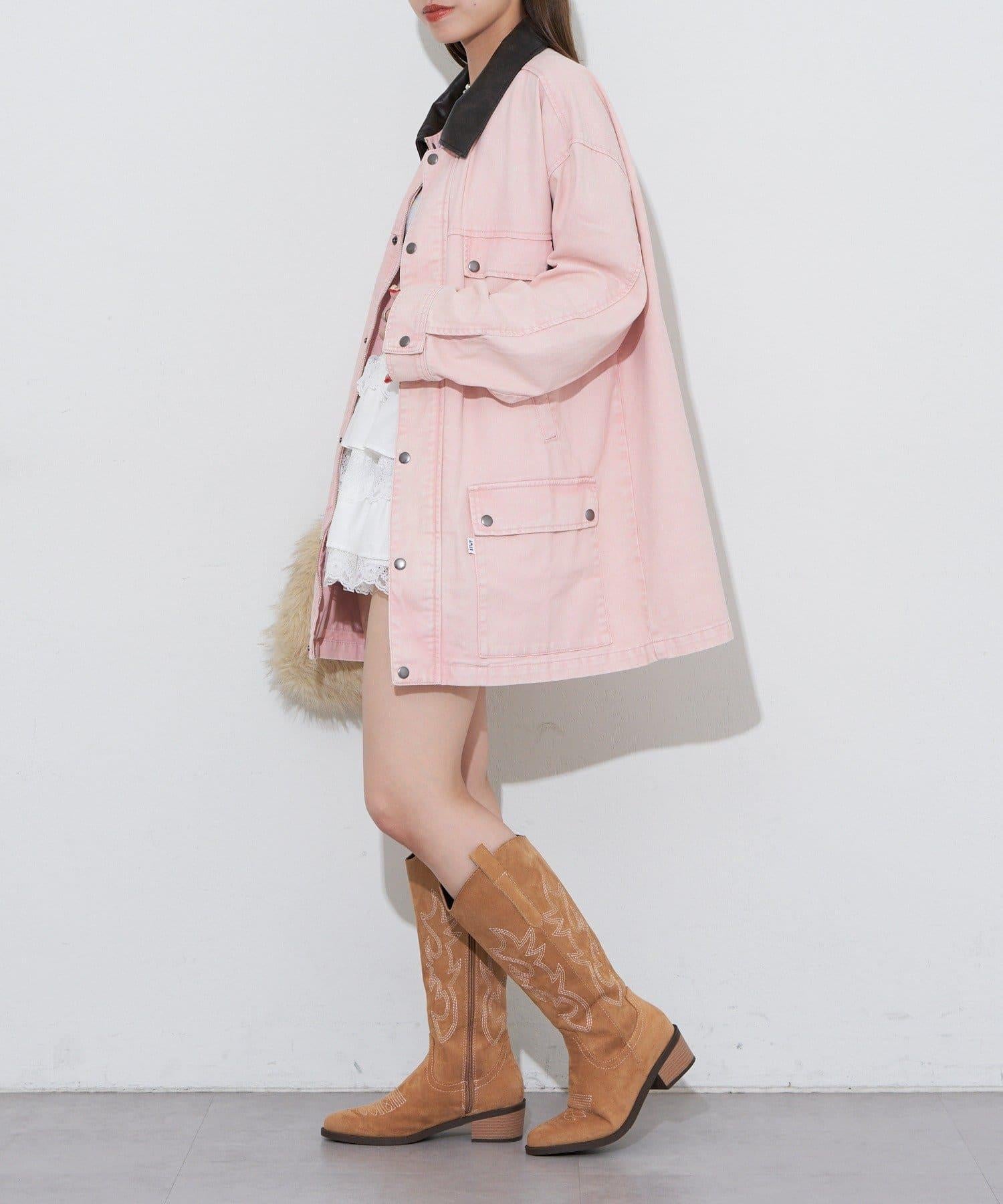 牛仔獵裝夾克,工裝風格,皮質衣領更顯品位。