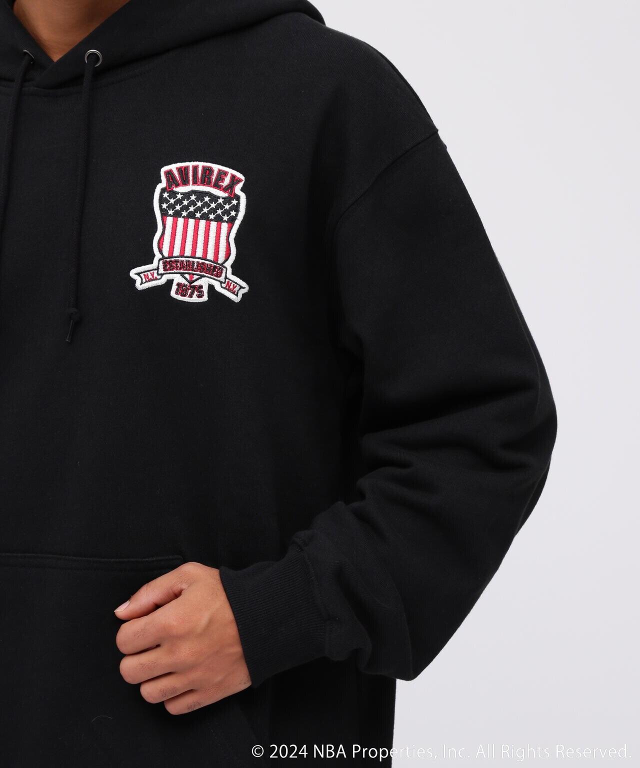 AVIREX 官方商城] 商品名稱:《AVIREX x NBA》HOODIE 由世界👍的 NBA 和 AVIREX 傳統美式休閒風格的 VARSITY LINE 組成的膠囊系列。連帽衫前胸印有球隊標誌和 AVIREX 徽章,後背印有 AVIREX 標誌和球隊圖標,採用羊毛內襯面料製成。