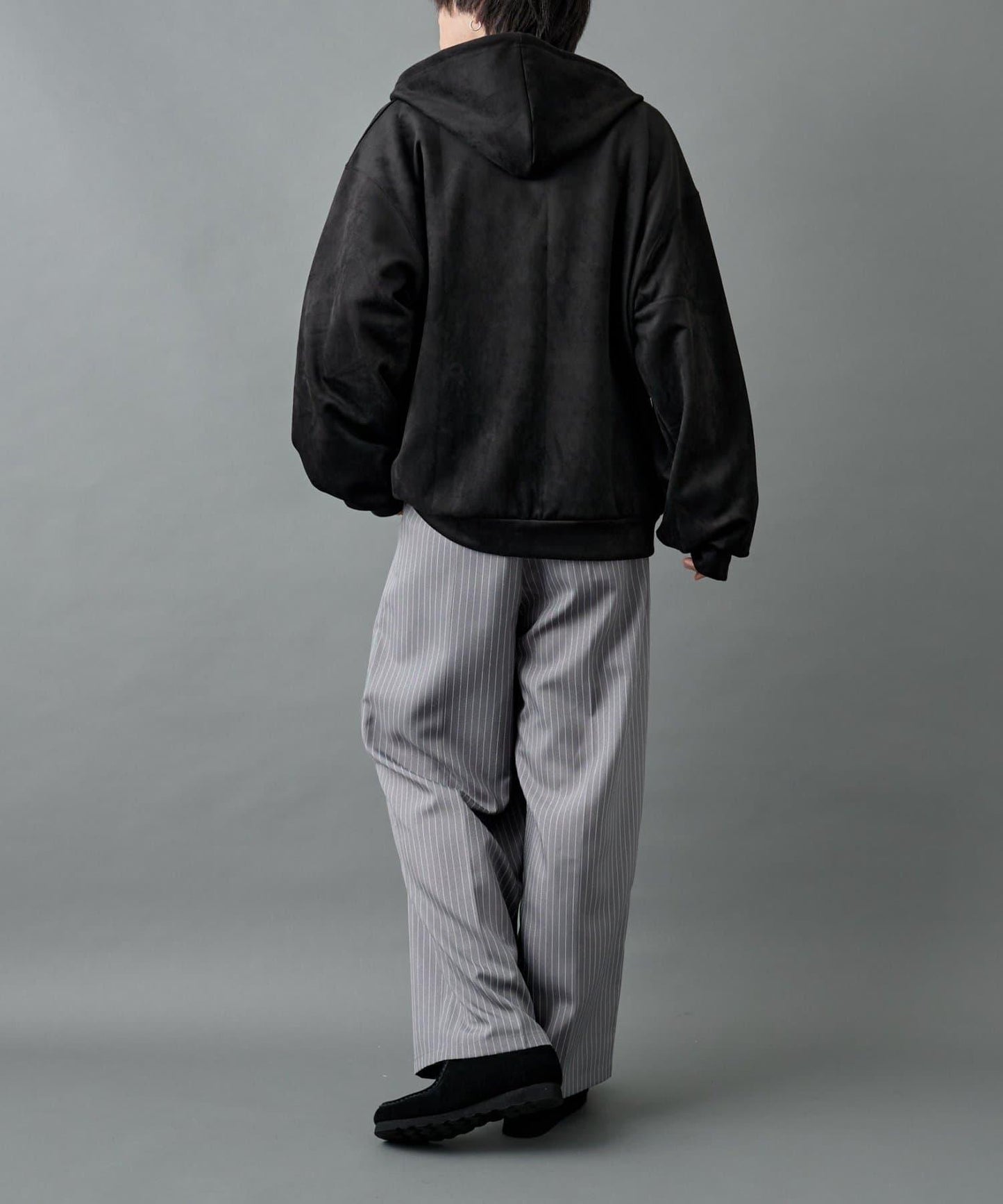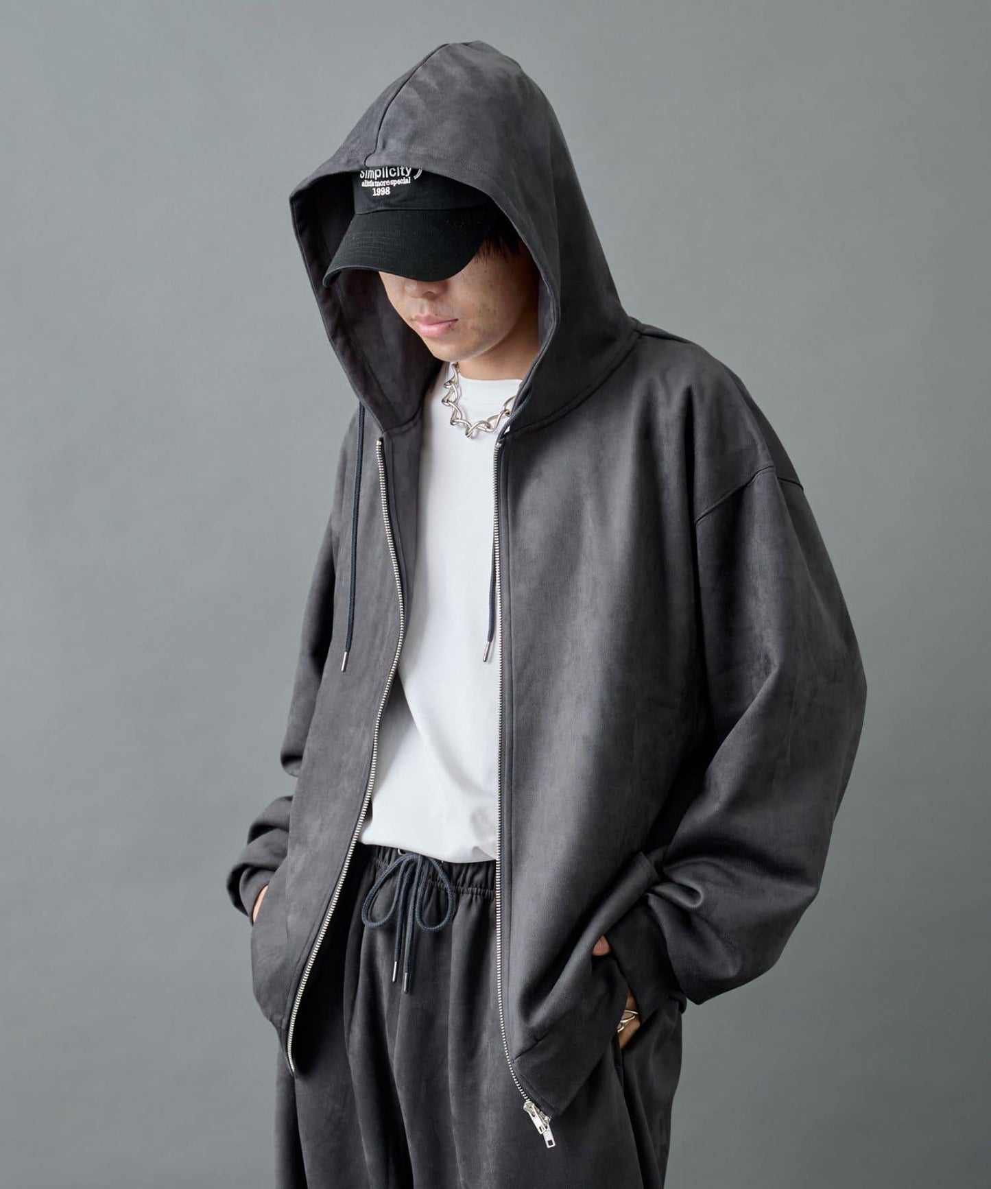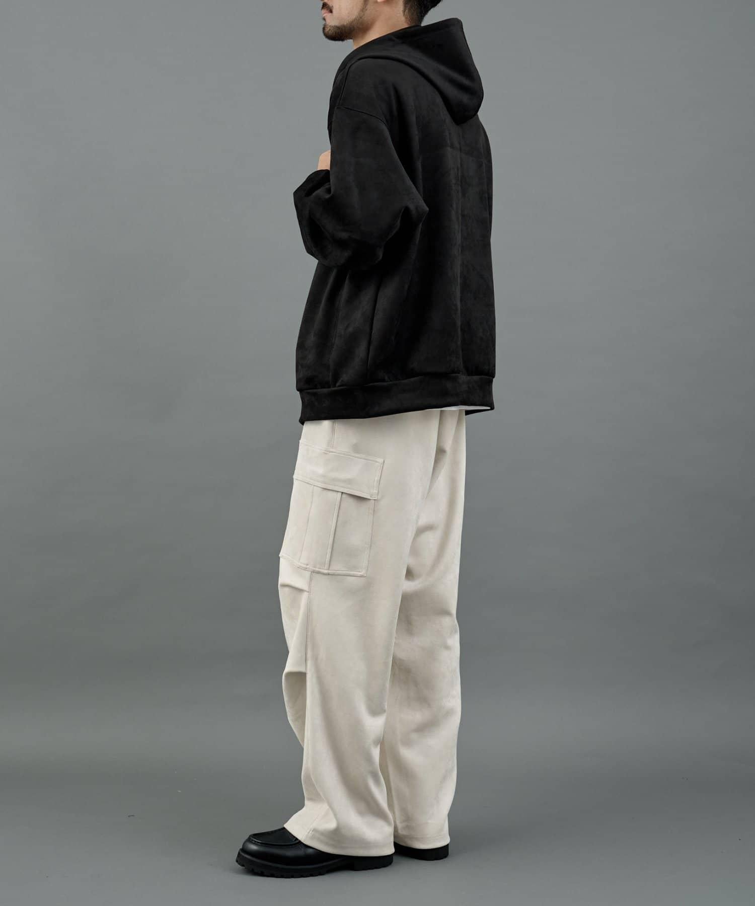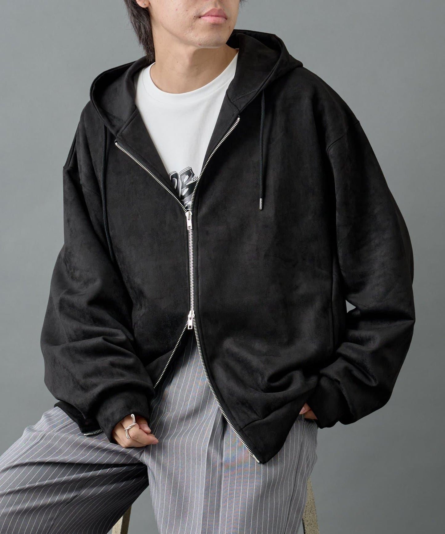 這款連帽衫採用柔軟優雅的合成麂皮(仿麂皮)製成,採用雙拉鍊設計。