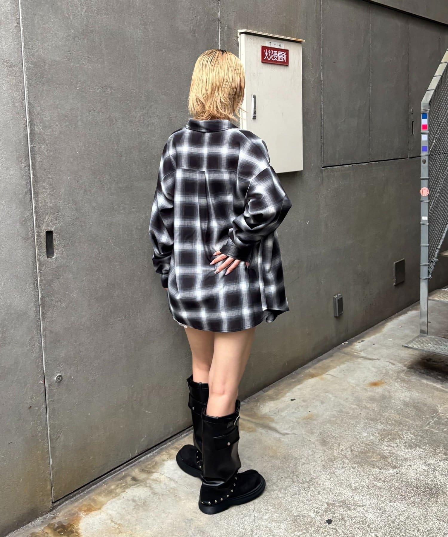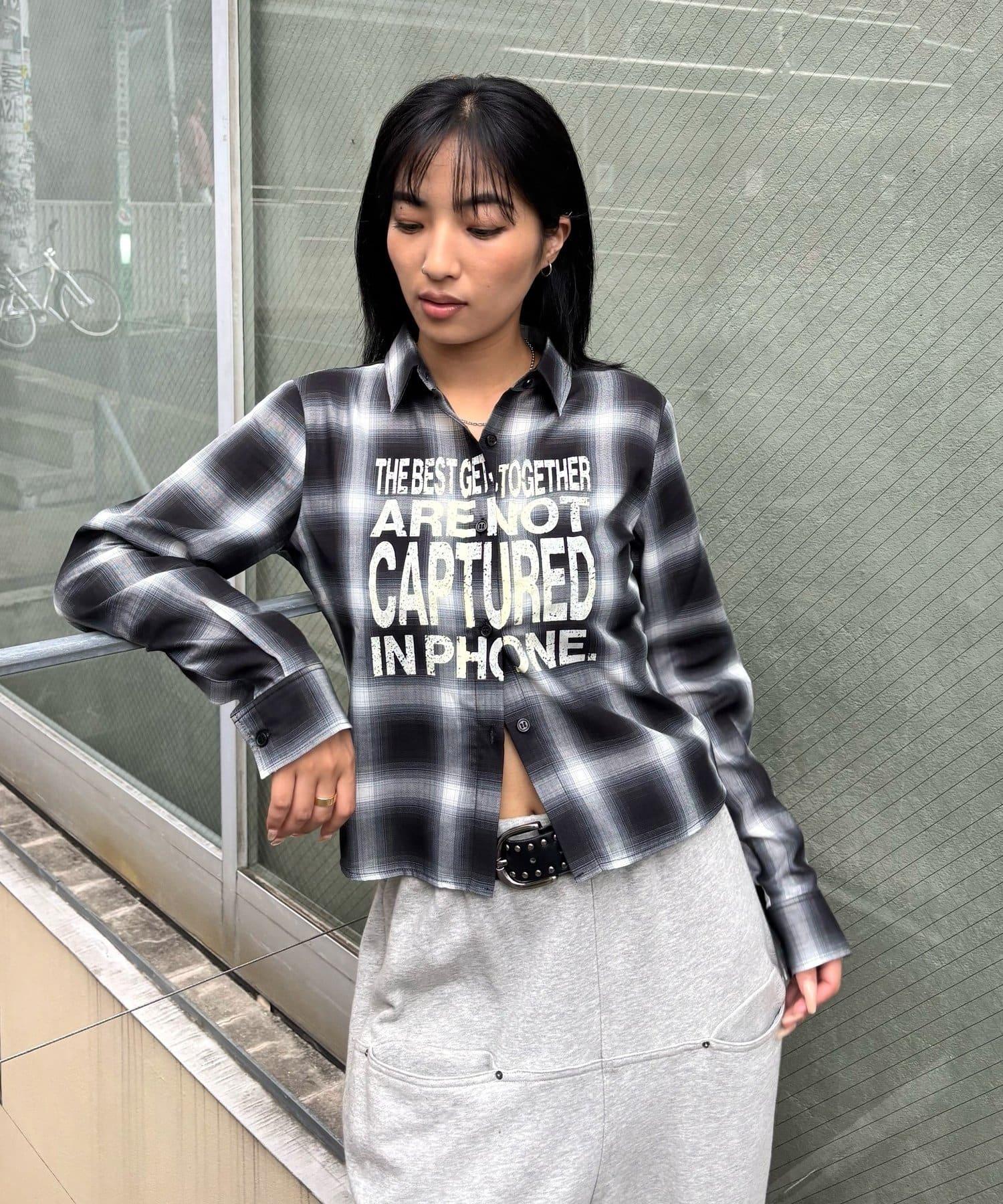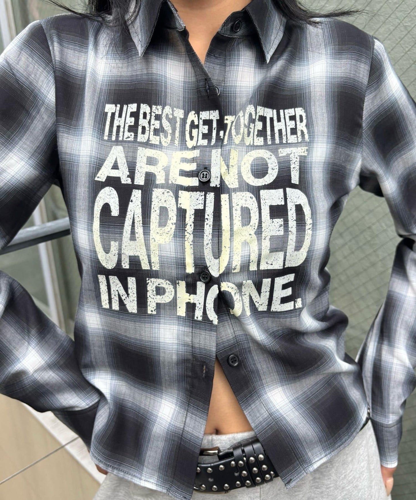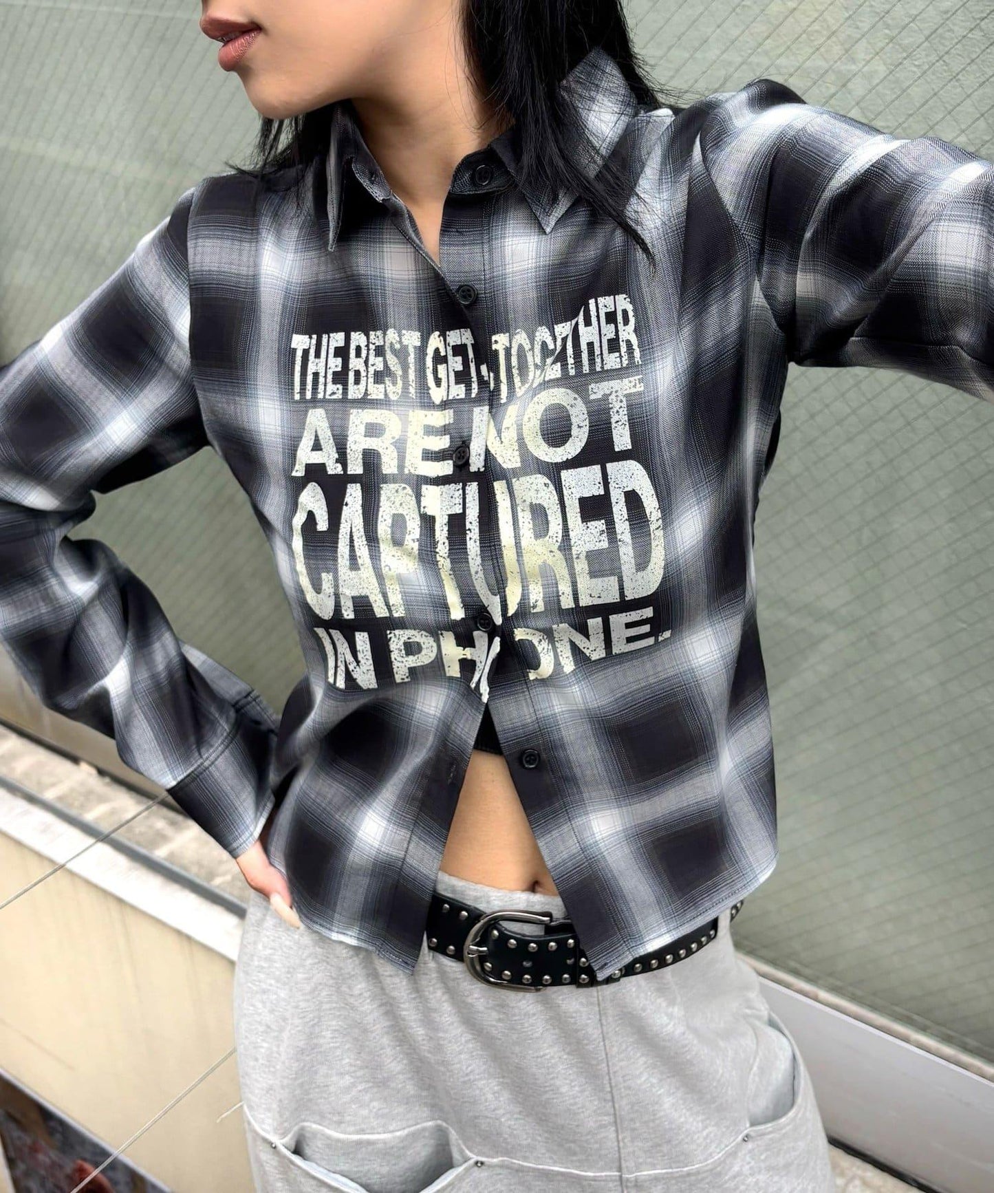 信息印花和棋盤格圖案使這款襯衫成為引人注目的設計。