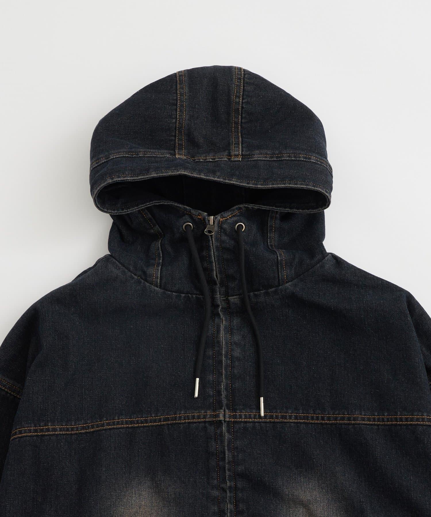 連帽牛仔布罩衫,前襟有拉鍊。