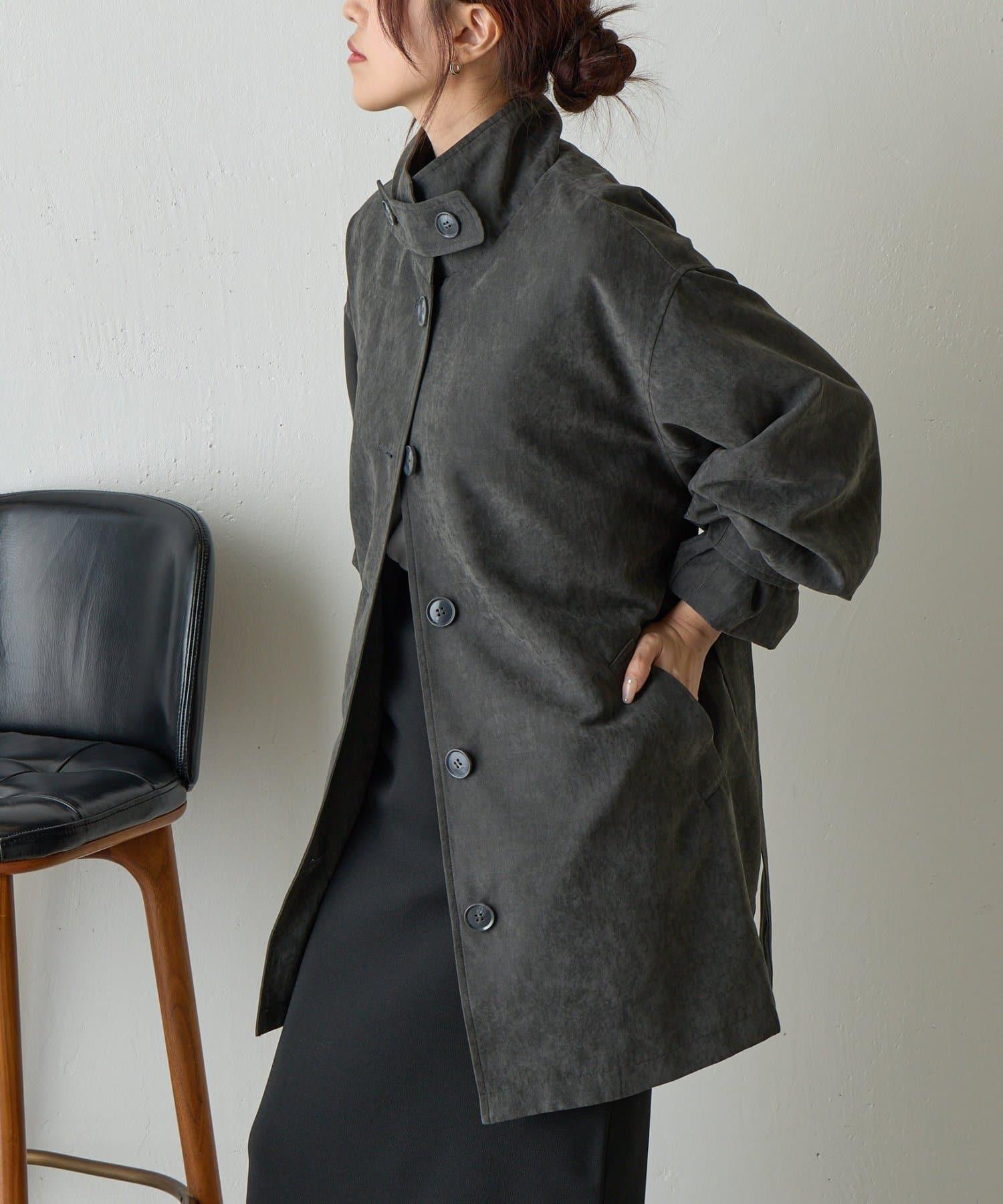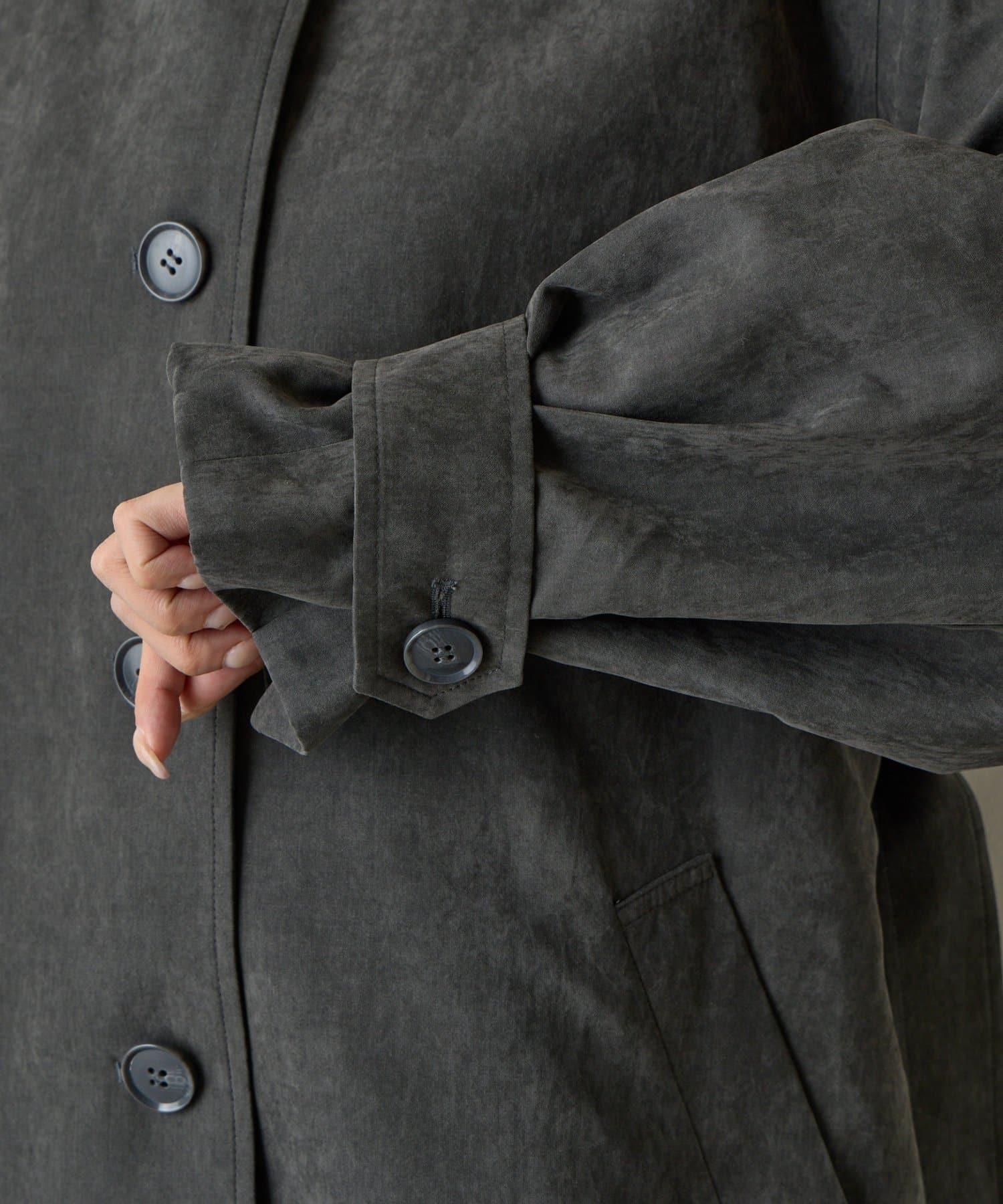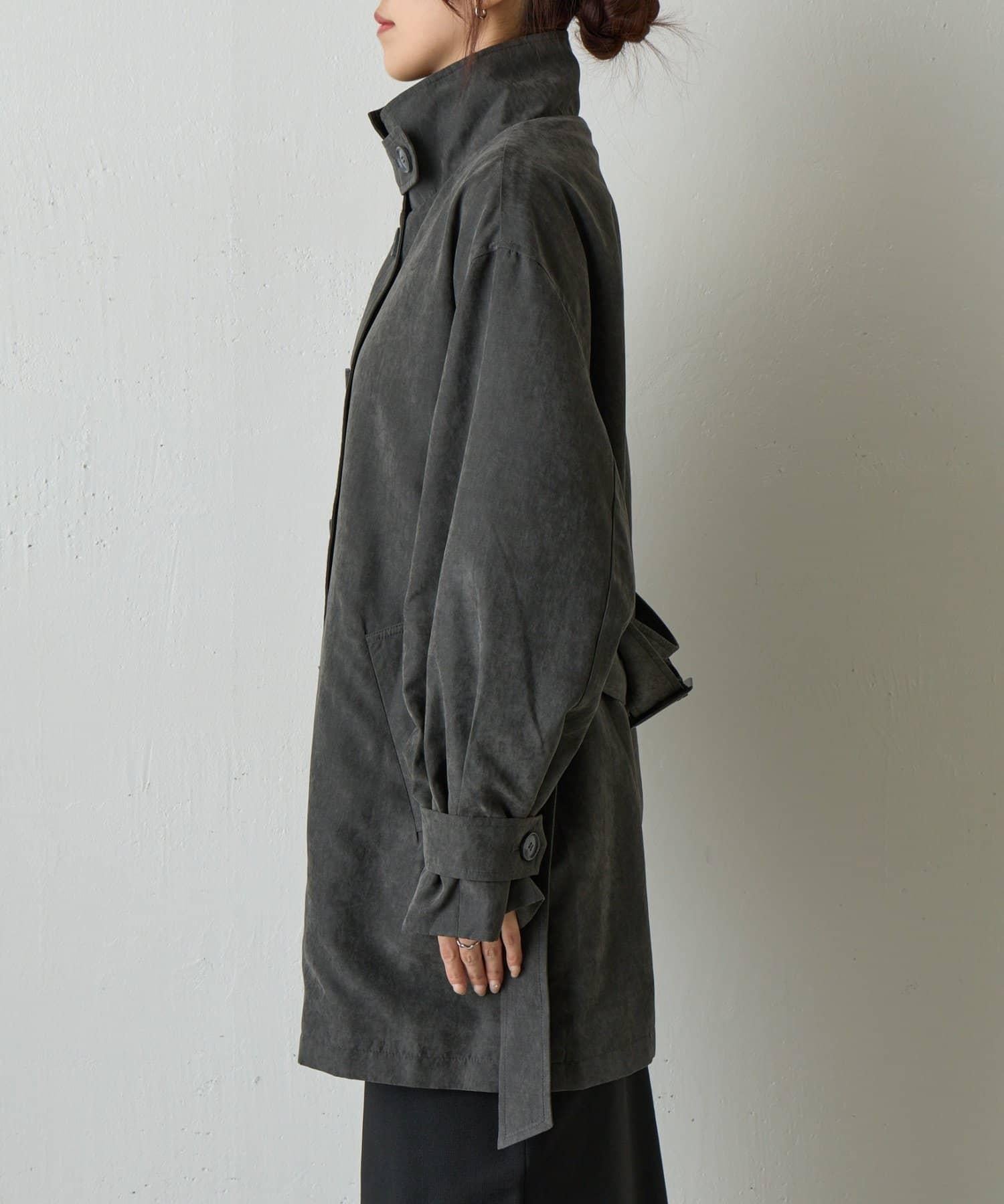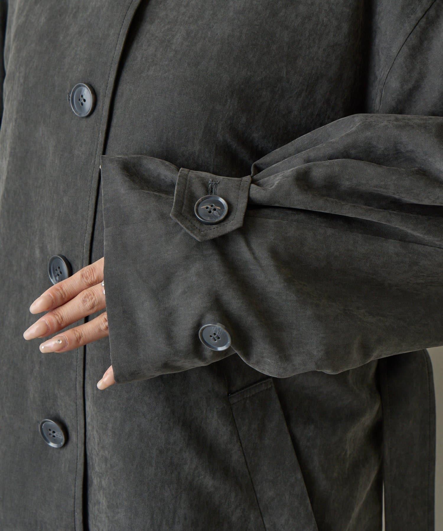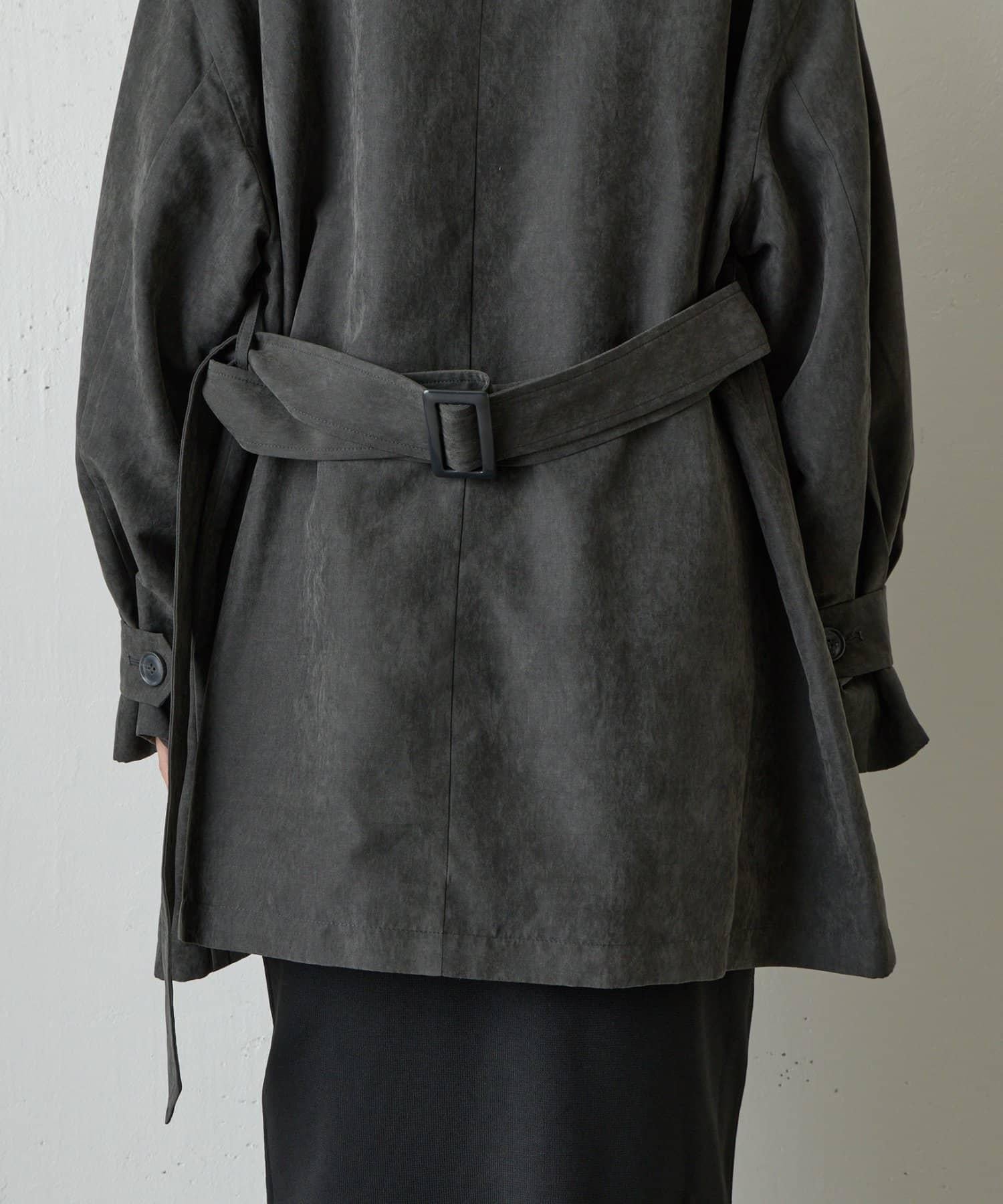 這款中款風衣採用略帶拉毛的桃皮材質製成,具有優雅的光澤和柔軟的觸感。